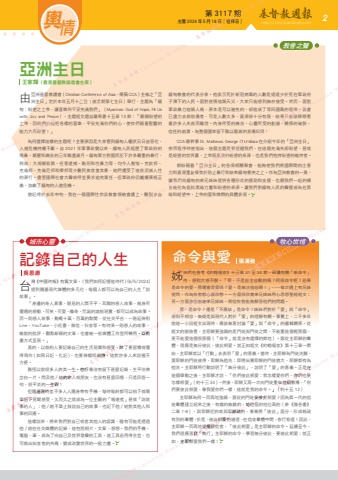 第 3117 期 主曆 2024 年 5 月 19 日(禮拜日) http://ChristianWeekly.net 輿 2情台灣《中國時報》有篇文章,〈我們如何記憶這時代〉(6/5/2024) 提到隨着現代媒體的多元化,每個人都可以為自己的人生「說故事」。「身邊的奇人異事,眼見的人間不平,耳聞的感人故事,親身所遭遇的感動、可笑、可愛、離奇、荒誕的諸般現實,都可以成為故事。而一則感人故事,動輒十萬、百萬的點閱,從社交平台,一路延伸到 Line、YouTube、小紅書、微信、抖音等。有時某一則感人的故事、敏銳的批評、觀點新穎的文章,也會被一些媒體工作室所轉用,以動畫方式呈現。」真的,以前的人要記錄自己的生活見聞和感受,除了要習慣或懂得寫作 ( 如寫日記、扎記 ),也要倚賴照相機,這對許多人來說極不方便。難怪以前很多人終其一生,也好像沒有留下甚麼記錄,生平彷彿空白一片。問及他 / 她的家人或朋友,也沒有甚麼回憶,只是回答一句,很平淡的一生啊!但隨着現時差不多人人隨身帶有手機,每時每刻都可以拍下或簡單記下見聞感受,久而久之就成為一位主觀的「報道者」甚或「說故事的人」;他 / 她不單止敘說自己的故事,也記下他 / 她對其他人和事的回應。這樣說來,將來我們對自己或者其他人的認識,極有可能是透過他 / 她在社交媒體的記錄,這包括相片、文案、感想。我們的手機、電腦、筆,成為了向自己及世界發聲的工具,這工具若用得合宜,也可喚出知音者的共鳴,變成改變世界的一股力量。姊妹們在查考《約翰福音》十三章 31 至 34 節,研讀有關「新命令」時,感到大惑不解。「愛,不是自主自動的嗎?何須命令呢?若果是命令的愛,那還會是愛嗎?愛,是無法強迫啊!」……每次遇上有兄姊提問,作為牧者都心裏欣慰。一方面很欣賞弟兄姊妹用心思想聖經經文;另一方面亦很感謝弟兄姊妹,相信牧者能夠解答他們的問題。愛,是命令?還是「不應該」是命令?姊妹們對於「愛」與「命令」感到不相容,無疑是與現代人對於「愛」的理解有關。事實上,二千多年前這一小段經文出現時,應該無意討論「愛」與「命令」的邏輯關係。從經文的脈絡看,主耶穌要強調的是門徒與門徒之間,不能重這個輕那個,更不能愛這個恨那個(「命令」就是沒有選擇的餘地)。跟從主耶穌的羣體,理應是無分彼此,彼此相愛。就正如經文《約翰福音》第十三章一開始,主耶穌就以「行動」去表明「愛」的意義。當時,主耶穌為門徒洗腳,愛耶穌的門徒彼得,耶穌為他洗;即將出賣耶穌的門徒猶大,耶穌都有為他洗。主耶穌用行動說明了「無分彼此」,說明了「愛」的意義。正是在這個舉動之後,主耶穌才說,「你們彼此相愛;我怎樣愛你們,你們也要怎樣相愛」(約十三34)。然後,耶穌又再一次向門徒重申這個教導,「你們要彼此相愛,像我愛你們一樣,這就是我的命令。」(約十五 12)主耶穌為何一而再地強調,跟從的門徒要彼此相愛?因為第一代的信徒羣體建立起來之後,有錢的無錢的,地位低的地位高的(參《雅各書》二章 1-8),與耶穌近的或與耶穌疏的,漸漸將「彼此」區分,形成親疏有別的羣體,於是,彼此相愛的道理,在信徒羣體中間,愈行愈遠!因此,主耶穌一而再地提醒跟從者,「彼此相愛」是主耶穌的命令。延續至今,我們理應落實「執行」主耶穌的命令,學習無分彼此,要彼此相愛;就正如,主耶穌愛我們一樣!記錄自己的人生 命令與愛 由亞洲基督教議會(Christian Conference of Asia,簡稱 CCA)主催之「亞洲主日」定於本年五月十二日(復活期第七主日)舉行,主題為「緬甸:盼望之上帝,讓喜樂與平安充滿我們」(Myanmar: God of Hope, Fill Us with Joy and Peace)。主題經文選自羅馬書十五章 13 節:「願賜盼望的上帝,因你們的信把各樣的喜樂、平安充滿你們的心,使你們藉着聖靈的能力大有盼望!」為何選擇這樣的主題呢?主要原因是大家看到緬甸人權狀況日益惡化,人道危機持續不斷。自 2021 年軍事政變以來,緬甸人民經歷了軍政府的殘暴、鎮壓和痛苦的三年動盪歲月。緬甸軍方對國民犯下許多嚴重的暴行,例如:大規模殺戮、任意逮捕、酷刑和性暴力等,均令人髮指。克欽邦、克倫邦、克倫尼邦和撣邦等少數民族首當其衝,她們遭受了這些泯滅人性的罪行。儘管國際社會大聲疾呼並要求追究責任,但軍政府仍繼續蔑視正義,加劇了緬甸的人道危機。猶記得於去年中旬,我在一個國際性宗派教會領袖會議上,聽到來自緬甸教會的代表分享。他表示死於新冠病毒的人數是遠遠少於死在軍政府子彈下的人民。面對疫情這類天災,大家只能感到無奈接受。然而,面對軍政暴力這類人禍,原本是可以避免的,卻造成了等同國難的程度。教會已盡力去救助傷者,可是人數太多,資源卻十分有限,結果只能眼睜睜看着許多人失救而離世。肉身所受的痛苦、心靈所受的創傷、關係的破裂、信任的崩潰,為整個國家留下難以磨滅的哀傷記憶。CCA 總幹事 Dr. Mathews George Chunakara 在介紹今年的「亞洲主日」崇拜程序時曾指出,這個主題是要提醒我們,在這個充滿失卻盼望,甚或是絕望的世界裏,上帝既是我們盼望的泉源,也是我們抱持盼望的維持者。期盼藉着「亞洲主日」的各項相關聚會,能夠使我們將國際間的注意力和資源重新聚焦於防止暴行和結束緬甸衝突之上。作為亞洲教會的一員,讓我們向緬甸的弟兄姊妹提供各種形式的援助和支援,也願我們一起的禱告能化為抵抗黑暗力量和盼望