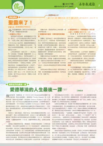 第 3117 期 主曆 2024 年 5 月 19 日(禮拜日) http://ChristianWeekly.net 信 3仰 愛德華滋的人生最後一課 ( 上 )我是約拿單.愛德華滋,於 1703 年 10 月 5 日出生在新英格蘭康乃迪克溫莎鎮。我的父親提摩太.愛德華滋(Timothy Edwards)是一位清教徒牧師,我的外祖父所羅門.斯托達德(Solomon Stoddard)也是一位清教徒牧師,他於 1643 年出生在麻薩諸塞州知名的家族,在哈佛學院接受了良好的聖經教育,1672 年成為了北安普頓(Northampton)的牧師,他在那裏牧養和佈道五十五年,成為當時新英格蘭地區倍受尊敬的牧師之一。我生長在一個宗教虔誠的家庭,幼年的家學熏陶對我的信仰和學術生涯產生了深遠的影響。我家有十一個兄弟姐妹,我排行老五。我家的飯廳就是我的學校,在父親的指導下,我從小就學習聖經和神學,並且在十三歲入讀耶魯學院,在那裏發展了我的學術天賦和對基督教信仰深切的體會。1731 年,我從耶魯學院畢業,並繼續進修神學。1734 年,我獲得神學碩士學位,並開始在教會中傳道。當我進入耶魯學院的時候,學院還是一所相對年輕的學府。大家都知道耶魯學院 (原名是康乃迪格學院)於 1701 年在亞伯拉罕·皮爾森牧師的牧師宅中開課,初衷是為了培養新英格蘭地區的牧師和社區領袖,當時的課程主要包括神學、希伯來文、拉丁文和哲學等課程。我們學院的學術氛圍主要受到清教傳統的影響,但是學生們在這裏不僅學習聖經和神學的知識,而是被培養成為教會領袖和社區中的道德榜樣。然而,學院的信仰傳統也與時代的潮流互相地激盪,我所學習的科目也開始逐漸擴展和多元化。儘管宗教教育仍然是主課,但學院開始引入更廣泛的學科,如自然科學、文學和歷史等。我在清教徒的文化中長大,又是一位牧師的兒子,從小就接觸到宗教教義。儘管如此,我心中仍然有一個懷疑的黑洞,特別是關於加爾文主義的教義中關於上帝主權宣稱。我將這種教義描述為一個「可怕」的概念,並對上帝選擇一些人得救而拒絕其他人充滿異議。在我的信仰轉變之前,我經歷了兩次顯著的信仰覺醒時期。第一次是在父親的教會中發生,那次經驗讓我全身心投入事奉的職責,每天多次祈禱,並在父親的教誨中找到了一種喜悅。然而,我後來以懷疑的心態回顧這些經歷,懷疑這是否真正得救的標誌。我的信仰轉變的關鍵時刻是在 1721 年。那是我默想這句聖言:「但願尊貴、榮耀歸於那不能朽壞、不能看見、永世的君王—獨一的神,直到永永遠遠!」(提前一 17)我經歷了一種「令人愉悅的信念」,這導致我對上帝神聖的榮耀有了深刻的感受。這種經歷與我以往所感受到的任何事物都不同,這使我充滿了對上帝的渴望,並且渴望永遠與祂同在。在這一經歷之後,我的世界觀發生了變化。我開始自然的在各個方面看到神聖的榮耀,並感受到上帝存在是那麼平靜和甜蜜。這份喜悅取代了我對上帝主權的異議。我表達說,上帝的卓越、智慧、純潔和愛在我周圍的一切事物中彰顯。我的信仰更新不僅僅是情感上的經歷,而是對上帝恩典和主權嶄新的理解和欣賞。我對基督的工作有了更深刻的認識,並渴望成為一個完全的基督徒,深入探討自由恩典和基督救贖的教義。我的早期宗教經歷,儘管強烈,但並沒有導致真正的轉變。只有通過上帝的工作,我才經歷了真正的轉變。這種轉變不是基於人的行動或情感,而完全是上帝恩典的結果。聖靈降臨主日釋經講道陳曉東清教徒們的最後一課徒二 1-21;詩一零四 24-34、35 下;羅八 22-27;約十五 26-27、十六 4 下 -15聖靈來了!今天是聖靈降臨節。我們可以從約翰福音的記述,對聖靈有更深的認識:1) 聖靈自父子而出我們透過尼西亞信經,宣認聖靈是從父子而出。事實上,在今天的福音經文開首已告訴我們:「但我[耶穌]要從父那裏差保惠師來」(約十五 26a)由此可見,聖靈是耶穌基督從父那裏差來的。同時,聖靈也是從父出來的:「就是從父出來的那真理的靈」(約十五 26b),聖靈是從父出來。上帝向我們啟示,祂是三而一,一而三的上帝。父的創造,子的救贖,聖靈的保惠,三一上帝的恩典臨在我們的身上。我們現未能對三一上帝有清晰的認識。但祂作在我們身上的,叫我們曉得上帝對我們的愛是何等廣闊,祂對我們的照料是何等周到。一切都由上帝創造,上帝所造的何其多!全地遍滿祂所造之物。上帝張手,他們就飽得美食。收回他們的氣,他們就死亡,歸於塵土(詩一零四 28-29)。萬物之存活,都在祂一言間。但三一上帝,卻向渺少的人傾倒恩典,聖子付出自己的生命,聖靈以人為居所作人的保惠師。聖靈求祢來,幫助我們明白上帝的恩典,幫助我們報效萬一。2) 聖靈委身於基督:來要見證和榮耀基督聖靈來,並非為自己。祂來是要為耶穌作見證(約十五 27)。很多時候,我們想到基督已升天,我們不像初期教會的信徒,能看見基督的肉體,於是我們與基督的關係,總像欠缺一份親密似的。其實不然。事實上,基督在聖靈的見證中,藉着聖道和聖禮,臨到我們當中。聖靈幫助我們,我們雖然沒有見過基督,卻因祂的見證,我們深愛基督。聖靈也並非為自己的榮耀而來。祂原本與父子同樣受尊敬,受榮耀。聖靈來卻為要榮耀基督,祂要把從基督領受的向我們傳達(約十六14)。但祂並非透過甚麼奇蹟異事,祂本有如此能力,但祂卻以傳達基督從所領受的來榮耀基督。我們也被命令要為主作見證。我們沒有能力可顯,卻是傳遞聖靈從