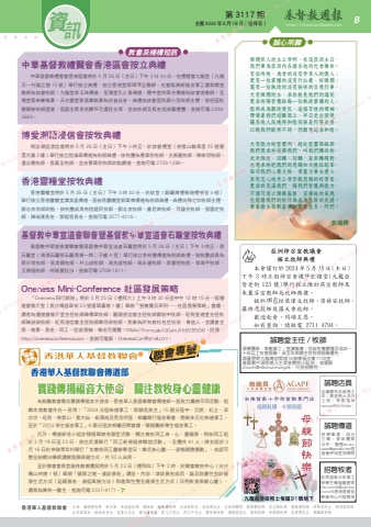 香港華人基督教聯會 主席:鍾健楷牧師 副主席:余英嶽牧師 總幹事:陸幸泉牧師 出版部部長:吳思源先生 出版部顧問:翁傳鏗牧師 李志剛牧師 張振華牧師 許朝英先生 胡明添牧師 出版部委員:植栢燊先生 吳業立先生 蘇永權先生 黃文江先生 許立中先生 鄺偉衡牧師 關銳煊先生 梁銘牧師 李鴻標牧師 吳渭濱先生 關鎮威牧師第 3117 期 主曆 2024 年 5 月 19 日(禮拜日) http://ChristianWeekly.net 資 8訊教會及機構短訊中華基督教禮賢會香港區會按立典禮中華基督教禮賢會香港區會將於 5 月 26 日(主日)下午 3 時 30 分,在禮賢會九龍堂(九龍又一村達之路 12 號)舉行按立典禮,按立香港堂周國權宣教師、社會服務部福音事工鍾紫嫻宣教師為該會牧師;九龍堂李玉珠傳道、荃灣堂孔志豪傳道、禮中堂林舜芳傳道為該會宣教師;荃灣堂黃劍峯執事、天水圍堂單基樂執事為該會長老。典禮由該會區牧廖小茵牧師主禮,前任區牧鍾健楷牧師證道,區副主席李兆麟長老擔任主席,並由牧師及長老組成襄禮團。查詢可電 2304-3663。博愛潮語浸信會按牧典禮博愛潮語浸信會將於 5 月 26 日(主日)下午 3 時正,於該會禮堂(慈雲山毓華里 22 號嘉喜大廈 2 樓)舉行按立陸滿華傳道為牧師典禮。按牧團為曹偉彤牧師、文展圖牧師、陳家明牧師、潘志聰牧師、張萬全牧師,並由曹偉彤牧師訓勉講道,查詢可電 2726-1286。香港靈糧堂按牧典禮香港靈糧堂將於 5 月 26 日(主日)下午 3 時 30 分,於該堂(銅鑼灣禮頓道禮頓里 6 號)舉行按立香港靈糧堂譚美盈傳道、茘枝角靈糧堂郭偉傑傳道為牧師典禮。典禮由陳定邦牧師主禮,劉志良牧師訓勉,按牧團成員有陸建民牧師、劉志良牧師、盧君俠牧師、黃靈芳牧師、張國定牧師、陳瑞漢長老、鄧經恩長老。查詢可電 2577-4216。基督教中華宣道會聯會暨基督教中華宣道會石籬堂按牧典禮基督教中華宣道會聯會暨基督教中華宣道會石籬堂將於 5 月 26 日(主日 ) 下午 3 時正,假石籬堂(葵涌石籬邨石籬商場一期二字樓 A 室)舉行按立李裕豐傳道為牧師典禮。按牧團成員為蔡少琪牧師、張美薇牧師、林志成牧師、馮兆成牧師、周永健牧師、李嘉明牧師、李海平牧師、王德福牧師、何敬賢牧師。查詢可電 3708-1411。Oneness Mini-Conference 社區發展策略「Oneness 同行網絡」將於 5 月 25 日(禮拜六)上午 9 時 30 分至中午 12 時 15 分,假播道會雅斤堂(長沙灣昌華街 23 號富華廣場 1 樓)舉辦「宣教實況系列──社區發展策略」會議。講者為播道會雅斤堂主任牧師陳傳華牧師、觀潮浸信會主任牧師鄭佑中牧師、旺角宣道堂主任牧師陳淑娟牧師、旺角浸信會主任牧師陳明泉牧師。對象為所有教牧包括牧師、傳道人、堂議會主席、執事、長老、同工、信徒領袖,報名可瀏覽:https://forms.gle/GiGamjXfd9286tSi6,詳情:http://onenessconference.com,查詢可電郵:[email protected]。資訊憐憫世人的主上帝啊,在這亞洲主日,我們要為亞洲內各國各地的元首禱告。有些時候,為首的沒有作眾人的僕人;更有一些掌權的沒有行公義、好憐憫;還有一些執政的沒有按祢的旨意行事,大有憐憫的主,求祢赦免他們的過犯,更求祢賜智慧給每一位執政掌權的人,能夠成為勤政愛民、造福百姓的領袖,帶領着我們迎難而上,早日走出困境,讓各地人民曉得和睦同居是何等美善,以致我們縱然不同,仍願意追求和睦。大有能力的聖靈啊,趁此聖靈降臨節,我們懇求祢復興我們,叫我們轉向祢,天天悔改,回轉、回轉,直至轉得對;也懇求祢把我們的恩賜如火挑旺起來,保守我們心裏火熱,常盡力事主愛人,至死忠心地作上帝百般恩賜的好管家;更求祢充滿我們,賜我們智慧與能力,不僅可用口傳揚基督,宣揚祂的美德,也能藉我們的好行為成為基督的見證。奉靠救主耶穌基督的寶貴聖名。阿們!李鴻標誠心所願為鼓勵教會聯合實踐傳福音大使命,香港華人基督教聯會傳道部一直致力籌辦不同活動,組織本港教會作合一見證。「2024 分區佈道事工:耶穌是救主」15 個分區中,元朗、紅土、深水埗、旺角、慈雲山、黃大仙、新蒲崗及秀茂坪區,相繼舉行福音聚會,開展多元化佈道事工。至於「2024 學生福音事工」6 個分區亦相繼召開會議,積極籌辦學生福音事工。此外,傳道部各小組亦積極舉辦各類型活動,關注教牧同工身、心、靈健康。例如同工組於 3 月 19 日至 23 日,前往武漢舉行「同工新春退修聯誼活動」,全團共 41 人;婦女組於 3月 18 日於突破青年村舉行「女教牧同工靈修學習日:樂活身心靈──姿態調整運動」,由認可整全結構治療師講解筋膜保健方式,共 50 人出席。至於聯會會員堂退休教教團契將於 5 月 23 日(禮拜四)下午 2 時,於聯會教牧中心(尖沙嘴山林道 1 號)舉辦「健康之道-漫談衰老」講座。內容:淺談衰老成因,論及防護性金齡健康生活方式(延緩衰老、減低風險方法)和進取性整全健康生活方式(日用飲食保健心靈),講員為陳崇一醫生,查詢可電 2337-4171。師陳淑娟牧師、旺角浸信會主任牧師陳明泉牧師。對象為所有教牧包括牧師、傳道人、堂議會主席、執事、長老、同工、信徒領袖,報名可瀏覽:https://forms.gle/GiGamjXfd9286tSi6,詳情:http://onenessconference.com,查詢可電郵:[email protected]。聯會專號 香港華人基督教聯會傳道部實踐傳揚福音大使命 關注教牧身心靈健康誠聘堂主任/牧師領導團隊、策劃事工、宣講教導、信徒牧養關懷及培訓。十年以上牧會經驗,具