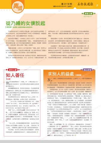 第 3118 期 主曆 2024 年 5 月 26 日(禮拜日) http://ChristianWeekly.net 輿 2情我曾在教會開辦的「一條龍」中、小學任校監九年,雖現已卸任多年,但仍常懷念那些年跟兩位校長相處共事的時光。辦學團體聘請校長,我有幸也曾參與。可以聘請到賢能兼備的校長,是學校之福。所以遴選委員會的責任重大,事實上面見時間縱然可以長達幾小時以上,但要物色到合適的人選,仍是極不容易。著名學者勞思光先生,曾著有《談「知人」之明》一文,提到要成為一個好領袖,必須知人善任。他首先指出:「『知人之明』是領袖才能中最重要的一項。一個人只要有『知人之明』,其他才能縱使差一點,也可以作一個相當成功的領導者;反之,若是缺乏『知人之明』,即縱有許多才能,也不適宜於作領袖人物。」那麼「知人」有甚麼祕訣呢?勞先生說首在於「學養」,但又不完全由學養生出,還要加上有「解蔽」的工夫,即懂得消除私見,則愛而知其惡,憎而知其善,自不會過分誤解別人或抹煞別人;同時要高瞻遠矚,不為小天地所迷惑,自然能欣賞別人的種種長處,能知道自己的缺點。「知人之明」須具備俯觀萬物的氣象,如此他才看出不同的人的不同優點;他既有「容人之量」,同時亦有「用人之度」,即懂得將人擺放不同位置,避其短而發揮其長。時光飛逝,昔日同工的兩位校長也相繼退休,回想多年前和他們一起開會和飲茶的日子,多麼美好的回憶!友人(教牧)的教會最近如常出隊探訪。之後他分享了一個令我感動的故事。據友人告知,探訪隊持續探望一位獨居婆婆。她住處二百多呎,卻有百多呎面積都放滿雜物,床上只剩三分一的床面可睡,極不舒適。友人及兄姊已經多次勸諭婆婆,不要囤積雜物。但無論如何苦勸,婆婆始終任由雜物堆滿屋!早兩個星期前,友人與一位弟兄一位姊妹,再次前去探望婆婆。雜物比之前再要多了。友人與兄姊稍為撥開一個小小空間,盡力坐近婆婆,細聽她的近況。他們與婆婆傾了幾分鐘,友人望到有些「黑點」在移動,覺得怪怪,隨即望望身邊的兄姊,但見他們都專心與婆婆傾談,不覺異樣。友人還以為是自己的眼晴出現「飛蚊」。於是繼續與婆婆傾談。不到兩三分鐘,「黑點」再多了一些,甚至婆婆的身上,也有一個黑點在移動。友人立刻意識到,這些黑點應該是蝨。友人隨即再望望身旁兄姊,他們依然沒有反應,仍在專心與婆婆傾談。「到底,兄姊是否不察覺這些蝨呢?」友人心裏想。再過了幾分鐘,婆婆表示不太舒服,於是傾談終止,兄姊都表示要與婆婆去看醫生。婆婆同意並表示穿件衣服便起行。友人及探訪隊員就退出門外。一出門外,友人立刻追問探訪兄姊:「你們有見到婆婆屋內及身上有蝨嗎?」探訪隊的姊妹,指指紅了一片的腳跟:「見到蝨呀!我這裏(指指腳跟)有被蝨咬了!不過,我覺得婆婆也是可憐人,每晚都會被蝨所咬,比我還慘!而且,知道婆婆較為敏感,所以不講出口,免讓婆婆感到『尷尬』……。」之後,友人及探訪隊員與婆婆下樓,婆婆忽然暈眩,原來「中風」了!立即,為婆婆急召救護車前來,送去醫院,得到及時治療!聽畢,內心備受觸動!那一天,上帝很奇妙,藉教會的探訪,及時救拯了一位獨居婆婆。那一天,我更感受到,「愛心」的奇妙。那位姊妹對非親非故的婆婆,有着強烈的同理心與及從主而來的愛。她關心婆婆,多於關心自己被蝨所咬。這忽然讓我想起了聖經的話:「不要求自己的益處,而要求別人的益處。」(林前十 24,和修本)!默默為這位姊妹實踐了聖經教導而感恩!亦感謝天父,讓我也從她身上,上了美好的一課!知人善任 求別人的益處 香港現時有大約三十四萬多外籍女傭,其中五成多來自菲律賓,三成左右來自印尼,由此推算她們服務了本港三十多萬個家庭,每個家庭平均有四人計算,這批女傭服侍本港一百多萬人。家中聘請外籍傭工,大約始於上世紀八十年代,之前只有中產或富有人家才有傭人,而且多數是華籍的「媽姐」,即梳着馬辮穿白色上衣黑色長褲的女傭。若干年前有齣港產電影叫《桃姐》( 葉德嫻、劉德華主演 ),就是記載一個忠心耿耿「媽姐」的故事。隨着社會改變,上世紀八十年代起已甚少「媽姐」接班,取而代之的是從外地聘請而來,最先是菲律賓女傭,加上當時香港多了雙職父母,家裏缺人照顧孩子及打理家務,遂流行聘請外傭。我們該如何看待家中的外傭?她們多從千里迢迢、離鄉別井的來到香港工作,要適應全新的語言、文化、生活方式。若僱主善待她們,視她們為家中一分子,以至大家相處甚歡,這是好事。但也有尖酸刻薄的僱主,苛待外傭,其實這也導致傭人因反感而做出惡劣的行為,結果是雙輸。聖經記載有一位女僕,原本是亞蘭王的元帥乃縵的女奴,但她沒有妄自匪薄,反而甘願冒着惹怒乃縵的危險,大膽向乃縵進言,勸他去見以色列的先知以利沙,尋求醫治,結果乃縵聽從她,大痳瘋得治愈了。從這個例子,看到不論是女僕或外傭,其實也很有智慧和才幹,就如香港的菲傭,不少是護士出身或具有大學學歷。至於印傭,也有她們獨特的文化背景和特色,例如懂跳舞、唱歌和做美食。僱主若信任她們,給她們發揮所長的機會,也可令家庭生活更加美好和多樣化。好好學習與家中的外傭相處,以基督的愛包容她們,激勵她們,她們若感受到僱主的信任,自然會回應以尊重。教會之聲從乃縵的女僕說起城市心靈 牧心世情小沿張漢強關愛家傭主日吳思源(香港華人
