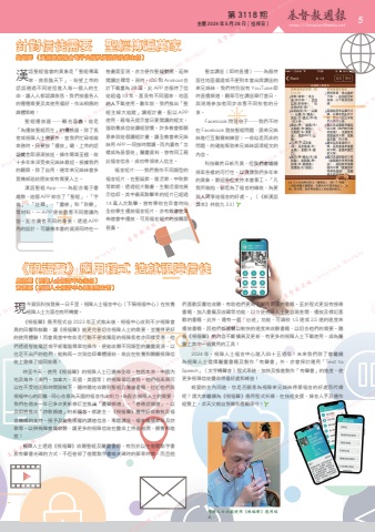 http://ChristianWeekly.net5 第 3118 期 主曆 2024 年 5 月 26 日(禮拜日)針對信徒需要 聖經傳遍萬家高超舜 (漢語聖經協會電子出版及資訊科技部主任)漢語聖經協會的異象是「聖經傳萬家,救恩臨天下」,盼望上帝的話語通過不同途徑進入每一個人的生命,讓人人都認識救恩。我們按着各人的種種需要及其使用偏好,作出相應的媒體策略:聖經播放器 ─顧名思義,這是「為播放聖經而生」的播放器。除了長者或視障人⼠需要外,當我們忙碌或做家務時,只要按「播放」鍵,上帝的話語就立即源源放送,操作簡單至極,故十多年來深受弟兄姊妹歡迎。根據我們的觀察,除了自用,通常弟兄姊妹會多買幾部送給朋友或有需要人⼠。 漢語聖經 App ─為配合電子書趨勢,這個 APP 綜合了「聖經」、「字典」、「註釋」、「靈修」和「聆聽」等材料,一 APP 便能盡看不同閱讀內容,配合讀者不同的需要;透過 APP內的設計,可讓幾本書的資源同時在一格畫面呈現,亦方便作聖經對照,延伸閱讀註釋等。現時,iOS 和 Android 合計下載量為 20 萬,此 APP 亦服侍了信徒超過 10 年,喜⾒有不同國家、地區的人下載使用。數年前,我們推出「聖經主線大追蹤」讀經計畫,配以 APP使用,藉每天提⽰當日要閱讀的經文,協助養成信徒讀經習慣。許多教會都願意參與這個讀經計畫,讓全教會弟兄姊妹用 APP 一同按時閱讀。而內裏有「怎樣成為基督徒」屬靈資料,曾有同工藉此福音信息,成功帶領家人信主。福音短片─我們製作不同類型的福音短片,在聖誕節、復活節、中秋節等節期,透過短片動畫,生動活潑地展⽰信仰,其中最高點擊率的短片已超過14 萬人次點擊。曾有學校在早會時向全校學生播放福音短片,亦有教會在其佈道會中播放,可⾒福音短片的接觸面甚廣。聖言講座(即時直播)─為服侍居住地區偏遠或不便到本會出席講座的弟兄姊妹,我們特別設有 YouTube 即時直播頻道,觀眾可在講座舉行當日,與現場參加者同步收看不同牧者的分享。Facebook 問答帖子─我們不時在 Facebook 發放聖經問題,跟弟兄姊妹進行互動寶劍練習;一些似是而非的問題,的確能幫助弟兄姊妹認清經文的內容。科技雖然日新月異,但我們會繼續探索各樣的可行性,以實踐我們多年來的異象。歡迎各位⽀持本會事工。「凡我所做的,都是為了福音的緣故,為要與人同享這福音的好處。」(《新漢語譯本》林前九 23)《視福聲》應用程式 造就視障信徒周淑麗(視障人⼠福音中心主任)黃德嘉(視障人⼠福音中心圖書館主管)現今資訊科技發展一日千里,視障人⼠福音中心(下稱視福中心)在牧養視障人⼠方面也有所轉變。《視福聲》應用程式自 2023 年正式推出後,視福中心收到不少視障會員的回響和鼓勵,讓《視福聲》能更完善切合視障人⼠的需要,並獲得更好的使用體驗!而會員當中有些是行動不便或獨居的視障長者亦同樣受惠,他們透過智能電話或平板電腦簡單地操作,便能收聽不同類型的屬靈資源。以往足不出戶的他們,能夠再一次與信仰羣體連結,故此在牧養和關顧視障信徒上發揮了協同效應!時至今天,使用《視福聲》的視障人⼠已遍佈全球,包括本港、中國內地及海外(澳門、加拿大、英國、美國等)的視障華語會員。他們很高興可以在不受地區和時間限制下,隨時隨地收聽到聖經及屬靈書籍,拉近他們與視福中心的距離,同心合意為天國的福音作出努力。為配合視障人⼠的需要,我們在過去一年已多次更新修訂並推出「靈聲頻道」、「普通話頻道」,以及即將推出「詩歌頻道」的新概念。感謝主,《視福聲》獲得好些教牧及福音機構的⽀持,授予及豁免版權的講道信息、專題講座、福音廣播節目及詩歌等,以供視障會員收聽,讓更多的視障信徒在靈命上得着滋潤、餵養和造就!視障人⼠透過《視福聲》收聽聖經及屬靈書籍,有別於以往借閱點字書及有聲書光碟的方式,不但省卻了借閱點字書或光碟時的郵寄時間,而且他們喜歡反覆地收聽,有助他們更為了解所閱讀的書籍。至於程式更設有搜尋書籍、加入書籤及收藏等功能,以方便視障人⼠更容易查閱、播放及標記喜歡的書籍。此外,還有一個「倍速」功能,可調校 1.5 速或 2.5 速的速度來播放書籍,因他們都習慣以較快的速度來收聽書籍,以切合他們的需要。隨着《視福聲》的內容不斷擴展及更新,有更多的視障人⼠下載使用,成為屬靈上其中一個實用的工具! 2024 年,視障人⼠福音中心踏入四十五週年!未來我們除了會繼續為視障人⼠選擇屬靈書籍及製作「有聲書」外,亦會探討運用「Text to Speech」(文字轉聲音)程式系統,加快及推進製作「有聲書」的進度,使更多視障信徒靈命得着好處和裨益!親愛的主內同道,您是否願意為視障弟兄姊妹得蒙福音的好處而代禱呢?請大家繼續為《視福聲》應用程式祈禱,在技術⽀援、錄音人手及運作經費上,求天父親自預備和看顧保守!視障人士示範使用《視福聲》應用程式。 Weekly 家務時,只要按「播放」鍵,上帝的話語就立即源源放送,操作簡單至極,故十多年來深受弟兄姊妹歡迎。根據我們基督教週報」的播放器。除了長⼠需要外,當我們忙碌或做家務時,只要按「播放」鍵,上帝的話Christian Weekly 顧名思義,這是」的播放器。除了長徒超過 10 年,喜⾒有不同國家、地區的人下載使基督教週報閱讀註釋等。現時,iOS 和 Android 合計下載量為 20 萬,此 APP 亦服侍了信徒超過 10 年,