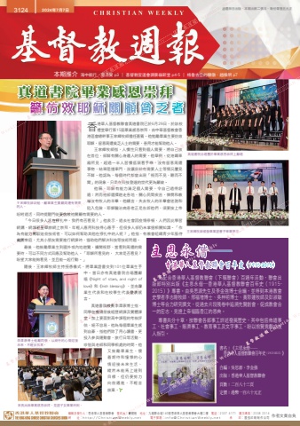 編輯及發行人:香港華人基督教聯會 督印人:鍾健楷 地址:九龍聯合道140號香港華人基督教聯會大樓二樓 電話:2337 4171 圖文傳真:2338 2314網 址:http://ChristianWeekly.net 電子郵箱:[email protected] 承 印:國強印刷制作公司 作者文責自負3124 2024年7月7日 逢禮拜日出版.本期出紙二張半.每份零售五元正本期推介 海中航行.曾浩賢 p3 ∣ 基督教宣道會調景嶺新堂 p4-5 ∣ 格魯吉亞的驕傲.趙煥明 p7主恩永偕─香港華人基督教聯會百年史(1915-2015)為配合香港華人基督教聯會(下稱聯會)百週年活動,聯會出版部特別出版《主恩永偕─香港華人基督教聯會百年史(1915-2015)》專書。由吳思源先生及李金強博士合編,並得到本港教會史學者李志剛牧師、邢福增博士、吳梓明博士、黃彩蓮牧師及彭淑敏博士等合力研究撰文,從過去片段殘卷中追溯先賢創會,促成教會合一的宏志,見證上帝福臨香江的恩典。專書共分十章,按聯會各部事工詳述發展歷史,其中包括佈道事工、社會事工、賑濟事工、教育事工及文字事工,盼以前賢貢獻成後人指引。合編:吳思源、李金強出版:香港華人基督教聯會頁數:二百八十三頁定價:港幣一百六十元正書名:《主恩永偕─香港華人基督教聯會百年史(1915-2015)》真道書院畢業感恩崇拜籲仿效耶穌關顧貧乏者香港華人基督教聯會真道書院已於6月29日,於該校禮堂舉行第15屆畢業感恩崇拜,由中華基督教會香港區會總幹事王家輝牧師擔任嘉賓。他勉勵畢業生要仿效耶穌,留意周遭貧乏人士的需要,善用才能幫助他人。王家輝牧師指,人慣性只看到個人需要,將自己放在首位,卻鮮有關心身邊人的需要。他舉例,從港鐵車廂所見,超過一半人習慣低頭看手機,沒有留意周遭事物,結果阻擋車門、沒讓座給有需要人士等情況屢見不鮮。他認為,每個時代都會出現「視而不見、聽而不聞」的現象,只是在科技發達的世代更為嚴峻。他稱,耶穌有能力滿足個人需要,令自己過得舒適;然而祂卻選擇遊走各地,關心民間疾苦,憐憫和教導沒有牧人的羊羣。他續言,失去牧人的羊羣會迷路和陷入危險,耶穌醫治病患者正是告訴他們,須要按上帝吩咐過活,同時提醒門徒要仿效祂關顧有需要的人。「今日很多人活在掙扎中,我們有否看見?」他表示,過去社會因疫情停頓,人們因此學習網購、網課甚至舉辦網上崇拜,年輕人應用科技得心應手,但很多人卻仍未掌握相關知識。「作為有能力駕馭這些技術者,可以如何幫助其他在掙扎中的人呢?」他指,有教會組織青少年服侍貧困家庭,尤其小朋友需要進行網課時,協助他們解決科技等技術問題。最後,他鼓勵畢業生到國外或內地遊覽,擴闊視野,當看到周遭的需要時,可以不同方式回應及幫助他人。「耶穌所看見的, 大家是否看見?盼望大家能夠看見,並且能一起行動。」隨後,王家輝牧師主持授憑儀式,將畢業證書交到101位畢業生手中。當日亦有真道書院合唱團獻唱《Night of stars, and night oflove》和《Irish blessing》,並由畢業生代表和在校學生代表發表感言。真道書院校長李澤康博士指,同學在疫情前後經歷網課及實體課堂,加上要面對高中課程的考核評估,絕不容易。他為每個畢業生感到自豪,指他們除了用心讀書,更投入參與運動會、旅行日等活動,珍惜與老師和同學相處的時間。他又鼓勵畢業生,懷着期待和憧憬的心情迎接未來生活,縱然未能馬上達到目標,但仍要努力向前邁進,不輕言放棄。王家輝牧師訓勉,籲畢業生關顧周遭有需要的人。真道書院合唱團於畢業感恩崇拜上獻唱李澤康博士勉勵同學,以期待的心情迎接未來,不輕言放棄。王家輝牧師頒發畢業證書予眾畢業生。家長出席畢業感恩崇拜,見證子女畢業時刻。 Weekly 基督教週報籲仿效耶穌關顧貧乏者 Christian Weekly 海中航行.曾浩賢 p3 ∣ 基督教宣道會調景嶺新堂 p4-5 ∣ 格魯吉亞的驕傲.趙煥明 p7真道書院畢業感恩崇拜籲仿效耶穌關顧貧乏者海中航行.曾浩賢 p3 ∣ 基督教宣道會調景嶺新堂 p4-5 ∣ 格魯吉亞的驕傲.趙煥明 p7 基督教週報 Christian Weekly 基督教週報 Christian Weekly逢禮拜日出版.本期出紙二張半.每份零售五元正n Weekly 為有能力駕馭這些技術者,可以如何幫助其他在掙扎中的人呢?」他指,有教會組織青少年服侍貧困家庭,尤其小朋友需要進行網課時,協助他們解決科技等技術問題。基督教週報「今日很多人活在掙扎中,我們有否看見?」他表示,過去社會因疫情停頓,人們因此學習網購、網課甚至舉辦網上崇拜,年輕人應用科技得心應手,但很多人卻仍未掌握相關知識。「作為有能力駕馭這些技術者,可以如何幫助其他在掙扎中的人呢?」他指,有教會組織青少年服侍Christian Weekly 適;然而祂卻選擇遊走各地,關心民間疾苦,憐憫和教導沒有牧人的羊羣。他續言,失去牧人的羊羣會迷路和吩咐過活,同時提醒門徒要仿效祂關顧有需要的人。「今日很多人活在掙扎中,我們有否看見?」他表示,過去社會因疫情停頓,人們因此學習王家輝牧師訓勉,籲畢業生關顧周遭有需要基督教週報聞」的現象,只是在科技發達的世代更為嚴峻。他稱,耶穌有能力滿足個人需要,令自己過得舒適;然而祂卻選擇遊走各地,關心民間疾苦,憐憫和教Christian Weekly 王家輝牧師指,人慣性只看到個人需要,將自己放在首位,卻鮮有關心身邊人的需要。他舉例,從港鐵車廂所見,超過一半人習慣低頭看手機,沒有留意周遭事物,結果阻擋車門、沒