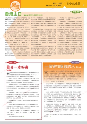 第 3124 期 主曆 2024 年 7 月 7 日(禮拜日) http://ChristianWeekly.net 輿 2情新加坡友人夫婦宴請我們美味肉骨茶後,隨即駕車載我們去烏節路並推介我們到義安城的紀伊國屋書店(Kinokuniya),這裏佔地 43,000 平方呎,據稱是全東南亞最大的書店。我買了《李瑋玲:一個客家女子的新加坡故事》一書,作者是李光耀的女兒,她是一位出色的精神科醫生。印象中我聽過她的名字,相比於她的兄長李顯龍,媒體關於她的報道太少了。原來她是一位醫生,1973 年考進新加坡大學唸醫科,畢業後在公共領域服務,也曾負笈哈佛大學及加拿大的多倫多兒童醫院接受小兒神經科訓練。2004 年至 2014 年出任新加坡國立腦神經醫學院的院長。這書是她的「自傳」,尤其提到她在父母晚年先後患病時,她不離不棄地全程照顧。她引述父親李光耀曾經對她說:「你母親和我或許出於自私,樂意看到你不嫁人,繼續留在我們身邊照顧我們終老。但你會感到孤獨。」她又怎麼回答呢?她寫道:「能在你和媽媽的晚年照顧你們,我沒有遺憾。」一生特立獨行而堅強硬朗的李瑋玲,就在父親李光耀逝世後,當看到家中女傭人在預備早餐時,把原本是李光耀坐的椅子挪到牆邊,那一刻她心如刀割,意識到父親從此永別:「只差一點我就崩潰了,但我不會崩潰的;因為我是一名客家女。所以爸爸,永別了。我會想念你的。安息吧。還有,要像客家人一樣堅強。」這是一本值得每個人看的書。我自小在教會長大,經常在主日崇拜中聽到海外宣教士的見證分享,印象中有非洲的杜牧師、蘇丹的張姑娘。日本的盧姑娘……他們的經歷都很獨特,故事也很感人。但每一次感動過後,我會告訴自己:那是別人的精彩人生!我沒有他們那麼崇高的理想,也沒有他們那種敢作敢為的勇氣,更沒有強壯的身形和體魄。結論是:我一生都不會成為宣教士!但是,一次的短宣,改變了我的想法。那是 1989 年,一個非常動盪的年份,那時我正在神學院讀二年級。6月初開始放暑假,我就在非常敏感的日子隻身飛往英國,參加基督教華僑佈道會(COCM)為期兩個月的短宣,當時最多人問的是:「你是逃出來避難嗎?」的確,在英國希斯路機場一下飛機就有逃難的感覺,因為我的托運行李全不見了,當時倫敦早上天氣很冷,我只穿單薄便服,瑟縮車站一角等候接機者出現,真的很狼狽。三天後行李送到了,原來誤運去另一個機場,害我三天單靠一位宣教士的外套禦寒,因為他的身形和我差不多,我才發現:像我這樣身形的人也可以作宣教士。後來,他索性把那件外套送了給我,成為我宣教路上的「以利亞外衣」。兩個月的短宣,我們兩人一組,從南到北,倫敦、利物蒲、利茲、都柏林、愛丁堡等大城市都留下我們的足印,因為我們每到一個城市,都會步行前往不同的華人餐館探訪,邀請他們參加半夜舉行的福音聚會,因為餐業人士那時才下班。這回我才醒悟:原來宣教不一定要去深山野嶺,原來就在繁華都市也有「未得之民」。來時,丟了行李;離時,失了航班,因為坐錯火車誤時了。結果……(下篇再續)。推介一本好書 一個害怕宣教的人當我們發現自己所處的世界似乎經常失控,變化是唯一的常態,不確定性是唯一的保障。然而,在這失控的旋風之中,我們並不是沒有指南針,沒有指路明燈。我們有上帝的話語,它是瞬息萬變的世界中,不變真理的燈塔。智者所羅門王說:「凡事都有定期,天下每一事務都有定時。」(傳三 1);又說:「上帝造萬物,各按其時成為美好,又將永恆安放在世人心裏;然而上帝從始至終的作為,人不能測透。」(傳三 11)。在這段話語中,特別提到兩個很重要的字,一是「時」即時間;其次是「事」即事件。時(傳三 1),時間不由我們來控制,乃是掌握在創天造地的上帝手中。摩西說:「起初上帝創造天地……上帝稱光為『晝』,稱暗為『夜』。有晚上,有早晨,這是第一日。」(創一 1、5)時間這個觀念,我們可以從不同的角度來思考,或許從物理學、哲學、心理學,甚至從生理學角度;不過你更可以從時間更替的神學角度來思考。根據 1898 年 6 月 9 日在北京簽訂有關拓展香港界址的條約,清政府把九龍界限街以北直至深圳河的新界地域以及 235 個島嶼租予英國,為期 99 年。那時香港僅是小小漁港,及後發展成為自由貿易港,為東南亞與中國之間的重要轉口港。五十年代因世界形勢大變,香港逐漸由貿易港口,轉型成工商製造業城市,繼而再發展成與新加坡並駕齊驅的國際金融中心,這些轉變都要經年累月才能達致。在回歸祖國 27 年後,香港也融入內地,成為大灣區其中一個重要城巿。時間不斷更替,環境也不斷變遷,這種種錯綜複雜的交接下,誰能預估香港將來會如何呢?「凡事都有定期,天下每一事務都有定時。」(傳三 1)。所羅門王提醒,世局不斷改變,上帝卻在我們生命中的每時每刻都設定了目的,即使在我們看不到的時候,上帝仍給我們應許。在上帝的安排下,沒有任何事情是隨意或毫無意義的。今天當我們發現自己在變化的逆風中搏鬥,試圖抓着熟悉和舒適的東西不放時,或許從另一個角度來看,我們不也正在轉變中嗎?放下執着,向上仰望,我們更常發現上帝的旨意,在變化的境況中愈加清晰。當我們尋求上帝的旨意,並信靠祂的應許時,我們豈不是更接近上帝嗎?事 (傳三 11),從經文中描述為上帝的作為,而這些作為是人不能測透。香港這個地方,在歷史的進程中,發生過大大小小的事情,才演變