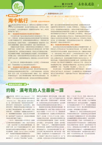 第 3124 期 主曆 2024 年 7 月 7 日(禮拜日) http://ChristianWeekly.net 信 3仰約翰·漢考克的人生最後一課我是約翰·漢考克(John Hancock),1737年 1 月 23 日出生於馬薩諸塞州的布倫特里 (Braintree, MA)。我在七歲之前一直和父母生活在一起,直到父親去世後,我被送到叔叔托馬斯·漢考克家中。托馬斯叔叔是一位成功的商人,擁有漢考克商行,專營歐洲商品的進口和國內貿易。在波士頓拉丁學校接受教育後,進入哈佛學院(現為哈佛大學),完成學業後,我繼續在叔叔的商行工作,幫助開闢新的貿易機會,並建立政治和商業關係。後來我接手了叔叔的公司,並迅速在馬薩諸塞州的政治圈中獲得了影響力。1765 年,英國政府通過《印花稅法》以緩解法印戰爭帶來的債務壓力。最初,我並不反對這一法案,但在目睹了波士頓的抗議和動蕩後,我改變了立場,加入了抵制英國產品的行列,這使我在殖民地居民中變得非常受歡迎。1766 年,在好友塞繆爾·亞當斯(Samuel Adams)的公開支持下,我當選為馬薩諸塞州眾議院的代表。1768 年 5 月 9 日,英國海關官員在沒有證據的情況下,非法登上了我的商船「自由號」,懷疑其走私葡萄酒。儘管沒有證據,英國人還是拖走了「自由號」,引發了水手和殖民地居民的騷亂。儘管在約翰·亞當斯的辯護下,指控被撤銷,但我因被視為走私者而名譽受損。自由號事件被認為是導致美國革命的首批重大事件之一。隨着殖民者與英國之間的緊張局勢加劇,我開始領導議會鬥爭,參與了關於《茶葉法》和《強制法》的會議。1774 年 12 月 1 日,我被選為第二屆大陸會議的代表,討論獨立的目標並制定抗爭的下一步計畫。1775 年 4 月 18 日夜,約瑟夫·沃倫醫生得知托馬斯·蓋奇指揮的英國軍隊正前往列克星敦抓捕我和塞繆爾·亞當斯。他派遣三名午夜騎士,其中包括保羅·里維爾,前來警告我們:「英國人來了」。保羅提醒我和亞當斯即將到來的危險,建議我們在英軍到達之前逃跑。我們逃脫後不久,列克星敦和康科德開了第一槍,正式拉開了獨立戰爭的序幕。戰鬥結束後,我返回費城,並被選為第二次大陸會議的主席。1776年,我監督了《獨立宣言》的起草工作。由「五人委員會」起草的這份文件宣告殖民地脫離英國獨立。1776 年 7 月 4 日,我第一個在文件上簽署了名字,用醒目的大字寫下「John Hancock」,並說道:「約翰·布爾(指英國)可以不戴眼鏡就看到我的名字,他可以加倍懸賞。」我繼續擔任大陸會議主席直到 1777 年,然後擔任馬薩諸塞州州長直至 1785 年。獨立戰爭期間和戰後的公共服務,使我蜚聲於大西洋兩岸。回顧我的人生,我祖父長期的牧師生涯和我們家族的清教徒信仰,在塑造我的品格和服務精神方面起到了至關重要的作用。祖父對牧師事業的奉獻讓我懂得社區服務的重要性、誠信和堅韌。清教徒的價值觀——勤勞、信仰和道德正直——是我成長過程中不可或缺的部分,指導我在商業和政治事業中的每一個決策。這些原則堅定了我的決心,使我能夠以信念和榮譽引領,在建立我們國家的過程中奉獻自己,這種奉獻精神和信仰傳承了我們家族的精神,為新國家的建立奠定了基礎。今天你們來到波士頓,可以在著名的約翰.漢考克大廈與我繼續隔空對話。陳曉東清教徒們的最後一課聖靈降臨後第七主日釋經講道 結二 1-5;詩一二三 1-4;林後十二 2-10;可六 14-29海中航行如果以船在海中航行來比喻人生,請問大家正向着哪個方向行駛呢?在今主日的福音經課,若以航行這意象去描述,當中有些人物是有方向地航行;也有在盪來盪去的,就讓我們從他們的「航行」來反思我們當下的「航行」。第一,有些船是向着滿足自己私慾的地方而航行。今天經課記載了施洗約翰為何被希律王殺害的經文(可六 14-29)。簡單來說,就是施洗約翰曾指出希律安提帕娶了他兄弟希律腓力的妻子希羅底的不是,這事使希羅底對他懷恨在心,即使希律已把施洗約翰收監,但她仍不滿意,一直等候機會殺他。最後利用一次女兒得王賞賜的機會,逼使丈夫把約翰斬首,滿足了她的邪惡念頭。希羅底作為妻子和母親,本應好好幫助丈夫和教導女兒。可是作為妻子的她,先背叛了前夫,改嫁給前夫同父異母的兄弟。做了希律安提帕的妻子後,也因對施洗約翰的恨,明知丈夫不想殺施洗約翰,而且有機會引來動亂,但她仍借機迫使丈夫這樣行。而作為母親的她,則更讓人無言,母親怎能這樣利用女兒去滿足自己殺人的念頭,讓女兒雙手沾血之餘,也變相教導她成為一個視其他人生命如草芥的邪惡者。按上帝的心意,希羅底本應向着成為一位好妻子、好母親的航道航行,可是她卻跟從了自己的仇恨和私慾去而行。第二,有些船是在海中盪來盪去,結果隨流失去。希律安提帕王,或許我們可以形容他是一艘在海中盪來盪去的船。希律對施洗約翰的態度其實很矛盾,一方面不滿他的諫言,甚至把他監禁。但另一方面,他又認同施洗約翰是一個義人、聖人。雖然施洗約翰的說話逆耳,但他又樂意聽其講論。關於希律安提帕這個人,路加福音二十三章也有關於他的記載,就是彼拉多把耶穌送去他那邊作審問。經文記載到希律期望耶穌回答他的問題,並顯個神蹟給他看。這讓我們再次看到希律有一份認識上帝事情的心,可惜他這份心意飄浮不定。明明曉得施洗約翰是聖人,卻因女兒和妻子的要求把他殺了。明明認為耶穌與施洗約翰都是聖人之類的人物,但當