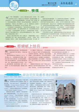 第 3124 期 主曆 2024 年 7 月 7 日(禮拜日) http://ChristianWeekly.net 生 6活今早,我到一間教會講道。一位約七十歲的會友走前來,向我說,「我已沒有回來一段日子。我跟兒子去了他的教會,但知道你來講道,我就刻意回來。」他的話沒有加重我講道壓力,反而勾起一年前一段回憶。那時,我也到這教會講道。崇拜結束,我站在門前送別會友。他跟我握手時,眼濕濕地說,「數月前,我太太離世了。」這一年,他過得如何?向他取了他的電話號碼,晚上發短訊給他,約七月下旬見面、飲茶。九年前過世的一位朋友曾跟我說,「請你在我的安息禮拜講道。可以的話,也給我的丈夫鼓勵。」我一直都記掛他們一家。今日在教會遇上她丈夫(六十多歲),在崇拜負責彈琴。孩子長大了,沒有跟他來教會。崇拜後,跟他交流了幾句有關孩子狀況,但沒有時間多關懷他的近況。晚上,發短訊給他,約他出來見面、飲茶。數天前,跟昔日學生午飯。其中一位學生說,「媽媽前年離世,爸爸心情時好時壞。近日,他說,他好掛念他的妻子。」學生說,「星期日,我沒有去教會,陪伴他。」查實,我有幾位同齡朋友也失去配偶,陷入哀傷,甚至抑鬱。喪偶不是長者的獨有經驗,三十七歲那時的我已經歷喪偶了。年輕喪偶與年長喪偶面對的困難很不一樣。年輕鰥寡因要面對生活壓力和「搵食」,反而令他們不能停留在哀傷太久;相對地,這不是年長鰥寡的經驗,他們有較多時間在哀傷中,甚至走不出來。年輕鰥寡的活動和興趣範圍相對地廣和密,以致他們有較多資源回應他們的情緒;相對地,年長鰥寡的活動和興趣比較窄,他們可以有的資源就較少,往往是單獨面對。又社會對年輕鰥寡較同情,若他們再婚,社會多祝福他們;相對地,年長鰥寡的續絃就比較困難,除了自己給自己的限制,也有來自社會的眼光。承受由喪偶而來的孤單、遭遺棄的感受和懷念等是無可避免的事。我們不需要變得無情才可克服喪偶帶來的傷痛,反而感謝他們多年的陪伴,讓我們有美好生活。未來十年、廿年如何過?再加上身體開始多病痛,沒有配偶的未來日子如何過?下次分享。▲成都恩光堂,前為 1894 年加拿大衞理差會創立 (2009 年 5 月拍攝)遷出中國的教團中,有的是僅僅為了中國工場而創建,單單聚焦在中華大地傳道的。例如「中國內地會」(China Inland Mission),及後改組成為「海外基督使團」(Overseas Missionary Fellowship)。另有「中國基督徒佈道十字軍」(China Native Evangelistic Crusade),及後更改名稱成為現時「中華傳道會」(Christian Nationals' Evangelism Commission)。南遷香港的外國宗派,為數眾多。有來自歐洲的,例如「挪威宣教聯合教會」(The Alliance of Mission Churches in Norway),及後扎根香港成為「基督教聖約教會」(The Mission Covenant Church)。來自北美的,例如「金巴崙長老會」(Cumberland Presbyterian Church)。還有來自日本的,例如「遠東宣教會」(Oriental Missionary Society),及後建立「香港宣教會」(Hong Kong Evangelical Church)。南遷香港的教團若帶有神學院,由於在西教士以外又加上動員學生及畢業生,其所屬宗派的佈道植堂拓展,更是如虎添翼,突飛猛進。例如「信義神學院」,及宣道會的「建道神學院」。相對之下,也有西教士心繫華人,未有隨差會終結中華事工而回國,倒選擇獨自留在香港,自籌資源服事。例如:艾偉德(Gladys Aylward)創建「篤志傳道會」(Hope Mission)。又如:戴瑞蘭(Gertrud Tragradh)創建「將軍澳基督教錫安堂」(Sion Church)。南遷來到香港的主僕,招聚同樣移居香港的信徒,秉承往日在國內的見證心志,合力在香港復堂;這現象也屢見不鮮。例如:何義思(Ruth Howe Hitchcock)復辦南海「希伯崙會」(隨後加入宣道會),又如:華人牧者李啟榮復辦廣州「萬善堂」,(隨後加入中國佈道會)。那些年千百主僕匯流香港,為新增二百萬居民的社會融注大量各式服事。喪偶拒絕紙上談兵 新政初年南遷香港的教團(下)前台積電研發處長楊光磊在一個中學畢業典禮上,勉勵同學們不要只懂考試,不要做只識紙上談兵的人。講話中有相當多發人深省的地方。其一是 「不要太聽老人言」,這個提醒很有時代意義。的確,相比於幾十年前只有教科書,如今網絡資源豐富,年輕人要找資料獲取新知,比他們的父輩們要容易得多,故此,過去成功的模式已不合時宜,「老人言」隨時脫離現實,甚或過時過氣。當然,從另一角度看,老人家也不能再倚老賣老,應該虛心汲取新知。另一重點是「不要紙上談兵」,楊光磊提醒年輕人:從「知道」到「做到」是宇宙間最遠的距離,此即所謂「知易行難」。楊氏指出,現在科技發展的趨勢,少有純科學的突破,反而是基礎科學應用在改善世界已成主流。這對讀書人有如醍醐灌頂,頭腦上的知識再豐富,若不付諸實行,不過是理論而已。執行力必須從小培養,動手做才有望達致真正成功。更重要是不要害怕失敗,這和「不要紙上談兵」關係密切。動手做的危機是容易出錯,所謂「多做多錯,不做不錯」,但只要把失敗當成學習機會,就能夠從失敗找到出錯的原因,然後加以克服,則每次失敗都是邁向成功之路的重要一步。最近,專門研發太空運輸的 Space X 公司創辦人伊隆.馬斯克在經歷多次失敗之後,第四次終於成功發射重型火箭「星艦」,讓人更加體會到,不怕失敗真是成功的基石。當很多人仍在嘲笑馬斯克的火箭夢時,他卻一步步為可以重複使用的火箭而努力,並且總結每次不算成功的發射經驗