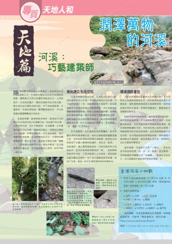 專頁 天地人和隨環境變化的水在山谷裏滙合,由涓涓流水至滾滾江河。它有能力運送河岸與河床鬆脫的物質,攜帶能力又與水流量和流速成正比。上游斜度大,水流快而量少,重的石塊較早在河床沈積,集合成以岩石礫為主的河段。中下游坡幅漸緩,水量漸多,石塊互相碰撞,變得圓滑成卵石,河床的基質也慢慢轉變成沙泥為主。若坡度突變,陡峭的就成瀑布,高度差衍生的衝力令水和其中的沙石撞擊河床,形成瀑下的水潭,天然的深水區。至於平緩區域,水流變慢,沙石慢慢沈積至河床內彎;彎曲的河道上,內彎並沈積物令水流更慢。外彎流速較快,河岸易被侵蝕,使河道變得愈來愈彎。若是較彎曲的河段,沈積物在轉彎處集中,當水位下降,甚至能令那段河道「截斷了」,形成獨立的狹窄水池,稱為牛軛湖。若河道寬闊沙泥量充足,也可能堆積成三角洲,如河中的一個小島。河溪: 巧藝建築師彼此建立生活空間河溪生物最怕被水沖走。水流配合山勢足以形成眾多不同的小生境,不同的石塊與沙泥沈積,令河道的流速不一致,為動物提供合適居所:卵石聚集處令河床有很多細小的躲藏縫隙,水生昆蟲能逃避捕食牠們的魚蝦;有能力抓緊石塊的螺,愛聚集在石頭的急流處,減少與其他生物重疊居住空間,避開未能在快水流游動的捕食者。較大型的魚最愛圍聚深水潭,有大石的森林山澗更是「香港瘰螈」( 音:裸原 ) 生活的地方。不只是動物,水生植物也有其專屬地,從水中露出來的石堆夾雜沙泥,為水生植物提供優質基質生長,如草般修長的石菖蒲尤其喜愛。她們在水中的根成了水裏小動物的庇護所,甚至是「產房」,安放着卵。遇上暴雨後的急流,河床石塊也被水流捲走時,這些由植物根部織成的「網」,能使動物免被洪水沖走。三角洲這類小小的陸地,甚至能長出灌木叢以至樹木,加上被水圍繞能提供保護,就成了水鳥,甚至一些水生哺乳動物很好的棲息地。▲ ( 左 ) 瀑布傾流而下。( 右 ) 河床有不同大小的石塊和沙泥,還有外露的石頭,形成複雜的小生境供不同生物使用。每條河流的生境都是獨一無二。環境調節重臣河溪也為整個地區提供水分調節功能。下大雨時泥土未能吸收過多水分,雨水就成為面流滙入河道排走,避免植物的根部因水淹缺氧而死,同時儲起維生的淡水資源。旱季時雨量減少,動植物在河溪邊便仍能存活。好的河溪常有森林陪伴,樹木能遮擋太陽照射,減少河水直接蒸發,令水溫較為穩定及清涼,形成濕涼微氣候,在炎炎夏日為生物提供宜居環境。陽光經過樹蔭灑在河溪,河床的石塊上能長出藻類,為植物食性的生物提供食物;並且因藻類能進行光合作用,在日間成為很好的氧氣來源。同時樹蔭又確保陽光不會過猛,避免藻類生長太快,到晚間反與水生動物爭奪氧氣。愈仔細看,河溪絕不只是「一條水」,更是包含不同自然成員,雨、水、泥、植物,甚至動物,互相協調並持續變化的「有機體」。萬事皆互相效力,在河溪裏或許能給我們更新的理解。▲慶褐蜻。蜻蜓是河溪動物,幼年時期在水中生活,蜻蜓點水就是在產卵。▲以香港命名的唯一有尾兩棲類動物「香港瘰螈」,在記錄瀕危物種的 IUCN紅色名錄屬於易危 (Near Threatened) 品種,受香港《野生動物保護條例》保護,在野外見到請勿觸摸。▲海芋 ( 大片心形葉 ) 和蕨類植物 ( 葉片多呈羽毛狀 ) 都是常見的河溪植物。香港河溪小挑戰1. 香港河溪的總長度是:A: 約 500 公里 B. 約1000 公里 C. 約 2500 公里 參考:香港海岸線長度 ( 包括海島 ) 約 1200 公里2. 地區河流對對碰:a. 屯門 b. 元朗 c. 上水 d. 大埔 e. 沙田 f. 黃大仙 g. 觀塘i. 山貝河 ii. 雙魚河 iii. 林村河 iv. 梧桐河 v. 翠屏河 vi. 屯門河 vii. 啟德河 viii. 城門河延伸閱讀:河溪是極豐富的生境種類,有興趣認識更多,可參考「賽馬會惜水.識河計劃」:https://www.jcwise.hk/gis/?lang=zh答案:1 C;2 a-vi,b-i,c-ii,iv,d-iii,e-viii,f-vii,g-v。 Weekly 基督教週報 Christian Weekly 河溪:基督教週報 Christian Weekly 基督教週報 Christian Weeklyn Weekly 令水流更慢。外彎流速較快,河岸易被侵蝕,使河道變得愈來愈彎。若是較彎曲的河段,沈積物在轉基督教週報天然的深水區。至於平緩區域,水流變慢,沙石慢慢沈積至河床內彎;彎曲的河道上,內彎並沈積物令水流更慢。外彎流速較快,河岸易被侵蝕,使河Christian Weekly 量漸多,石塊互相碰撞,變得圓滑成卵石,河床的若坡度突變,陡峭的就成瀑布,高度差衍生的衝力令水和其中的沙石撞擊河床,形成瀑下的水潭,天然的深水區。至於平緩區域,水流變慢,沙石慢基督教週報集合成以岩石礫為主的河段。中下游坡幅漸緩,水量漸多,石塊互相碰撞,變得圓滑成卵石,河床的河道的流速不一致,為動物提供合適居所:卵石聚集處令河床有很多細小的躲藏縫隙,水生昆蟲能逃Christian Weekly 彼此建立生活空間河溪生物最怕被水沖走。水流配合山勢足以形成眾多不同的小生境,不同的石塊與沙泥沈積,令河道的流速不一致,為動物提供合適居所:卵石聚基督教週報每條河流的生境都是獨一無二。Christian Weekly 基督教週報 Christian W 基督教週報▲ ( 左 ) 瀑布傾流而下。( 右 ) 河床有不同大小的石塊Christian Weekly 基督教週報 Christian Weekly 成了水鳥,甚至一些水生哺乳動物很好的棲息地。 基督教週報免被洪水沖走。三角洲這類小小的陸地,甚至能長出灌木叢以至樹木,加上被水圍繞能提供保護,就成了水鳥,甚至一些水生哺