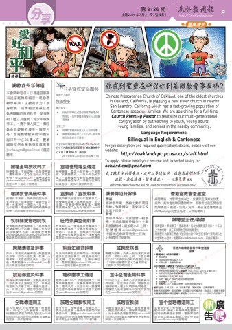 第 3126 期主曆 2024 年 7 月 21 日(禮拜日) http://ChristianWeekly.net 分 9享 靈風漫步香港宣教會恩盈堂誠聘傳道,神學學士或以上,負責家庭及婦女牧養,成熟、具牧會經驗及團隊精神,有服侍社區拓展福音經驗更佳。履歷、諮詢人資料、蒙召見證請電郵至[email protected]堂主任收(只作招聘用)全職傳道同工成人牧養及主日學教導。神學畢業,3年或以上牧會經驗。有意請繕履歷附蒙召及得救見證至[email protected]基督教宣道會真道堂收。只供招聘用誠聘全職教牧同工聘堂主任,神學畢業,經驗不拘,委身小型堂會,熱誠傳福音門訓牧養青少年。履歷[email protected]佳音基督教會聘牧組招聘用或寄上水新豐路101-103號2樓宣中堂聘傳道同工負責青少年/長者事工,經驗喜接觸青少年/長者。神學畢業重團隊,講道牧養傳福音恩賜。履歷蒙召得救見證九龍城富寧街二號宣中堂周生[email protected]招聘用宣中堂聘全職幹事DSE或以上,事奉心志支援教會崇拜活動。管控影音系統,電腦影音器材經驗。週六日間中晚間當值;繕履歷九龍城富寧街二號宣中堂周先生[email protected]招聘用聘校園事工傳道國際小學CAPCL校園福音事工;神學畢業重團隊,牧養教導傳福音恩賜,通中英文,英語流利。履歷蒙召見證九龍城富寧街二號宣中堂周生[email protected]招聘用誠聘傳道及幹事聘傳道需神學畢業,主要負責兒童、家長事工及協助堂主任。幹事處理堂務及文書工作,懂會計更佳。六、日需上班,繕歷寄荃灣潮語浸信會[email protected]招聘用。誠聘庶務員需體力勞動,負責一般清潔及庶務工作,須週六及日上班。有意者請於7月27日或前致函到九龍亞皆老街123號神召會禮拜堂人力資源部收。(資料只作招聘用途)牧群關愛會聘院牧負責醫院床邊關懷事工,具神學及牧養關懷CPE訓練,相關工作及行政經驗優先考慮。請繕履歷電郵[email protected]或寄香港郵政總局信箱8456號招聘用誠聘宣教師負責牧養職青/夫婦。需神學畢業、重視靈修禱告、願拓展福音聖工。有意者請函履歷電郵至[email protected]中華基督教會聖光堂何牧師收。只招聘用。聘請傳道及幹事青少、家長或長者傳道,熱愛宣講及教導、熟悉小組牧養。幹事,大專畢業,文書處理及設計,周六當值。電郵履歷[email protected]香港天樂浸信教會招聘用誠聘傳道及幹事傳道需神學畢業,熱誠主動具團隊精神;牧養婦女、家庭事工及兒童主日學。幹事需中學畢業,負責堂會一般事務、熟悉電腦軟件操作,主動具團隊精神;需星期六日上班。履 歷 電 郵 [email protected]中國佈道會祥華堂堂主任收。只招聘用合則約見誠聘青少年傳道本會蒙神恩召,以普通話服事本港家庭傳揚福音,現急聘神學畢業,主動有活力,委身牧養,有傳福音熱誠且擅教導關顧的傳道牧者,從零開始,建立及發展「青少年牧養事工」。携手領人歸主,興旺教會具經驗者優先。履歷可寄:香港觀塘駿業街56號中海日升中心21樓A室-觀塘國語浸信會陳執事收或電郵[email protected](僅招聘用)聘請教會高級幹事處理日常事務,負責辦公室行政,堂務安排,物業管理,電腦中英文書,大專程度,須周六,日工作,三年經驗。履歷招聘用寄銅鑼灣浸信會,屈臣道維多利中心403室誠聘全職教牧同工神學畢業,主動成熟,具教導恩賜,團隊精神,主力牧養婦女家庭及長者。長沙灣區工作。履歷電郵至[email protected]香港宣教會恩基堂人事小組收(招聘用)宣道會馬灣堂傳道神學畢業,委身小型堂會,主動熱誠,牧養關愛成人,青少年及婦女事工,請繕履歷至新界馬灣體育路一號執事會主席收,須進行性罪行紀錄查核,資料只供招聘用途。宣教師/宣教幹事拓展中學及社區青少年宣教事工,牧養職青群體,具團隊精神,全/半職,宣教師需神學畢業。履歷寄葵涌大窩口上角街1號或[email protected]亞斯理堂招聘用 旺角崇真堂徵幹事有事奉心志,懂電腦及音響操作,負責教會事務、文書及收支帳目,需週六、日當值,全職或半職可議,薪金按年資逐年調整。請將履歷電郵至[email protected]招聘用聘青年福音幹事負責與中學生至初職同行,推動教會及社區福音事工,跟進栽培及行政支援,主動熱誠,全職半職皆可。電郵履歷至[email protected]宣道會富山堂招聘用。誠聘堂主任/牧師領導團隊、策劃事工、宣講教導、信徒牧養關懷及培訓。十年以上牧會經驗,具五年相關主任牧師經驗優先。請履歷寄九龍灣宏開道16號德福大廈1706室基督教牛頭角潮人生命堂聘牧小組收,或電郵[email protected],只供招聘用。香港九龍塘基督教中華宣道會 誠聘 I. 傳道同工(青少年群體)• 神學畢業• 負責教導牧養及福音工作• 成熟主動,重團隊精神II. 行政幹事 / 副幹事 (Admin/ 行政工作 )• 大專或以上程度,五年或以上行政工作經驗• 熟悉基本電腦操作及文書處理(MS Office 及中英文輸入法)• 負責協助處理本教會與屬下分堂的聯絡及行政工作• 負責轉制工作的行政支援• 成熟,細心,富責任感及具團隊精神• 需於週六、日上班• 有事奉心志,能靈活應變,具教會經驗者優先福利包括:5 天工作、12 天有薪年假、醫療津貼、住院保險等。應徵者請繕履歷、要求薪酬、申請職位及所屬教會(如適用)電郵至香港九龍塘基督教中華宣道會人事組收 ([email protected]) 。(資料只作招聘用) Weekly 本會蒙神恩召,以普通話服事本港家庭傳揚福音,現急聘神學畢業,主動有活力,委基督教週報誠聘青少年傳道本會蒙神恩召,以普通話服事