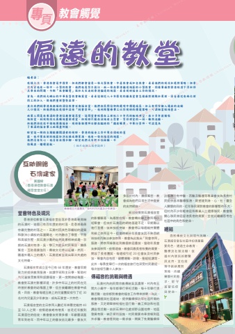 專頁 教會觸覺編者語:疫情之後,香港教會逐步復常,但我們都會留意一些大型教會、中產教會或知名教會,看看他們的現況和應對策略;但香港其實也有一些中、小型的教會,他們也是努力前行,而一些在香港偏遠地區的小型教會,同樣要面對香港經濟下滑和移民帶來的問題,今期「教會觸覺」就和大家走到香港偏遠的地區,看看現時福音工作的情況。首先,我們到大嶼山的中華基督教會梅窩堂,看看這個近八十年歷史的離島堂會怎樣面對挑戰和更新,因着最近有兩位新同工的加入,使他們重新整裝出發。其次我們到香港島南端的浸信教會石澳福音堂,他們在民間信仰的處境中傳道成長,加上有慣常搬入遷出的流動人口情況,但他們也在疫情中設有「到會崇拜」,也利用醫療事工以作現時的傳道策略,可謂相當貼地靈活。而第三間是在東涌的香港信義會道恩堂,這間堂會經歷在上世紀六十年代的租地建堂,在十多年前被收地拆堂,到現階段又再購地重新建堂,但現時只能在該地皮上聚會,等待建堂的一刻。雖然流離,但他們仍孜孜不倦地傳揚福音,現時每個禮拜日都在臨時的「鐵皮帳幕」中舉行崇拜,可說是為了東涌的福音事工而竭盡所能。盼望這一期的主題能擴闊讀者的視野,香港的福音工作不單在傳統的舊區,也不單在新的地區如洪水橋或將軍澳,也有一些在偏遠的地區,他們沒有灰心,也沒有放慢手腳,盼望我們大家都不怕困難,不怕風浪,繼續前航。多居於村內,關係緊密,教會成為他們日常生活中重要的支持網絡。新冠疫情對石澳福音堂的影響顯著,為應對疫情,教會轉向線上崇拜和小組聚會,但由於石澳區的網絡基建不足,早期難以進行直播。後來技術突破,教會得以每週維持實體和線上崇拜至今。但當時部分年長會友因不熟悉網絡技術而無法參加崇拜,教會為此推出「到會崇拜」服務,將崇拜錄影送到幾個家庭播放,協助年長會友參與崇拜。疫情過後,教會回應長者牧養的需要,開設了長者團契,每週吸引近 20 位會友及村民參加,聚會內容包括:健體運動、詩歌、聖經短講等。此外,每季度舉行一次的福音旅行也深受村民歡迎,每次皆吸引數十人參加。傳福音的挑戰與機遇石澳村內的民間宗教傳統氣氛濃厚,村內有五間大小廟宇,每年都舉行祭祀活動,每十年舉行清醮活動,這些都對教會的福音工作帶來挑戰。為此,教會積極與社區連結,提供醫療探訪等社區所需的服務,又定期舉辦祝福社區行動、義工探訪和社區講座等活動。由於石澳村位處郊野公園地帶,地區發展有限,缺乏便利設施,村民需要舟車勞頓到區外求醫。教會看到這一需求後,開展了免費醫療探堂會特色及現況香港浸信教會石澳福音堂座落於香港島東南端的石澳村,這個已有百年歷史的村落,是香港島保存最完整的村落之一。石澳村因其色彩繽紛的建築和歐洲小鎮般的氛圍聞名,村內融合了寮屋、平房和高級別墅,與石澳沙灘的自然美景相映成趣。早期的石澳村有李、吳、黎三大姓氏村民聚居,關係緊密,互助意識強烈,傳統文化得以延續。然而,隨着外籍人士的遷入,石澳逐漸呈現出華洋共處的文化特徵。石澳福音堂成立至今已有 68 年歷史,教會早期致力於提供教育服務,如識字班和主日學,幫助村內兒童接受教育和認識福音,更一度開辦幼稚園。教會對石澳村影響深遠,許多中年以上的村民在兒時曾於教會的幼稚園上學,信主後繼續在教會中成長。目前,教會每週五晚上的兒童團契吸引了近 30名村內兒童及少年參加,成為石澳堂一大特色。石澳福音堂的主日崇拜人數近年來穩定維持 40至 50 人之間,疫情過後略有增長,皆是近年搬到石澳居住的信徒。教會會友背景多樣,年齡層涵蓋青年到老年,而中年以上的會友佔比最多,會友大訪服務,有中醫、西醫及醫護等專業會友為長者村民提供基本醫療服務,期望達到身、心、社、靈全人關懷的目的。近年移民潮對教會的影響暫時不大,但村內不少年輕家庭和專業人士選擇移民,教會需關心移民家庭留港長者的需要,並就此繼續思考在社區中的角色和使命。總結面對傳統文化與現代挑戰,石澳福音堂在社區中扮演着重要角色,通過生命教育、醫療及社區活動,促進村內居民的聯繫與支持,並在疫情中創新應對策略,持續關懷村民需求, 堅 守基督信仰與 使 命。面對傳統文化與現代挑戰,石澳福音堂在社區中扮演着重要角色,通過生命教育、醫療及社區活動,促進村內居民的聯繫與支持,並在疫情中創新應對策略,持續關懷村民需求, 堅 守基督信仰與 使 命。黃國樑(香港浸信教會石澳福音堂堂主任)互助網絡 石澳建家教會週五兒童團契,吸引村內兒童及少年參加。( 相片由撰文教會提供 ) Weekly 基督教週報疫情之後,香港教會逐步復常,但我們都會留意一些大型教會、中產教會或知名教會,看看他們的現況和應對策略;但香港其實也有一些中、小型的教會,他們也是努力前行,而一些在香港偏遠地區的小型教會,同樣要面對香港經濟下滑和移民帶來的問題,今期「教會觸覺」就和大家走到香港偏遠的地區,看看現時福音工作的情況。疫情之後,香港教會逐步復常,但我們都會留意一些大型教會、中產教會或知名教會,看看他們的現況和應對策略;但香 Christian Weekly 基督教週報 Christian Weekly 基督教週報 Christian Weeklyn Weekly 基督教週報石澳建家Christian Weekly 基督教週報他們沒有灰心,也沒有放慢手腳,
