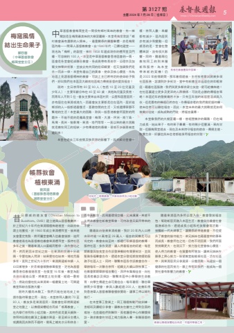 http://ChristianWeekly.net5 第 3127 期 主曆 2024 年 7 月 28 日(禮拜日)鄭容喜(中華基督教會梅窩堂堂主任)梅窩風情結出生命果子帳幕教會植根東涌劉其盛(基督教香港信義會道恩堂堂主任)昔日 挪 威 的 道 友 會(Christian Mission to Buddhists, CMB)建立道風山基督教叢林,於上世紀六十年代在東涌積極佈道植堂,向政府申請土地獲批,於 1960 年成立東涌禮拜堂。後來道友會重定焦點,將所屬堂會轉入信義會接辦,這所教會遂易名為基督教信義會東涌禮拜堂。服侍社區多年之後,隨着東涌人口萎縮而暫停,改作營地之用,然而更因半世紀之前,往東涌的交通十分疏隔,令營地無人問津;結果營地也結束,場地荒廢多年。直到上世紀九十年代,東涌興建新市鎮,人口日漸增多,於是教會順勢修葺復堂,定名為基督教香港信義會道恩堂。在復堂 16 年後,教堂為配合政府建造公屋,將教堂土地交還,經過一番努力,得政府撥地批出東涌東一幅優質土地,可興建教堂和綜合服務大樓。現時大樓尚未動工,我們只能在這地皮上申請作臨時聚會之用,現在,本堂崇拜人數約 70 至80 人,教友多是東涌居民。現教會在即將興建新堂之地盤上,以幾個貨櫃組合而成「帳幕教會」,在內舉行崇拜和小組活動。其特色就是夏天頗熱,崇拜時段需在鐵頂上蓋曬水降溫,甚至部分主禮人或講員因炎熱而不適時,需馬上補充水分和休息;而冬天較冷,因周圍環境空曠,北風凜凜。希望不久將來教會在新教堂聚會,可待改善天氣所帶來的不便。隨着政府發展東涌規劃,預計 20 年內人口將由現時逾 14 萬增至 28 萬人,福音的契機是可以肯定的。教會由始至終,都遵行耶穌基督的教導,服侍社區,多作見證,讓人得着福音的好處。每星期教會與惜食堂合作派發凍餐給有需要街坊,並與聖雅各福羣會合作,透過本堂分發短期食物援助服務予社區人士。同時,聯繫本區各宗派教會合作,舉辦每年一次聯合崇拜、組織北大嶼山院牧事工、在教會節期舉辦福音攤位、昂坪市集報佳音、向社區長者義診及探訪,聯繫本區中小學舉辦生命教育,向學生傳遞生命可貴信念。每年暑假,聯合舉辦青少年營會,參與人數超過 200 人,這幾年得到香港華人基督教聯會撥款贊助,讓事工得以順利推行。在本堂事工發展上,同工積極推動門徒訓練、查經班及讀經分享會;讓教友在靈性上得到全面的栽培,也差遣他們到醫院、長者護理中心作關懷探訪。務求教會在地區上竭力服務人羣,彰顯基督的愛。隨着東涌區內多所公屋入伙,教會發放福音包,幫助新居民融入本區生活。教會與信義會社會服務部合作,透過成長小組和毛孩聚會等活動,接觸新一代夫婦事工,讓關係網帶進教會,不但提升了教會的接待能力,弟兄姊妹也藉着當中的事奉而成長。教會所在之地,仍有不明因素,我們所面對挑戰更大,在現況下,努力強化堂會核心價值:使人得力的教會,在質量有所增加,讓弟兄姊妹在願景上齊心努力。盼望教堂能植根社區,活在社區中,與東涌居民分享資源,分擔困難,為建設一個健康的社區而努力。願上帝幫助我們,能成為一個對社會有影響力的教會。中華基督教會梅窩堂是一間很有鄉村風味的教會,有一棵聞說是全梅窩最美味的大樹菠蘿樹,本堂長執常常說「鄉村教會滿有濃厚的人情味」,着重關係的屬靈羣體,亦是梅窩區內唯一一間華人基督教教會。自 1940 年代,已購地建堂——現名為「梅軒」的副堂,後於 1958 年建成現存的禮拜堂及門樓,可容納約 100 人。本堂是中華基督教會香港區會的一員,區會是各堂會組成聯合教會,各成員帶有長老宗、公理宗及加爾文神學的背景,並彼此有共同的信仰綱要,但又強調我們是合一而非一律。本堂有着自己的異象、使命及核心價值,作為地區上見證基督精神的教會,可說上主已將特定的使命給予我們,好叫我們在本區及大嶼南地區竭力傳揚基督的愛與福音!現時,主日崇拜有 80 至 90 人(包括 10 至 20 位兒童及少年人),主要年齡分布在 40 至 60 歲,其他為兒童及長者,而青年人不到 5 位。會友主要來自本區村民、公屋和居屋居民,亦有居住在東涌或港九。因着會友主要都是住在區內,居於這鄉郊的人一般都過着慢活、喜歡悠閒的生活,又或選擇寧靜不繁喧的生活!本堂最大的困難,除與一般香港教會所面對的問題外,不能不提的是離島堂會:梅窩、大澳、坪洲、南丫島、馬灣、長洲、愉景灣、東涌、塔門等等,一直以來的最大困難就是教牧同工的短缺,少有傳道者的應徵,甚或不多願意被差遣到來!本堂在過去三年疫情及移民潮的影響下,與大部分堂會一樣,崇拜人數、奉獻都有減少,區內居民亦有減少和變動。但感恩的是,堂會在整體來說,沒有很大影響。同時,隨着兩位教牧同工的到來履新 和 服 侍, 為 本 堂帶 來 新 的 契 機! 仍是 2022 年疫情期間,那年暑假過後,主任牧者嘗試開展多項社區服務,認識到許多街坊,當中有新遷至本區居住的年輕家庭。藉着社區服務,我們與更多鄰舍建立友誼,便可趁機佈道!在社區裏建立更多及更深的人際關係,可說是必勝的傳福音策略!本區近年的發展雖然不多,只有五年前的新居屋落成與入伙,但是舊有的機遇仍然存在,作傳福音者的我們需把握時機,使未信者可以聽信福音。因此,本堂未來的最大挑戰就是如何裝備好信徒,成為成熟的門徒,將福音廣傳。本堂像我們的大樹菠蘿一樣,曾經歷幾許的艱難,仍在竭力成長,結出果子,有時果子