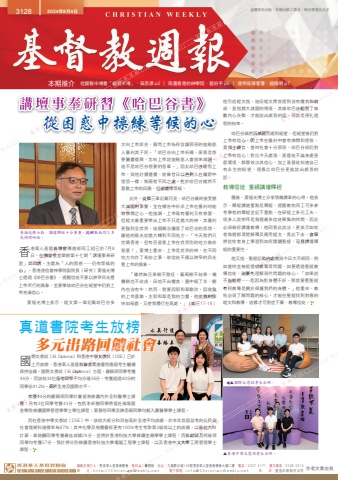 編輯及發行人:香港華人基督教聯會 督印人:鍾健楷 地址:九龍聯合道140號香港華人基督教聯會大樓二樓 電話:2337 4171 圖文傳真:2338 2314網 址:http://ChristianWeekly.net 電子郵箱:[email protected] 承 印:國強印刷制作公司 作者文責自負3128 2024年8月4日 逢禮拜日出版.本期出紙二張半.每份零售五元正本期推介 從銀髮市場看「銀髮禾場」.吳思源 p2 ∣ 南遷香港的神學院.區伯平 p6 ∣ 透明玻璃警署.趙煥明 p7講壇事奉研習《哈巴谷書》從困惑中操練等候的心真道書院考生放榜多元出路回饋社會香港華人基督教聯會傳道部同工組已於7月8日,在聯會禮堂舉辦第十七期「講壇事奉研習」第四講,主題為「人的困惑──仍有等候的心」。香港浸信會神學院副院長(研究)黃福光博士透過《哈巴谷書》,提醒信徒不要以狹窄目光看上帝所行的異象,並要學效哈巴谷在絕望中仍對上帝充滿信心。黃福光博士表示,經文第一章記載哈巴谷多次向上帝訴苦,質問上帝為何容讓邪惡的迦勒底人審判其子民。「哈巴谷向上帝祈禱,原意是想要屬靈復興,怎料上帝說迦勒底人會前來滅國,這不是哈巴谷想要的答案。」因此哈巴谷埋怨上帝,與祂討價還價,就像昔日以色列人在曠野中埋怨一樣;惟兩者不同之處,在於哈巴谷縱然不喜歡上帝的回應,但卻選擇等候。此外,從第三章記載可見,哈巴谷最終接受猶大滅國的事實,並在禱告中祈求上帝在審判時能有憐憫之心。他強調,上帝既有審判又有慈愛,但經文最重要帶出上帝不只是猶大的神,其審判更臨到全世界,這個概念擴張了哈巴谷的思想,讓他的眼光從猶大轉到不同地方。「今天我們只定睛香港,但有否留意上帝在世界別的地方做些甚麼?」黃博士重申,上帝是世界的神,在不同地方均作了奇妙之事,故信徒不應以狹窄的目光看上帝的異象。「雖然無花果樹不發旺,葡萄樹不結果,橄欖樹也不收成,田地不出糧食,圈中絕了羊,棚內也沒有牛;然而,我要因耶和華歡欣,因救我的上帝喜樂。主耶和華是我的力量,他使我的腳快如母鹿,又使我穩行在高處。」(哈三17-19)國際文憑試(IB Diploma)和香港中學文憑試(DSE)已於上月放榜,香港華人基督教聯會真道書院應屆考生繼續保持佳績。國際文憑試(IB Diploma)方面,羅穎琛同學考獲44分,而該校34位應考同學平均分達38分,考獲超過40分的同學佔41.2%,高於全港及國際水平。考獲44分的羅穎琛同學計畫留港修讀內外全科醫學士課程;另有3位同學考獲43分,包括李卓融同學將遠赴倫敦國皇學院修讀國際管理學學士學位課程;葉靜彤同學及陳思穎同學均擬入讀醫學學士課程。而在香港中學文憑試(DSE)中,該校大部分科目皆高於全港平均成績,於本年首屆設考的公民與社會發展科達標率為97%;其中化學及視覺藝術更有100%考生考取第3級或以上的成績。以最佳六科計算,章銘麟同學考獲最佳成績29分,並將於香港科技大學修讀金融學學士課程;而鄭獻誠及何敬琛同學均考獲27分,預計將分別修讀香港科技大學電腦工程學士課程,以及香港中文大學工商管理學士課程。他引述經文指,這段經文開首提到沒有糧食和收成,直指猶大滅國的情境,其後哈巴谷經歷了無數內心交戰,才能說出感恩的話,可說是掙扎過程的結束。哈巴谷誠然因滅國而感到絕望,但絕望後仍對上帝有信心,因上帝在審判中會有憐憫和拯救。黃博士續言,當時社會十分邪惡,哈巴谷卻仍對上帝有信心;對比今天處境,基督徒不論身處甚麼環境,都應效法其信心,加上基督徒知道自己有永生的盼望,理應比哈巴谷更能說出感恩的話。教導信徒 重視講壇釋經隨後,黃福光博士分享預備講章的心得。他表示,釋經講道重點是釋經,提醒教牧同工可多參考學者的釋經並記下重點,在研經上多花工夫。很多人說崇拜是每週最多信徒聚集的時間,因此必須做好講壇教導;他同意此說法,更表示如牧者每週都清楚解釋及應用經文,長此下去,會眾將從牧者身上學習到如何閱讀聖經,可見講壇釋經的重要性。他又指,聖經記載的處境與今日大不相同,例如當時並無吸煙或吸毒等問題,如要透過聖經教導信徒,則要先理解現代問題的核心。「如果說不能吸煙……是因為對身體不好,那就要看聖經有何教導是關於保護我們的身體。」他重申,教牧必須了解問題的核心,才能在聖經找到對應的經文和教導,這樣才可對症下藥,教導信徒。黃福光博士指,講壇釋經十分重要,提醒教牧同工多花時間研經。▲▲國際文憑試考生合照。▲香港中學文憑試考生合照。 Weekly 基督教週報 從困惑中操練等候的心 Christian Weekly 講壇事奉研習《哈巴谷書》從困惑中操練等候的心從銀髮市場看「銀髮禾場」.吳思源 p2 ∣ 南遷香港的神學院.區伯平 p6 ∣ 透明玻璃警署.趙煥明 p7 基督教週報 Christian Weekly 基督教週報 Christian Weekly逢禮拜日出版.本期出紙二張半.每份零售五元正n Weekly 習」第四講,主題為「人的困惑──仍有等候的心」。香港浸信會神學院副院長(研究)黃福光博基督教週報港華人基督教聯會傳道部同工組已於7月8日,在聯會禮堂舉辦第十七期「講壇事奉研習」第四講,主題為「人的困惑──仍有等候的港華人基督教聯會傳道部同工組已於7月8 Christian Weekly 黃福光博士指,講壇釋經十分重要,提醒教牧同工多基督教週報此外,從第三章記載可見,哈巴谷最終接受猶大滅國的事實,並在禱告中祈求上帝在審判時能有憐憫之心。他強調,上帝既有