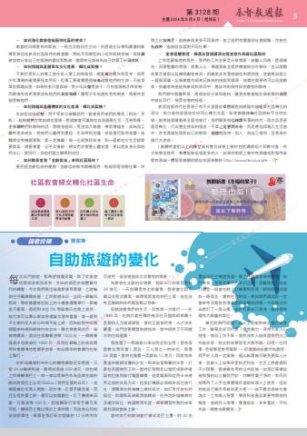 http://ChristianWeekly.net5 第 3128 期 主曆 2024 年 8 月 4 日(禮拜日)• 如何強化教會信徒服侍社區的使命 ?教會的目標要有時間表、一致性及階段性方向。先透過主日學和講壇的教導更新信徒參與社區服侍的教會觀,開始不同類型的小組和吸納領袖,再鼓勵參加者分享自己在服務的嘗試和點滴,邀請弟兄姊妹為自己的事工祈禱交託。• 如何跨越與基層青年文化差異,轉化成契機 ?不要把青年人的事工當作成人事工的降階版,需要獨立運作和思考。與青少年溝通的確需要投其所好,但事工要確實透過神去改變他們的生命,不能單單從興趣出發。如果牧者只當保姆,青少年只會是孩子;只有當領袖才得領袖。而教會牧者更需要成為他們的屬靈導師,讓青少年知道牧者有期望,需要時就能管教他們。• 如何跨越與基層婦女的文化差異,轉化成契機 ?先放低信徒姿態,用平等身分接觸他們。教會善用她們的專長(例如:烹飪 ),能夠提供空間給婦女發揮。透過教會可讓婦女容易適應生活,互相照應。更帶領她們聆聽神的話,開辦查經班,受浸加入教會,學習傳福音,成為同工服侍更多婦女。使她們心靈得到重組,生命得到充權,使基層可服侍基層。接觸婦女有幾個要點:第一是尊嚴,每一位新移民來港,到一個新地方生活都需要勇氣,需要尊重、公平及接納。婦女們亦需要心靈支援,要以朋友身分與她們交心。要同行,與他們建立關係和信任。• 如何動員堂會「金齡信徒」參與社區服侍 ?要把握金齡信徒的優勢:金齡信徒較有動機服侍,較能同理弱勢社羣。時間上比較充足,能夠參與更多不同服侍,加上他們有豐富的社會經驗,性格也較成熟,能夠從容面對不同社羣。• 堂會信譽管理,機遇及發掘資源支援堂會作長線社區服侍上帝是募集者的角色,我們的工作主要是分享需要,鼓勵人回應。透過禱告,洞察聖靈的帶領,感動人心,傳遞異象並提供機會給合作夥伴,並以感動故事及會面以延續捐獻者參與。捐獻者非常重視誠信和透明度。堂會應該建立一個資源庫,記錄教會內部弟兄姊妹的技能和資源,這樣在需要時可以迅速動員。捐獻者希望能夠參與到項目中,應該時刻保持與捐贈者的聯絡。我們期待聖靈帶領,透過這些分享和連結,讓更多教會能在做新事的過程中彼此同行,領受倍增的祝福。感恩這個時代在香港已有不少基督徒羣體擁抱結網協作倍增及社區轉化的理念,致力連結基督徒伙伴同心轉化社區。盼望教關作為社區網絡平台的先鋒,能將這個運動更全面地推行。我們願意相信神蹟奇事的時代,再次反思甚麼是轉化,行出整全使命的福音,不單止是宣講教義,而是將信仰融入生活當中,常常真誠地面對自己的軟弱,積極地與神、與人、與自己復和,並委身於踐行大使命。( 教關將會把以上的課堂資料整合成網上教材包括講員短片和教材套,供大家學習使用,希望能夠祝福更多的人。如果你對網上教材有興趣或對服侍貧窮有意向,請留意教關的網站或直接聯絡 http://www.hkcnp.org.hk。)自助旅遊的變化讀者投稿每次出門旅遊,都希望增廣見聞,除了從旅遊地點吸收新訊息外,外出的過程亦能體驗時代的轉變。今次我們飛往瑞典斯德哥爾摩,上遊輪前往芬蘭赫爾新基,上岸旅遊半日,坐同一郵輪回斯城,學術會議就在船上的十樓會議層舉行。郵輪並不豪華,酒吧和卡拉 OK 等娛樂只在晚上提供,故大家可以專心參加各場論文發布會議,唯一感到不方便的是大部分時間不能上網,因為船程中段兩個國家的通訊網絡均告空白。聽主辦當局表示,瑞典物價高,酒店住宿動輒港幣 1500 元,一頓晚餐連酒水也需接近 1000 元,反而在郵輪上的食宿費用和會議場地租賃更合算,故此隔年的會議均在船上舉行。從斯城機場到市中心的機場鐵路近年開通,只需 20 分鐘便到達,費用卻高達 250 港元。試在網上找尋機場巴士,有一家以青綠色作為品牌主調的歐洲跨境巴士公司 FlixBus(我們至愛的公司),由德國幾位年青人開創,班次準、訂票手續容易,而且全程免費上網,還可以加錢劃位。訂了機場來回票,只需港幣 100 元。因過關取行李等手續可長可短,機場巴士難以預計上車時間;而這家公司的安排具彈性,車票在預訂班次前後的 12 小時內均可使用,這項措施貼合消費者的需要。為節省在北歐的交通費,假如出行的單程票為28 港元,一天前購買有七折優惠,我便會立即下載公交程式購票。能跨境買當地的巴士票,這在沒有互聯網的時代簡直難以想像。科技改變我們的生活,回想第一次遠行——於1990 年,在統計處任職時被派往英國南部修讀十星期的人力資源課程,當時正值移民潮,人才流失嚴重。出門首要購買旅遊指南,當中提供了不同檔次的住宿建議。我挑選了一間倫敦火車站附近的女青(香港基督教女青年會)酒店,三人房之一的床位,房價28 英鎊,當時兌換價一英鎊為 13 港元,同房有來看溫布頓網球賽的少女,和來自愛爾蘭的文青,打算在英國物色工作。當時訂房間是以電話或郵件確認有位後到銀行電匯繳費,這是電郵和信用卡未通用之前的交易方式。從前訂機票必須親身前往旅行社,請職員在終端機上尋找班次,如訂青年旅社的宿位,則需到石硤尾青旅總部,在特定終端機尋找及確定宿位,辦國際青年證,還要購買特製的床單連枕頭袋套裝上路。當時流行的歐洲旅行模式是巴士團,約 30 名團友坐巴士暢遊各國,晚上住宿露營車的營地,自行煮食,是青年學子的