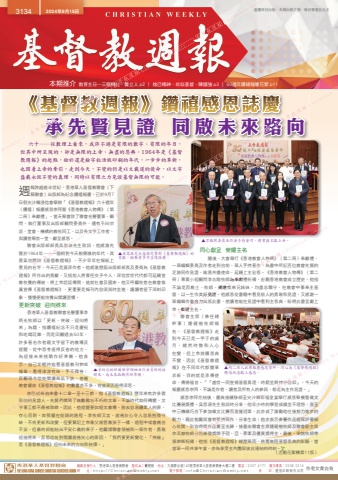 編輯及發行人:香港華人基督教聯會 督印人:鍾健楷 地址:九龍聯合道140號香港華人基督教聯會大樓二樓 電話:2337 4171 圖文傳真:2338 2314網 址:http://ChristianWeekly.net 電子郵箱:[email protected] 承 印:國強印刷制作公司 作者文責自負3134 2024年9月15日 逢禮拜日出版.本期出紙三張.每份零售五元正本期推介 教育主日—三個轉化.龔立人 p2 ∣ 捨己精神.肖似基督.陳國強 p3 ∣ 60週年鑽禧報慶花絮 p11六十──從數理上看來,或許不過是有限的數字、有限的年日,但其中所呈現的,卻是無限的上帝、無盡的恩典。1964年是《基督教週報》的起點,始於還是檢字粒活版印刷的年代,一步步的革新,也因着上帝的牽引,走到今天,不變的仍是以文載道的使命,以文字盛載永恆不變的真理,同時以有限之力見證基督無限的可能。《基督教週報》鑽禧感恩誌慶承先賢見證 同啟未來路向週報跨越逾半世紀,香港華人基督教聯會(下稱聯會)出版部為紀念鑽禧報慶,已於9月7日假尖沙嘴浸信會舉辦「《基督教週報》六十週年(鑽禧)報慶感恩崇拜暨《香港教會人物傳》(第二冊)奉獻禮」。當天聚會除了聯會名譽董事、顧問、執行董事及出版部顧問委員外,還有不同宗派、堂會、機構的教牧同工,以及各文字工作者,與讀者聚首一堂,獻呈感恩。聯會出版部部長吳思源先生致詞,他感激先賢於1964年──一個相對今天較簡樸的年代,具勇氣地開辦《基督教週報》,不少早年在報紙上看見的名字,今天已是資深作者。他感激歷屆出版部部長及委員為《基督教週報》所作出的貢獻,又指前人將責任交予今人,深信世世代代都可延續宣教牧養的傳統,將上帝話語傳開,造就社會及國家。他又呼籲牧者在教會推廣宣傳《基督教週報》,更重要是報刊內容須與時並進,讓讀者留下深刻印象,慢慢便能培養出閱讀習慣。更新突破 迎向將來香港華人基督教聯會名譽董事李炳光牧師以「更新、突破、迎向將來」為題,指鑽禧紀念不只是慶祝和吃喝玩樂,而是回顧過去60年,許多著名作者藉文字留下的教導及提醒,從中思考值得反省的地方,為迎接未來挑戰作好準備。他表示,自己年輕時追看基督教刊物或報章,看得津津有味,手不釋卷;反觀現今信徒閱讀風氣下跌,普遍教會擺放《基督教週報》的數量亦不多,背後原因值得深思。他引述希伯來書十二章一至十三節,指《基督教週報》歷年來有許多雲彩般的見證人,先賢們撰寫了無數難忘不朽的文章,不論時代如何轉變,文字事工都不應被取締。因此,他提醒要如經文教導,脫去容易纏累人的罪,存心忍耐,奔那擺在前頭的路程。李牧師又言,疲倦灰心令人容易抱殘守缺,不肯更新和改變,但要緊記上帝像父親管教孩子一樣,過程中或會痛苦不安,但最終卻能結出平安仁義的果子。他籲請聯會領袖和一眾作者,勇敢迎接將來,反思信徒對閱讀疲倦灰心的原因,「我們要更新變化,『突破』是《基督教週報》迎向未來的方向和抉擇。」同心獻呈 榮耀主名隨後,大會舉行《香港教會人物傳》(第二冊)奉獻禮,一眾編輯委員及作者走到台前,眾人手持著作,為書中所記百位教會先賢的足跡同作見證,喻意共擔使命,延續上主宏恩。《香港教會人物傳》(第二冊)專責小組顧問李志剛牧師為奉獻禮祈禱,宏觀香港教會成立歷史,他指不論是西教士、牧師、傳道或弟兄姊妹,均盡忠職守,在教會中事奉主基督,以一生作美好見證。他感恩從書籍中看見前人的勇敢和見證,又感謝一眾編輯作者合力出版此書,使讀者能在見證中看到主恩典,盼將此書呈獻上帝,榮耀主名。聯會主席(兼任總幹事)鍾健楷牧師報告,《基督教週報》走到今天已是一甲子的歲月,縱然時勢和人心在變,但上帝救贖恩典不變,因此《基督教週報》在不同年代都變革求新,目的就是承傳使命,傳揚福音。「『盛世一同宣揚基督真理,時窮並肩持守信仰』,今天的報慶感恩崇拜,不論是作者、讀者及所有人的參與,都是為主作見證。」感恩崇拜完結後,慶典接續移師至尖沙嘴彩福皇宴舉行感恩聚餐暨徵文比賽頒獎禮。吳思源先生致詞時分享,他年少時的學習成績並不理想,直至中三機緣巧合下參加徵文比賽而喜獲冠軍,此亦成了激勵他往後努力進步的動力,藉此勉勵與會者堅持寫作,分享生命;他亦表示參賽作品經眾評審細心批閱,形容得獎作品實至名歸,接着由聯會主席鍾健楷牧師及聯會副主席余英嶽牧師分別頒發獎牌予冠、亞、季軍及優異獎得主。最後,梁銘牧師帶領謝飯祝禱,他指《基督教週報》縱歷風雨,依舊無阻基督恩典的彰顯,當會眾一同共享午宴,亦為享受主內團契彼此連結的時刻。(活動花絮轉第11版)▲李炳光牧師籲聯會領袖及作者勇敢迎接將來,為未來挑戰作好準備。▲吳思源先生感謝先賢對《基督教週報》的貢獻,盼教會多作宣傳推廣。▲約二百人出席報慶感恩崇拜,同心為《基督教週報》鑽禧紀念獻上感恩。▲眾編輯委員及作者手持著作,將書籍呈獻上帝。 Weekly 基督教週報 承先賢見證 同啟未來路向 Christian Weekly 教育主日—三個轉化.龔立人 p2 ∣ 捨己精神.肖似基督.陳國強 p3 ∣ 60週年鑽禧報慶花絮 p11《基督教週報》鑽禧感恩誌慶承先賢見證 同啟未來路向教育主日—三個轉化.龔立人 p2 ∣ 捨己精神.肖似基督.陳國強 p3 ∣ 60週年鑽禧報慶花絮 p11 基督教週報 Christian Weekly 基督教週報 Christian Weeklyn Weekly 看見的名字,今天已是資深作者。他感激