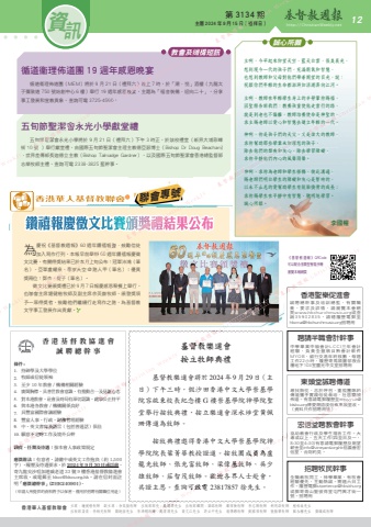 香港華人基督教聯會第 3134 期 主曆 2024 年 9 月 15 日(禮拜日) http://ChristianWeekly.net 資 12訊主席:鍾健楷牧師 副主席:余英嶽牧師 出版部部長:吳思源先生 出版部顧問:梁銘牧師 鄺偉衡牧師 李志剛牧師 胡明添牧師 植栢燊先生 出版部委員:李炳光牧師 關銳煊先生 李鴻標牧師 吳渭濱先生 黃文江先生 許立中先生 翁傳鏗牧師 劉國偉牧師 張振華牧師 蘇永權先生 關鎮威牧師教會及機構短訊《 基 督 教 週 報 》 QRCode可以配合各類型智能手機瀏覽本報網頁主啊,今早起來仰望天空,藍天白雲,很美晨光,想到現今一代的孩子們,充滿朝氣和智慧,也想到教師和父母對他們帶着期望的目光,說:祝願你們年輕的生命都澎湃如活潮奔向江河。主啊,教師在年輕學生身上的辛勞蒙祢賜福,因聖經告訴我們:教養孩童使他走當行的路,就是到老也不偏離,教師培養使命是神聖的,求主賜老師以愛心和智慧去建立年輕的一代。神啊,祢是孩子們的天父、又是偉大的教師,求祢幫助那些學業未如理想的孩子,除去他們的頹喪和灰心,除去學習障礙,求祢平靜他們內心的風聲雨聲。神啊,求祢為老師和學生搭橋,彼此溝通,賜老師們明白學生的障礙和灰心是暫時的,以永不止息的愛幫助學生有脫胎換骨的成長;求祢賜學生在平靜中有智慧、聰明地學習。誠心所願。李國權誠心所願循道衞理佈道團 19 週年感恩晚宴循道衞理佈道團(MEM)將於 9 月 21 日(禮拜六)晚上 7 時,於「潮·悅」酒樓(九龍太子彌敦道 750 號始創中心6樓)舉行 19 週年感恩晚宴,主題為「福音裝備·迎向二十」,分享事工發展和宣教異象,查詢可電 3725-4566。五旬節聖潔會永光小學獻堂禮五旬節聖潔會永光小學將於 9 月 21 日(禮拜六)下午 3 時正,於該校禮堂(新界大埔彩蝶街 10 號 )舉行獻堂禮,由國際五旬節聖潔會主理主教德亞瑟博士(Bishop Dr Doug Beacham)、世界差傳部長迦德立主教(Bishop Talmadge Gardner),以及國際五旬節聖潔會香港總監督郭志榮牧師主禮,查詢可電 2338-3825 藍幹事。聯會專號鑽禧報慶徵文比賽頒獎禮結果公布為慶祝《基督教週報》60 週年鑽禧報慶,鼓勵信徒加入寫作行列,本報早前舉辦 60 週年鑽禧報慶徵文比賽,有關得獎結果已於本月上旬公布:冠軍沛鴻(筆名)、亞軍盧耀泉、季軍天空 @ 路人甲(筆名);優異獎兩位:鄧杰、提子(筆名)。徵文比賽頒獎禮已於9月7日報慶感恩聚餐上舉行,由聯會主席鍾健楷牧師及副主席余英嶽牧師,頒發獎項予一眾得獎者,鼓勵他們繼續行走寫作之路,為基督教文字事工發展作出貢獻。基督教樂道會按立牧師典禮 基督教樂道會將於2024年9月29日(主日)下午三時,假沙田香港中文大學崇基學院容啟東校長紀念樓 G 樓崇基學院神學院聖堂舉行按牧典禮,按立樂道會深水埗堂黄佩珊傳道為牧師。 按牧典禮邀得香港中文大學崇基學院神學院院長葉菁華教授證道。按牧團成員為盧龍光牧師、張光富牧師、梁偉基牧師、吳少雄牧師、莊智茂牧師。歡迎各界人士赴會,共證主恩。查詢可致電 23817857 徐先生。香 港 基 督 教 協 進 會誠 聘 總 幹 事條件 :1. 持神學及大學學位2. 牧師或信徒領袖3. 至少 10 年教會/機構相關經驗4. 廣闊胸襟,具普世教會意識,有推動合一及見証心志5. 對本港教會、社會及時局有深切認識,處事公正持平6. 與本港各教會/機構關係良好7. 具豐富國際會議經驗8. 豐富人事、行政、財務管理經驗9. 中、英文書寫及語言(包括普通話)俱佳10. 願意不定時工作及境外公幹職責、任期及待遇:按本會人事政策規定應徵辦法:有意者,請備中或英文工作抱負(約 1,500字)、履歷及待遇要求,於 2024 年 9 月 30 日或以前,寄九龍尖沙咀加連威老道 33 號 9 樓香港基督教協進會主席收,或電郵至 [email protected]。請在信封面註明「應徵總幹事」(#HR240901)。(申請人所提供的資料將予以保密,僅用於招聘有關職位用途)東頭堂誠聘傳道尋找熱忱、忠於呼召、重視團隊的傳道攜手實踐信徒栽培、社區關懷佈道。有意請電郵履歷至[email protected]博愛潮語浸信會東頭堂收。(資料只作招聘用途)聘請半職會計幹事中學畢業中級會計LCCI三年會計經驗,負責全盤帳目熟會計軟件MYOB,銀行交易年終核數,每週工作22小時,履歷寄馬頭圍邨夜合樓地下103室靈光中文堂招聘用宏信堂聘教會幹事協助教會行政及學生福音工作。大專或以上,五天工作(四至日及一,8:30至4:30)有意請電郵履歷及期望薪金至[email protected]信義會宏信堂,合則約見。香港聖樂促進會誠聘總幹事及培訓總監,有關職責、要求及詳情,請瀏覽本會網頁www.hkchurchmusic.org或查詢35902835,請繕履歷電郵至[email protected]招聘用招聘牧民幹事全職教牧同工,神學畢業,有牧會經驗優先,主動熱誠。需週六日工作。履歷電郵[email protected]或郵寄青山聖彼得堂屯門興才街一號。招聘用 Weekly 街 10 號 )舉行獻堂禮,由國際五旬節聖潔會主理主教德亞瑟博士(Bishop、世界差傳部長迦德立主教(Bishop基督教週報五旬節聖潔會永光小學獻堂禮五旬節聖潔會永光小學將於 9 月 21 日(禮拜六)下午 3 時正,於該校禮堂(新界大埔彩蝶街 10 號 )舉行獻堂禮,由國際五旬節聖潔會主理主教德亞瑟博士(BishopChristian Weekly 子彌敦道 750 號始創中心6樓)舉行 19 週年感恩晚宴,主題為「福音裝備·迎向二十」,分享事工發展和宣教異象,查詢可電 3725-4566。五旬節聖潔會永光小學獻堂禮基督教週報循道衞理佈道團(MEM)將於 9 月 21 日(禮