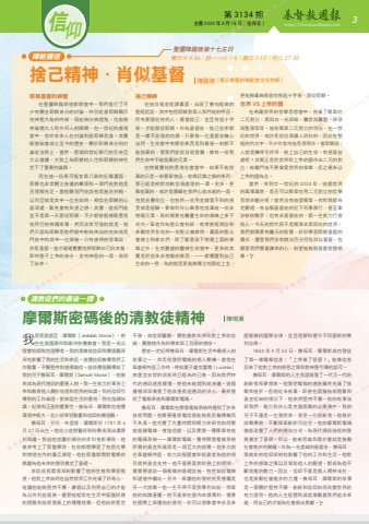 第 3134 期 主曆 2024 年 9 月 15 日(禮拜日) http://ChristianWeekly.net 信 3仰摩爾斯密碼後的清教徒精神我是耶底底亞·摩爾斯(Jedidiah Morse),終生在美國康州和麻州牧養教會。我是一名公理會牧師和地理學者。我的清教徒信仰和價值觀深深地影響了我的生活和家庭。這種信仰教導我們工作勤奮、不懈堅持和道德誠信。這些價值觀傳給了我的兒子撒母耳.摩爾斯(Samuel Morse),他後來成為現代通訊的重要人物。我一生致力於事奉上帝和教育他人關於地理和世界的知識。我的信仰引導我的工作倫理,對家庭生活的重視,我也強調知識、紀律和正直的重要性。撒母耳.摩爾斯在這種環境中長大,從小就學習勤奮和信仰的價值觀。撒母耳.芬利.布里斯·摩爾斯於 1791 年 4月 27 日出生。他從小就對藝術和科學表現出濃厚的興趣。我送他就讀於麻州的菲利普斯學院,他後來考上了耶魯學院,在校期間學習了包括化學和物理在內的廣泛課程。他在耶魯期間對電學的興趣為他未來的發明奠定了基礎。家庭成長環境深刻影響了他的性格和學習態度。他對上帝如何在自然世界工作充滿了好奇心,這讓他能夠堅持不懈、謙遜以及利用自己的才能為公共利益服務。儘管他經常在生活中面臨財務的困難和技術發展上的種種挑戰,但他始終堅定不移,由信仰驅動,懷抱着使命感和對上帝的忠誠,實踐他作為科學家與工程師的使命。歷史一定記得撒母耳.摩爾斯生活中最感人的故事之一,就是他發明電報的感人動機。當他在華盛頓特區工作時,得知妻子盧克蕾霞(Lucretia)病重並去世的消息時已經為時已晚,因為我們時代的通訊速度緩慢,使他未能趕到她身邊。這個遺憾深深激發了他改善長途通訊的決心,最終發明了電報系統和摩爾斯電碼。撒母耳.摩爾斯在開發電報系統時遇到了許多技術問題。他需要確保電信號能夠長距離傳輸而不失真。他花費了大量時間和精力來研究如何製造絕緣電線、增強信號,以及開發一種簡單有效的電碼系統——摩爾斯電碼。獲得開發電報系統所需的資金和資源是一項巨大的挑戰。他多次前往華盛頓特區,努力說服國會和投資者為他的項目提供資金支持。他不僅要面對財務上的困境,還需要建設一個複雜的基礎設施,包括鋪設電線和建造中繼站。另外,保護他的發明免受侵權是另一大挑戰。他一生不得不面對專利糾紛,捍衛他的知識產權。他不僅要在國內申請專利,還要在國際上保護他的發明,你可以想像當中涉及多陳曉東清教徒們的最後一課聖靈降臨後第十七主日釋經講道 賽五十 4-9a;詩一一六 1-9;雅三 1-12;可八 27-38捨己精神.肖似基督耶穌基督的神聖在聖靈降臨期這節期當中,我們進行了不少有關主耶穌身分的討論,特別是當耶穌顯示祂神聖大能的時候,既能夠治病趕鬼,也能夠突破猶太人和外邦人的隔閡,在一世紀的處境當中,愈來愈多人在討論到底耶穌是誰。其實縱觀教會成立至今的歷史,關於耶穌身分的討論從沒停止,當然,透過四世紀舉行的尼吉亞大公會議,大致上為耶穌的人性和耶穌的神性定下了重要的論調。而在這一段馬可福音第八章的記載裏面,耶穌也非常關注身邊的羣眾和一眾門徒對他是否理解充足。當他聽見門徒說祂是施洗約翰、以利亞或是其中一位先知時,相信在耶穌的心底深處,難免會有失望之感。其實,這些門徒並不是第一天跟從耶穌,不少都曾經親眼看見祂所行的神蹟奇事,然而非常可惜的就是,他們只認為耶穌是他們眼中較為突出的先知或是門徒中的其中一位領袖。只有彼得的答案說:你是基督。這才確確實實地將耶穌自己的本質,即時聖子上帝的身分,並祂神聖的一面,表明了出來。捨己精神在這段福音經課裏面,出現了幾句經典的聖經話語,其中包括耶穌對眾人和門徒的呼召,所有要跟從祂的人,應當捨己,並且背起十字架,才能跟從耶穌。作為基督徒,捨己從來都是一樣不容易的功課,只要每一位基督徒撫心自問,生命當中有哪些東西是到最後一刻都不能放棄的,那我們就很容易發覺,總有一些我們生命中不能捨棄的元素。在物質豐裕的香港社會當中,如果不能捨棄的只是一些奢華物品、吃喝玩樂之類的東西,那已經是相對地較容易處理的一環。更多、更難捨棄的,或許是隱藏在我們心底深處的一面,包括名譽地位,也包括一些用金錢買不到的感受或是經驗。要做到甘心樂意地捨棄這一些非物質元素,真的需要在屬靈生命的操練上多下苦功。筆者作為聖公會牧師,有幸曾經探訪和參觀世界各地的一些聖公會修院,裏面的聖公會修士和修女們,除了願意放下物質上面的享樂之外,在其豐盛的靈修生命當中,更多的其實是把很多非物質的東西,一一都擱置到自己生命的一旁,為的就是更能夠專注地跟從上主,陳國強(聖公會聖約翰座堂主任牧師)麼複雜的國際法律,並且理解和遵守不同國家的專利法律。1844 年 5 月 24 日,撒母耳.摩爾斯成功發送了第一條電報信息:「上帝做了甚麼?」這條信息反映了他對上帝的感恩之情和對神聖引導的認可。撒母耳·摩爾斯的人生見證啟發了一代又一代的創新者和夢想家。他發明電報的道路雖然充滿了挑戰和挫折。但他從未放棄,即使在面臨技術困難和資金短缺的情況下,他依然堅持不懈。他的故事告訴我們,毅力和決心是克服困難的必要條件。我的兒子不僅是一位發明家,更是一位創新者。他敢於挑戰傳統,不斷探索新的可能性。