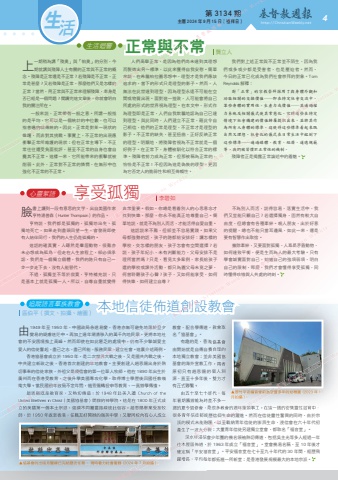 第 3134 期 主曆 2024 年 9 月 15 日(禮拜日) http://ChristianWeekly.net 生 4活上一期稍為講「殘奧」與「帕奧」的分別,今期就講與殘障人士有關的正常與不正常的概念。殘障是正常還是不正常?若殘障是不正常,正常是甚麼?又若殘障是正常,那麼他們又是怎樣的正常?當然,用正常與不正常來理解殘障,本身是否已經是一個問題?閱讀完這文章後,你就會明白我的關注所在。一般來說,正常帶有一般之意。所謂一般指的是平均,它可以是一個統計的中位數,也可以指普遍的或傳統的。因此,正常是對某一現狀的維護,而非對其挑戰。事實上,不正常的出現應衝擊正常所維護的現狀;但在正常主導下,不正常往往遭受負面批評,甚至不正常的自身也會自覺其不正常。這樣一來,它所能帶來的衝擊就被削弱。此外,正常對不正常的憐憫,在無形中也強化不正常的不正常。人們高舉正常,是因為他們尚未達到其理想而製造出另一標準,以此來獲得自我安慰。簡單來說,在希臘柏拉圖思想中,理型才是我們應該追求的,當下的形式只是理型的影子。然而,人無法在此世達到理型,因為理型永遠不可能在空間或物質出現。面對這一挫敗,人可能會將自己所處的形式的世界視為理型。在本文中,形式作為理型即是正常,人們自我欺騙地認為自己已達到理型。與此同時,人們建立不正常,藉此令自己相信,他們的正常是理型,不正常才是理型的影子。不正常的缺失,甚至扭曲,正好反映正常的理型。明顯地,將殘障者視為不正常就是一個好例子。在正常下,身體被馴化以符合正常的標準。殘障者努力成為正常,但那被稱為正常的,恰恰是不正常!不但因為這是偽裝的理型,更因為它否定人的脆弱性和相互倚賴性。我們對上述正常與不正常並不陌生,因為我們或多或少都是受害者,也是壓迫者。然而,今日的正常已化成為我們社會崇拜的對象。Tom Reynolds 解釋:對「正常」的宗教崇拜採用了與身體外觀和功能相關的交換價值——即在特定社會交流中,某些身體的實用性、生產力或價值——並通過權力系統及相關儀式使其常態化。它將這些在特定情境下社會構建的價值歸屬提取出來,並將其作為所有人身體的標準。這使得這些標準看起來既自然又理想。社會化的儀式在日常生活中銘刻下這些標準——通過媒體、教育、經濟、道德規範等,我們被習慣於正常性的機制。殘障者正是揭露正常論述中的着魅。▲協基會的出版及醫療已完結歷史任務, 現時着力社會服務 (2024 年 7 月拍攝 )。由1949 年至 1950 年,中國政局急速易變,香港亦無可避免地落於旦夕變易的疑慮迷茫中。再加上連年潮湧移入的萬千內地民眾,更將本地社會的不安困境推上高峰。然而即使在如此窘乏的處境中,仍有不少摯誠愛主愛人的信徒奮起,盡己之志,盡己所能,服務民眾,建立社會。這裏介述兩例。香港協基會成立於 1950 年,是二次世界大戰之後,又是國共內戰之後、中共建立新政之後,香港首次創建的本地教會。主要創建人趙恩賜出身於熱切事奉的信徒家族,外祖父是浸信會的第一位華人牧師。他在 1890 年出生於廣州而在香港受教育,之後升學美國專攻化學,取得博士學歷後回國任教嶺南大學。當民國初年政局不定年間,趙恩賜轉投中等教育,一直辦學傳道。趙恩賜既是教育家,又熱切傳道;於 1948 年赴美入讀 Church of the United Brethren in Christ ( 美國協基會 ) 開辦的神學院。這是在 1800 年正式成立的美國第一個本土宗派,強調不同屬靈路線彼此包容。趙恩賜畢業受按牧師,於 1950 年返至香港,任職友好開辦的嶺英中學;又聯同校內有心人成立教會,配合學傳道,教會取名「協基會」。有趣的是,香港協基會由開始就是自傳自養自理的本地獨立教會;並非美國協基會的海外宣教工作。兩者原初只有趙恩賜的個人淵源,直至十多年後,雙方才有正式聯繫。由五十至七十年代,每年暑期籌辦維為時差不多一週的夏令退修會,是很多教會的週年重頭事工。在這一週的密集靈性滋育中,很多青年信徒都經歷信仰生命的躍進。然而在信徒靈性奮興的同時,由於宗派的模式未能融匯,以至載納青年信徒的澎湃生命,浸信會在六十年代初產生了一波大分裂;大量青年信徒另建獨立堂會,都取名「福音堂」。深水埗浸信會少年團的幾名領袖熱切傳道,包括吳主光等多人經過一年往木屋區佈道,於 1963 年成立「福音堂」。堂會幾易名稱,至 10 年後才確定稱「平安福音堂」。平安福音堂在七十至九十年代的 30 年間,經歷飛躍增長,平均每年都拓植一所新堂;是香港發展規模最大的本地宗派。正常與不常享受孤獨 臉書上讀到一段有意思的文字,出自美國作家亨特湯普森(Hunter Thompson)的作品。亨特說,我們都是孤獨的,孤獨地出生、孤獨地死亡,如果走到盡頭回望一生,會發現即使有人結伴同行,我們的人生仍是孤獨的。這話的確真實,人雖然是羣居動物,很難亦未必想成為孤島,但走在人生旅程上,卻必須承認,我們是一個獨立個體,我們的路只有自己一步一步走下去,沒有人能替代。不過,孤獨並不等於寂寞,亨特補充說,只是基本上就是孤獨一人。所以,自尊自重就變得非常重要。假如,你總是看着別人的心思意念才找到快樂,那麼,你永不能真正地尊重自己。簡單地說,就是不為別人而活,才能活得自愛自重。這話說來不難,但卻並不容易實踐。如果父母都強勢的話,孩子的路都給安排好:讀怎樣的學校,交