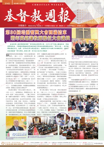 編輯及發行人:香港華人基督教聯會 督印人:鍾健楷 地址:九龍聯合道140號香港華人基督教聯會大樓二樓 電話:2337 4171 圖文傳真:2338 2314網 址:http://ChristianWeekly.net 電子郵箱:[email protected] 承 印:國強印刷制作公司 作者文責自負3143 2024年11月17日 逢禮拜日出版.本期出紙二張半.每份零售五元正本期推介 順流生命河.范晋豪 p2 ∣伯駕醫生的最後一課.陳曉東 p3 ∣做個智慧老人.李碧如 p6由香港華人基督教聯會舉辦「第30屆培靈奮興大會」已於11月7日晚上圓滿結束,恩福神學院院長、中國基督教播道會恩福堂創堂及榮休牧師蘇穎智牧師以「明日之後──啟示錄釋經講道系列」為題,於第四至第七晚培靈會上,繼續揭示其中的默示和種種異象,勉勵信徒在地抱持「新天新地」盼望之時,亦不忘以生命分享福音。蘇穎智牧師在第四晚講論「明日之後的聖城及聖民」(啟十-十三)。談及將來之事,他直言此亦基於現在和過去;若非過去和現在所作的,未來也不可能出現如斯境況。眼見俄烏戰爭、以巴衝突不斷,他鼓勵會眾反思如何藉此傳遞福音,並從聖經的預言、歷史的軌跡回看今天。昔日聖城被毀,正正體現了但以理先知的預言,並且進一步肯定此為末世所定的結局(但九26-27)。然而,他提及啟示錄第十一章開首即宣告上帝要保護殿和祭壇,保護屬祂的地方。而聖殿以外,則已預言會遭外邦人踐踏四十二個月,亦即「一七之半」及六號之始(啟十一2);至於聖民方面,經文可見上帝同樣應許保守屬於祂的人(啟十一11)。蘇牧師又指,末世迫害聖徒的罪魁為假先知(啟十三),且是最難以防範的,故提醒信徒應警醒追求真道,裝備自己以防落入異端之手。第五晚分題為「明日之後的七碗之災」(啟十四-十六),他明確指出,耶穌再來之先,會出現一連串「末後必成的事」,乃屬上帝的計畫。他續引述羅馬書十一章所記,計畫的奧祕在於外邦人的數目添滿,並以色列全家得救;與啟示錄中所言,各國、各族、各派的人,均會得着永遠的福音,是相互呼應的,可見上帝在最後階段仍給予機會,從沒忽略任何一人。在啟示錄中,天上、地下所發生的事交替出現,雖七碗之災預表在地的災難,亦不時有在天的情景穿插其中。他提及當世界面臨終結,天災人禍將日趨嚴重,惟多讀聖經親近上帝,才能活在與上帝的關▲聯會主席鍾健楷牧師(左)、副主席余英嶽牧師(右)代表聯會,向講員蘇穎智牧師致送謝函和紀念品。係中,他籲會眾以屬天的眼光觀看地上的事,地上縱是窮途,也非必然成末路。第六晚分題為「明日之後罪魁禍首的結局」(啟十七-二十3),蘇牧師以耶利米書五十至五十一章,對比啟示錄十七至十八章,指前者為巴比倫傾覆毀壞的預言,後者則為應驗。「她(巴比倫)的毀滅應驗耶利米書五十至五十一章,非常清楚……耶利米書講『不再興起』,啟示錄則講『決不能再見』,先後七次表達出來。」他又強調,上帝的審判會臨到所有罪魁禍首身上,獸和假先知同被擒拿,將被扔進燒着硫磺的火湖裏(十九20)。此外,上帝亦將審判撒但(又名為指控者、譭謗者、敵對者),牠將被扔在無底坑裏,無法再迷惑信徒。因此,他引領信徒反思誰主明天,以致今天能服侍主,將上帝的道和愛傳給他人。第七晚分題為「明日之後:更美及最美的家」(啟二十4-二十二21),蘇牧師開首提及現今社會撕裂的局勢,不難看見人的自我中心、仇恨和野心,委實沒有人可以壓制,惟有上帝才是出路,方可建立永恆的新天新地。有關末世論的爭議,他表示啟示錄二十章出現多次「一千年」,但他解釋,聖經中的一千有「完完全全」之意,又提到彼得後書所指,「主看一日如千年,千年如一日」,可見經文的「一千年」只是隱喻,他遂以「千禧年國度」形容之。而啟示錄十九章記載耶穌再來的日子,千禧年國卻在二十章,第30屆培靈奮興大會圓滿結束明年高銘謙牧師擔任大會講員▲今屆培靈奮興大會主席余英嶽牧師代表聯會致謝。故可推論千禧年是發生在耶穌再來與新天新地之間。論及千禧年與新天新地的分別,他指出千禧年屬過渡時期,人仍然有罪,此期間可操練如何與上帝一同管理大地;而新天新地中,所有人則是不朽的,且完全無罪,也沒有痛苦和死亡。蘇牧師坦言,他非常期待此「最美的家」,亦希望各信徒能彼此激勵,把握時機,將福音傳予未信的人。本屆培靈奮興大會7晚合共3236人次出席,平均每晚同步觀看直播人數約2500人,講道錄影可於聯會網站(www.hkcccu.org.hk)免費重溫。至於下屆培靈奮興大會將於2025年11月1至7日,一連7晚假尖沙嘴浸信會舉行,講員為建道神學院副院長高銘謙牧師。▲會眾憑出席培靈會後獲得之蓋印,領取由大會送出《以巴世紀之冤仇,有出路嗎?》一書。▲今屆聚會人數眾多,禮堂及閣樓均座無虛席。▲手語傳譯員即時傳譯講道信息。 Weekly 基督教週報 Christian Weekly 基督教週報 Christian Weekly 基督教週報 Christian Weeklyn Weekly 基督教週報 Christian Weekly 基督教週報 Christian Weekly 基督教週報 Christian Weekly 基督教週報 Christian W基督教週報 Christian Weekly 基督教週報 Christian Weekly 基督教週報 Christian Weekly 基督教週報 Christian Weekly 基基督教週報 Christian Weekly 基督教週報 Christian Weekly 基督教週報 Christian We