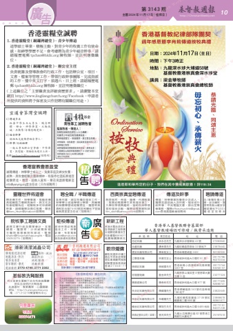 第 3143 期 主曆 2024年 11月 17日(禮拜日) http://ChristianWeekly.net 廣 10告香港華人基督教聯會墓園部 華人基督教墳場認可修墳/執骨承造商承 造 商 東主姓名 地 址 電 話忠記石廠 余永忠先生 九龍深水埗福華街 43 號 27280840合盛石廠 譚承東先生 九龍紅磡溫思勞街 33 號地下 23878440德安石廠有限公司 陳紫梃女士 香港柴灣連城道 240C 90192000江聯基石廠 林潔芳女士 香港域多利道大口環村 61 號 2817579690270334張碩記石廠 張經國先生 香港柴灣小西灣曉翠苑雅翠閣3207 室28173744 93058157百福營造廠 藍金泉先生 九龍慈雲山蒲英里 8 號慈華大廈五樓 D 座 23277324陳諏建築公司 陳希和先生 香港域多利道大口環 977 號 28177405 92698741朱炎記石廠有限公司 陳鎮藩先生 香港德輔道西 343 號均益商場16B 地下 23822445朱新記石廠有限公司 朱耀權先生 九龍紅磡馬頭圍道 37-39 號紅磡廣場二樓 B86 舖23959678 90961877賴金記石廠有限公司 陳冠生先生 香港域多利道大口環 6485 地段 2817316194221238李煥記雲石公司 ( 梁華 ) 曾兆祥先生 九龍土瓜灣譚公道 82 號香港工商銀行大廈地下 25197618《基督教週報》廣告則例1. 凡有違基督教信仰或信徒生活原則之廣告概不刊登。2. 私人公告或啟事,須有其所屬教會正式公函證明。3. 訂婚、結婚等廣告,須有教會公函或堂主任證明。4. 教會或機構之公告或啟事,須附有正式公函。5. 本報編輯及編輯業務小組有權審核所有廣告內容,予以修改或拒絕刊登,而不必申述任何理由。6. 廣告內容由刊登廣告之客戶負全部責任。7. 歧視條例問題:根據香港特別行政區政府現行的條例《性別歧視條例》及《殘疾歧視條例》,招聘廣告不能刊登以下帶有歧視成分條文:a. 僱員的性別要求;b. 僱員的婚姻狀態;c. 僱員的身體或精神上的殘障;d. 僱員的年齡要求。8. 根據《個人資料(私隱)條例》的《人力資源管理實務守則》訂明,僱主如在招聘廣告中直接要求求職者遞交個人資料,僱主必須述明自己的身分及有關資料的使用目的。9. 凡涉及「離職」的廣告及啟事,一律不予刊登。10. 凡涉及保險、財務類之「聘請」廣告,須由有關機構/公司直接刊登,並須附該機構/公司函件,以資證明。11. 來稿規格:分類小廣告由本報根據客戶之文字稿代為排字,格式以本報為準。普通廣告稿件必須電郵至 [email protected]。(所有稿件必須於刊出日期前十日遞交。本報逢禮拜日出版,如有更改另行公告。)刊登廣告可致電23374171香港靈糧堂誠聘1. 香港靈糧堂 ( 銅鑼灣總堂 ) - 青少年傳道道學碩士畢業,積極主動,對青少年的牧養工作有使命感。如神學學歷不足,會考慮聘為青少年福音幹事。請繕履歷電郵 [email protected] 陳牧師,並註明應徵職位。2. 香港靈糧堂 ( 銅鑼灣總堂 ) - 辦公室主任負責統籌及督導教會的行政工作,包括辦公室、項目、文書、檔案等管理工作。帶領行政幹事團隊,完成指派的工作。懂中英文打字,須週六、日上班。請繕履歷電郵 [email protected] 陳牧師,並註明應徵職位。( 上述職位之「主要職責及詳細資歷要求」,請瀏覽本堂網頁 http://www.lingliangchurch.org/Facebook。申請者所提供的資料將予保密及只作招聘有關職位用途。)宣道會荃灣堂誠聘1) 傳道多名 牧養中學生至大專生、職青群體、婦女。神學畢業,主動熱誠,具教導/音樂恩賜更佳。2) 福音幹事 協助及支援教會福音事工。3) 幹事/行政助理一般文書及辦公室事務,中學畢業,熟電腦,須輪值及週日上班。履歷[email protected](招聘用)新新工程承接水電油漆泥水各項裝修工程取價公道歡迎教會及主內肢體電90819077免費報價陳弟兄歡欣僱傭嚴格挑選菲印傭工適合不同家庭需要提供專業顧問服務經驗豐富服務真誠查詢21558177聘全職/半職傳道負責兒童、婦女牧養及福音工作。神學學士或道學碩士學歷,具輔導的相關學歷或經驗更佳。履歷寄葵涌和宜合道74-80號宜和樓地下宣道會葵涌堂堂主任收(招聘用)西貢崇真堂聘傳道熱衷敬拜、佈道、遍傳、代禱服事;推展幼稚園學生家長福音事工,入學校帶領興趣班。協助牧師帶領堂校福音活動。履歷請電郵鄒牧師[email protected]招聘用。香港宣教會恩盈堂誠聘傳道,神學學士或以上,負責家庭及婦女牧養,成熟、具牧會經驗及團隊精神,有服侍社區拓展福音經驗更佳。履歷、諮詢人資料、蒙召見證請電郵至[email protected]堂主任收(只作招聘用)聘請傳道全/兼職牧養小堂會,設功輔班,履歷寄馬鞍山耀安邨耀頌樓地下G003耀 頌 堂 招 聘 用 靈糧世界佈道會聘差傳主任,神學畢業,推動差傳具組織能力懂網頁操作,跨文化及牧會經驗為佳,經驗較多可申請總幹事,請繕履歷及兩位推薦,聯差會[email protected]招聘用院牧事工聘請文員處理文書行政及簡單會計,支援總務。履歷寄:沙田威爾斯親王醫院基督教院牧部收。電郵[email protected],電話35053275(招聘用)傳道及幹事傳道:神學畢業牧養青少及成人,履歷見證諮詢人及待遇。福音或行政幹事:中英電腦文書,辦公室聚會事務。履歷[email protected]香港真道教會招聘用駐校傳道部份時間幼稚園福音工作,神學訓練。有意電郵[email protected]姚牧師資料招聘用 Weekly 基督教週報 Christian Weekly 基督教週報 Christian Weekly 基督教週報 Christian Weeklyn Weekly 基督教週報 Christian Weekly 基督教週報 Christian Weekly 基督教週報 Christian Weekly 基督教週報 Christian W 基督教週報 Christian Weekly 基督教週報 Christian Weekly 基督