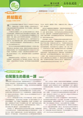 第 3143 期 主曆 2024年 11月 17日(禮拜日) http://ChristianWeekly.net 信 3仰伯駕醫生的最後一課我是伯駕(Peter Parker),1804 年 6 月 18 日出生在美國馬薩諸塞州的弗明漢。我的家族信仰虔誠,過着簡樸的農耕生活。正是在這個環境中,我學會了信仰的堅持,並認識到通過幫助他人來實現信仰的要義。這種經歷也引導我走上了一條非比尋常的道路——我學醫,更成為肩負使命的醫療傳教士。1831 年在耶魯大學獲得學士學位,隨後在 1834 年從耶魯醫學院獲得醫學博士學位。在這個過程中,我深刻意識到醫學不僅是一門治病救人的技術,更是展示基督仁愛與恩慈的有力工具。完成醫學學業後,我繼續在耶魯攻讀神學,並被按立為長老會宣教士。我堅信:救治身心疾苦與傳播福音可以並行不悖,這成為我畢生追求的核心。1834 年,我帶着這樣的信念踏上了前往中國的旅程,成為第一位全職的來華新教醫療宣教士。我在廣州開設了眼科醫院,這不僅是中國歷史上第一家專門的西醫醫院,也成了我實踐「通過醫學傳道」的起點。我治療眼疾、切除腫瘤,並通過精妙的手術展示了西方醫學的力量。然而,醫療不僅僅是治癒身體的事情,我常常在給病人醫治的同時,向他們見證基督的福音。我相信,仁慈的治療能打開心靈的窗戶,為福音的傳遞鋪平道路。回想我的一生,醫學和信仰的結合是我對世界最大的貢獻;通過醫術贏得了許多中國百姓的信任,而這種信任讓我有機會向他們傳遞基督的愛。在中國的日子裏,我看到了無數患者的苦難,但也見證了醫學奇蹟的發生。讓我最為驕傲的是,我不僅僅是醫生,更是能夠幫助這些人從身體到靈魂獲得救贖的傳陳曉東清教徒們的最後一課聖靈降臨後第二十六主日釋經講道 但十二 1-3;詩十六 1-11;來十 11-14、(15-18)、19-25;可十三 1-8終結臨近本主日是教會禮儀年倒數的第二個主日(即基督君王日前的主日),兩週後就是新一年的開始,每到臨近一年將結束的這主日,所讀的經課都提醒我們終結將要來臨,所以今天的舊約、書信和福音都是關於「終結」這個主題。今天舊約但以理書第十二章一至三節是之前的第十至十一章先知所見異象的總結,前兩章提及波斯王朝至希臘時代王朝的更替,期間接連發生戰爭。第十二章一至三節描述的異象表示有極艱難的日子將會臨到,不過,屬於上主的子民將得到永遠的拯救,其中就算有已死的都會活過來得永生。對於亡國時期的以色列人,他們不單沒有了自己的土地,而且不斷飽受戰火摧殘,他們日夕期待就是復國與和平的日子,先知的信息是要鼓勵他們,希望他們能夠信靠上主,因為公義的上主必定會拯救祂的子民。至於本主日的福音經課是有關耶穌預言聖殿被毀。參考猶太歷史學家約瑟夫在《猶太戰史》的記載,耶穌時代的耶路撒冷聖殿被形容為好像白色的雪山一樣,因為當時的聖殿是用巨大華美的白色大理石所建造,而且還有像人一般高度、以黃金製成的金葡萄樹作為裝飾,牆上並嵌滿大塊的金片,所以,當時耶路撒冷聖殿是一座金碧輝煌的耀眼建築物。耶穌對聖殿作出的預言,在祂死後約三、四十年,即在公元七十年便應驗了。據說那時羅馬人為了奪去聖殿上面的黃金,便放火把聖殿燒毀,以便他們奪取熔下來的黃金;當年耶路撒冷經過這場殘酷戰爭之後,有說死亡人數超過一百萬人,被擄的亦近十萬人,隨後全城陷落,成為廢墟。當門徒正在讚歎聖殿的華麗建築時,耶穌就預言聖殿將會被毀,祂還提醒門徒,將會有假冒祂的名的人來迷惑人,並且多處會有戰爭、地震、饑荒等災難發生,而且門徒因為相信主耶穌福音的緣故會被人捉拿、被嚴刑拷問,但耶穌鼓勵門徒要謹慎不被迷惑之外,也不必擔心怎樣回答審問,因為聖靈會給他們當說的話,雖然他們會受迫害,但堅忍到底的終必得救。希伯來書的一段經課,也是勸勉在患難中的基督徒要堅守信仰,在期間信徒更加要彼此相顧,互相激勵積極地以愛心行善。作者特別提出不可停止聚會,好像那些停止慣了的人,可見那時已經有些信徒開始沒有恆常聚會。事實上很多不能持守信仰的信徒,多數是由逐漸疏於教會聚會開始,希伯來書的作者十分着緊這一方面,因為「那日子」(就是終末的日子)臨近,信徒間要互相扶持才能一起度過難關。世界多處政局持續不穩,很多地方都有戰爭,但沒有人知道何時是歷史的終結。不論是在舊約的先知、耶穌和使徒,他們都提醒我們要堅守信仰,以作好準備這將要來臨的終末。都市人日常生活、工作十分繁忙、急速,很容易迷失在其中而失去生命的目標和方向,如果每天早上醒來都視之為生命最後的一天,便較易分辨出永恆與短暫的事物,從而懂得珍惜和感謝上主賜予自己的生命,更願意善待他人,並能懷着喜樂與盼望去迎向終末的來臨。阿們。梁麗娥(香港聖公會牧師)道人。然而,生活從未一帆風順。我曾因中英戰爭而關閉醫院;也曾因健康原因不得不多次返回美國。在外交方面,我曾經有幸擔任美國與清政府之間的翻譯,並參與《望廈條約》的談判。這讓我體會到,信仰、醫療與外交其實是相互交織的。我始終堅信,通過和平與對話,世界可以變得更加美好。我一生最為重要的時刻莫過於 1835 年在廣州成立眼科醫院。這不僅僅是一家醫院,它代表着現代西方醫學與基督教精神在中國的交匯點。在這裏,我與我的同工和學生們一起,見證了成千上萬的病人從黑暗走向光明—