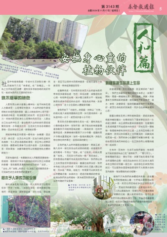 http://ChristianWeekly.net5 第 3143 期 主曆 2024年 11月 17日(禮拜日) 社區中有植物點綴,令城巿生活多點生機。然而植物不只是「佈景板」或「陪襯品」,作為上主所造的生命體,還有很多常被忽略的美好特性,能成為我們生活裏的好伙伴。殊不簡單的綠色人看到青山綠水會覺心曠神怡,這不純粹是個人主觀感受。心理學研究發現,大自然的綠色環境相較於其他色調的景象,讓人比較能保持心境平靜,疲倦感亦較低,有減輕壓力的效用,甚至提升專注力。背後的原因從演化心理學的角度而言,人類自古已在自然中生活,會自動將大自然的綠色環境連繫到食物、水和棲息地等,全是與生存息息相關的事物,因此有安定之感,使情緒安穩。將植物帶進室內環境一樣有效,如餐廳、酒店大堂、辦公室、以及公共空間,若加入綠色盆栽作為裝飾,令人更容易適應新環境。甚至有心理學研究發現,觀看綠色景象可以提升創意,尤其視覺創意,即如素描、油畫和雕塑等以視覺產物為主體的創造力。而更有趣的是,有實驗測試人們觀看真實植物、假植物、植物相片和沒有植物四組狀況對正向情緒的影響,發現觀看真實植物的組別對於「安舒」、「自在」和「放鬆」的評分,比其他三組明顯高很多,可見綠色的生命對我們的重要性。樹木予人類的功能全備樹木本身是高大的生物,用人類角度可以看到很多「用途 / 功能」,如美化環境、提供康樂活動場所、降溫增濕,調節微氣候、淨化空氣、降低噪音,甚至可以保持巿民精神健康、促進兒童智力發展等等,帶來經濟價值等等。從醫學角度,花時間深度享受大自然會為我們帶來很多健康益處,包括:降低血壓、減慢過快的心跳、有助降低血糖、減少壓力激素水平、增加能夠對抗感染和癌症的白血球、增強免疫系統、改善心情等等,是十分全面的人體健康照顧。當我們放下「功能性」的眼鏡,純粹以「生物」的眼光進入被植物圍繞的空間,如花園或森林,成為當中的一分子,感受或許會十分不同:看見各式各樣的植物生長在一起,還有其他大小動物棲身其中,各取所需;鼻子嗅出的味道會隨着移動到不同植物區域改變;一陣風吹來,在林中變得溫柔,風聲颯颯伴隨葉子沙沙作響,搖擺的葉片令陽光盪漾起來;忽然一隻鳥拍翼起飛,其他生物彷彿也突然專注,留意四周的變化……若我們進入自然時願意放慢腳步,開啟五感,融入其中,順性與各自然成員的相遇,或會讓我們感到驚奇。不再以「客旅」或「征服者」的眼光看着「他者」,而是與它們成為一體「看見彼此」,因有整個自然裏所有成員與我們為伴,我們得以與上主的受造世界重新連結,靈裏也能得安舒。我們本有能力與自然共感,只是繁忙的生活讓人難以放鬆,而未能「開啟」這能力,有需要可以參與各式自然體驗活動,如森林浴,透過活動導師的帶領,能增加我們與自然連結,更快感受到那份與自然共融的平安喜樂。栽種是讓生命遇上生命由窗邊盆栽,到社區園圃,甚至鄉郊的「格仔田」,我們生命裏對栽種的渴望從未停止。由種子開始,看着一棵植物生長、開花結果、凋謝,然後重新生長開始新的循環。過程裏我們參與其中,澆水、修剪,改變環境,協助照顧讓植物們生長得更好,感受生命的美好與無常,同步也在操練身體與心思。園藝治療就是將人帶到植物面前,透過與植物相處來輔助醫治。在導師指引下重新學習與另一生命建立關係,由五感開始重新認識植物,在緩慢的生長過情裏不用追趕城巿的速度。即或是同一種植物,每個植株都有其特別之處。上主尚且知曉小草的獨特,更何況你同樣是上主所寶貝的。回歸與其他受造一起,我們的身心社靈都可被醫治修復,這份由看見恩典而來的信心,也正與你用心栽種的植物一起成長。生有時,死有時,生命不由我們掌控。有些朋友可能就會認為自己是「植物殺手」,「種乜死乜」,對栽種避而遠之,實在可惜。其實可能是環境不適合所選種的品種,或是因自身的生活已安排太滿而未有空間好好照顧一個生命,這些都在反映我們的狀況。可以選取如喜愛較陰環境和不太需要水份的室內植物,增加種植的成功經驗。植物不只為我們的身體提供食物,亦滋養我們的情緒與心靈。它們每天靜靜地站在一旁,然而它們仍有好多說話想對我們 – 受造世界的鄰居說。在聖經的年代,人民以農業為本,耶穌也用了大量與種植相關的比喻,讓人能更易明白。現今社會我們不再以種植為營生工作,不論是有機會種點小東西,或是多花時間欣賞我們身邊的植物伙伴,必會讓我們認識上主更多。▲▲不同植物的綠色變化,足以好好欣賞。城巿中的老樹,默默見證社區的變遷,是我們的鄰舍。▲一期一會的 花 朵, 因其繽紛色彩和形態並加上 裝 飾, 成為讓人喜悅的擺設。港是個高壓緊張的社會,若每區都能有「城巿森林」,既可讓人與植物為鄰,支援身心靈健康,亦能讓更多生物有安居的家,在城巿裏也可體創造萬物的共融圓滿。▲洋紫蘇、到手香 / 左手香等都是新手種植朋友的好伙伴。 Weekly 基督教週報 Christian Weekly 基督教週報 Christian Weekly 基督教週報 Christian Weeklyn Weekly 基督教週報 Christian Weekly 基督教週報 Christian Weekly 基督教週報 Christian Weekly 基督教週報 Christian W 基督教週報 Christian Weekly 基督教週報 Christian Weekly 基督教週報 Christian Weekly 基督教週報 Christian Weekly 基基督教週報 Christian Weekly 基督教週報 Chr