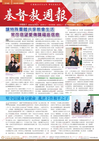 編輯及發行人:香港華人基督教聯會 督印人:鍾健楷 地址:九龍聯合道140號香港華人基督教聯會大樓二樓 電話:2337 4171 圖文傳真:2338 2314網 址:http://ChristianWeekly.net 電子郵箱:[email protected] 承 印:國強印刷制作公司 作者文責自負3146 2024年12月8日 逢禮拜日出版.本期出紙二張半.每份零售五元正本期推介 銀髮族的社會責任.吳思源 p2 ∣ 目的與意義.施德藩 p4 ∣ 讓小孩到我這裏來.龔立人 p6堅守信徒身分使命 亂世下作和平之子讓特殊羣體共享教會生活常存信望愛傳講福音信息隨着SEN(特殊教育需要)羣體愈來愈多,教會同樣存在這些肢體,教牧需了解他們需要和特徵,才能牧養得宜。香港基督教協進會SEN事工小組早前,假基督教香港信義會馬氏紀念禮拜堂舉辦「漆黑中的星光」SEN講座及工作坊,其中於11月21日以「如何與特殊兒童共享教會生活」為題,探討如何向他們傳講福音訊息,以愛心同行。香港基督教服務處學校社會工作服務主任鍾慧姸女士指,SEN 的類別包括智障、自閉症、注意力不足/過度活躍症、精神病、特殊學習困難、肢體傷殘、視障、聽障和言語障礙。根據教育局資料顯示,去年公營小學、中學SEN學生分別超過3萬人,以全港中、小學分別約32.5萬學生人數計算,即SEN學生佔整體學生人數約10%,為數不少,亦反映這些羣體確實存在於教會中。她以注意力不足/過度活躍症(ADHD)兒童為例,指他們平日除了過度活躍和缺乏專注力外,自制能力也相對較弱,難以解決生活困難和影響待人接物,尤其就學時期容易受同學排斥,最終影響自我形象甚至患上抑鬱症。因此,如主日學或團契中有以上學生,她認為教會可在聚會前讓他們跑動以發洩精力,由於他們難以長時間專注,故可按其能力安排小任務,如派發主日學教材等,目的是給予他們合理「離座」的機會。她補充,面對ADHD青少年,導師指令須簡潔清晰,不必時刻回應其不合宜行為,並容許他們較長時間平伏情緒,待冷靜後才討論。至於自閉譜系症則有兩大特徵,包括社交互動和溝通困難、固執和重複性行為及狹隘的興趣,故難以理解別人感受和社交規範,又不懂察言觀色,更常因事物突然改變而出現情緒反應。鍾女士表示,與自閉譜系症者相處首要將心比心,體諒和理解他們身體的限制,自然能與他們同行,切勿以個人角度出發作批判。「他們很多在學校環境待不下去,無法上學,也可能因上學而不開心,如果教會能容納他們,這真是一件美事。」特殊羣體屬神子民 無礙領受福音信息基督教宣道會北角堂傷健羣體牧養科副科主任袁國瑞牧師指,教會早年以團契模式牧養傷健羣體,後因團契人數不斷增加,故於2008年成立傷健羣體牧養科,專注服侍他們。他表示,現時教會牧養傷健羣體,服侍對象包括視障、聽障、智力障礙、肢體傷殘及自閉症肢體,並提供福音班、初信栽培班和洗禮班,「一條龍式」引領他鍾慧姸女士分析不同SEN肢體的需要和特徵。們歸主。除了成立團契小組、主日學、語言訓練班和詩班外,教會在硬件上也作出不少配合,例如增設升降機、斜台、傷健洗手間、輪椅區等無障礙設施,更每週預訂復康巴士及旅遊巴士,接載肢體往返教會。至於軟件上同樣面對挑戰,如教牧同工和會眾的接納情況、動員事奉人手等,他坦言曾有傳道同工憂慮事工會拖累教會經濟,亦有會友擔心傷健羣體騷擾崇拜安靜和影響他人。惟他強調,傷健人士同是上帝所造和所愛,擁有上帝的形象和樣式,他們能彰顯上帝的榮耀並見證祂創造的大能和奇妙,縱然心智有障礙,其生命與普通人一樣有價值。此外,上帝主動與人立約,特殊孩子同是立約羣體一部分,應一同被拯救脫離罪海,得着救恩;教會亦應履行使命,傳福音給每一個上帝所愛的人,包括身體和智力障礙人士。牧養傷健羣體多年,袁牧師直言特殊孩子同樣能認識和決志信主,故教牧同工應認識不同傷健羣體的需要,按他們的學習需要和特徵,調整教材及教學法,讓他們認識福音。他又提醒教牧同工要常存信、望、愛,接納和包容他們,嘴巴說出溫柔而堅固的言語,最重要是需要從上帝而來的愛心。以巴衝突發展至今,無數平民因戰禍痛失親人及家園,加上資訊泛濫、傳媒報道偏頗,更為當地羣體帶來撕裂和仇恨。華福中心香港區委會已於11月27日,假尖沙咀潮人生命堂主辦「中東風雲,世事紛紜──如何作和平之子?」研禱會,透過專題及禱告,辨識信徒在紛亂世代下作和平之子的角色。福音證主協會副總幹事(事工)呂慶雄博士指,後真相時代難以尋真,加上不同媒體立場各異,即使報道同一事件,內容也可大相逕庭,難辨真假。他強調,上帝是掌管昔日、今日與明日的神,「聆聽」上帝話語及個人召命才是出路,其中又提到上帝國度還有其他民族及教會參與,信徒只是上帝計畫中的一部分,需謙卑承認所知的不足。他以伊朗為例,有數據顯示當地1979年的信徒人數僅500人,今天估計已達一百萬人,雖然數字未必完全準確,但無可否認伊朗是其中一個增長最快的宣教工場,可見上帝在惡劣環境中仍然作工。他續言,神國倫理中強調犧牲的愛、真誠悔改、踐行公義,信徒可以此方向為戰亂中的人祈禱,同時明白上帝最終掌權,祂必再來終結和審判一切。最後,他表示猶太人、阿拉伯教會、擁有穆宣經驗的信徒看事物角度不一,衝突時有發生;作為關心當地局勢者,亦鮮有了解阿拉伯人教會及彌賽亞猶太信徒羣體的處境,籲信徒要認