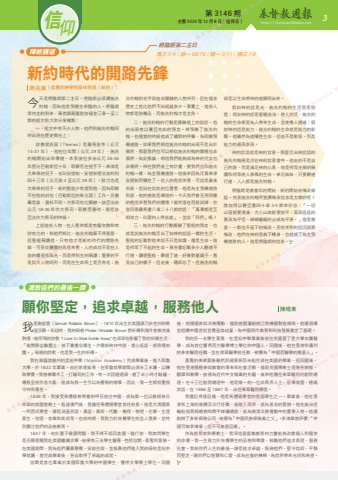 第 3146 期 主曆 2024 年 12 月 8 日(禮拜日) http://ChristianWeekly.net 信 3仰願你堅定,追求卓越,服務他人我是鮑留雲(Samuel Robbins Brown),1810 年出生於美國康乃狄克州的東溫莎鎮。年幼時,我的母親 Phobe Hinsdale Brown 對祈禱和海外宣教充滿熱情,她所寫的詩歌 \「偷閒靜坐離塵土,放下憂慮念禱主。夕陽斜映林中路,虔心低語,感恩情如露。」母親的詩歌,也是我一生的祈禱。我在麻薩諸塞州的孟松中學(Manson Academy)完成學業後,進入耶魯大學,於 1832 年畢業。由於家境貧寒,在耶魯就學期間必須半工半讀,以賺取學費。我曾兼職木工、打鐘司的工作,有一次因睡過頭,遲了半小時才敲鐘,導致全校作息大亂,這成為我一生引以為警惕的憾事,因此,我一生都很重視守時和責任。 1838 年,我接受馬禮遜教育會的呼召前往中國,成為第一位以教師身分來華的美國宣教士。抵達澳門後,我擔任馬禮遜學堂首任校長。這是大清國第一所西式學堂,課程涵蓋英語、漢語、算術、代數、幾何、物理、化學、生理衛生、地理、音樂和美術等。在校時期,我致力於培養學生的全人發展,並特別關注他們的品格教育。1847 年,由於妻子健康問題,我不得不返回美國。臨行前,我詢問學生是否願意隨我赴美國繼續求學,結果有三名學生響應,包括容閎、黃寬和黃勝。在美國期間,我為他們籌募學費、安排住宿,並推薦他們進入我的母校孟松中學就讀,當完成學業後,各自取得了卓越的成就。容閎是首位畢業於美國耶魯大學的中國學生,獲得文學學士學位。回國陳曉東清教徒們的最後一課將臨期第二主日釋經講道 瑪三 1-4;路一 68-79;腓一 3-11;路三 1-6新約時代的開路先鋒今天是將臨期第二主日。將臨期必須講施洗約翰,因為他是預備主來臨的人。將臨期等待主的到來,筆者願藉着路加福音三章一至二節的經文和大家分享幾點:一、經文中有不少人物,他們和施洗約翰同時出現在歷史舞台上:該撒提庇留(Tiberias)是羅馬皇帝(公元14-37 年),他在位年間(公元 29 年),施洗約翰開始出來傳道。本丟彼拉多由公元 26-36年管治巴勒斯坦十年,耶穌死在他手下。希律是大希律的兒子,名叫安提帕。安提帕管治加利利四十三年(公元前 4 至公元 39 年)。腓力也是大希律的兒子,新約聖經少有提到他,因為耶穌不在他的封地(巴勒斯坦的東北面)工作。呂撒聶是誰,資料不明。大祭司地位顯赫。該亞法由公元 18-36 年作大祭司。耶穌受審時,便是該亞法作大祭司的時候。上述這些人物,在人看來都是有權有勢和有財有力的,和他們相比,施洗約翰算不得甚麼,但聖經稱讚他,只有他才是新約時代的開路先鋒,可見從屬靈的角度來看,人的成功不是在人前的價值和風光,而是得到主的稱讚;重要的不是與大人物同列,而是在生命冊上是否有名;施洗約翰的名字與這些顯赫的人物共列,但在福音歷史上他比他們不知超越多少。事實上,這些人物都是陪襯品,而施洗約翰才是主角。二、施洗約翰的行動是應驗經上的說話。他的出現有以賽亞先知的預言。神預備了施洗約翰,在適當的時候他成了曠野的呼聲,為耶穌預備道路。如果我們相信施洗約翰的出現不是出於偶然,那麼我們也可以相信施洗約翰的遭遇也非偶然,如此推論,相信我們能夠成為神的兒女也非偶然。神在我們身上有計畫,要我們也和施洗約翰一樣,為主預備道路。他後來因為斥責希律安提帕而犧牲了。從人的角度來看,可說是最後失敗,但站在信徒的位置看,他是為主預備道路到底,他的道路是輝煌的。今天我們會否用同樣的態度來看我們的遭遇?縱然落在百般試煉,你會同意羅馬書八章二十八節的話:「萬事都是互相效力,叫愛的人得益處」,並說「阿們」嗎?三、施洗約翰的行動應驗了聖經的預言,也就是說施洗約翰活出了如神的話語一樣的生活。聖經的記載對他來說不只是知識,還是生命。這是何等了不起的生命。雅各書記載多少人聽道不行道,讀過聖經,聽過了道,好像對着鏡子,看見自己的樣子,但走後,隨即忘了。但施洗約翰卻是以生命將神的道顯明出來。假如神的話是光,施洗約翰的生活便是明燈;假如神的話是蜜糖滋油,使人快活,施洗約翰的生命便是為人帶來生命,並使愚人通達;假如神的話是能力,施洗約翰的生命就是能力的彰顯。他雖然為道犧牲生命,但這不是軟弱,而是能力的最高表現。神的話語就是神的旨意。那麼活出神話語的施洗約翰便是活在神的旨意當中,他走的不是自己的路,而是滿足神的心意,這是何等光榮的稱讚和何等使人羨慕的生命。弟兄姊妹,只要聽道行道,人人都是施洗約翰。將臨期是教會年的開始,新的開始由悔改做起。究竟施洗約翰所宣講悔改信息是怎樣的呢?路加用以賽亞書四十章 3-5 節來形容:「一切山窪都要填滿、大小山崗都要削平;高高低低的要改為平坦、崎崎嶇嶇的必成為平原。」這是徹底、一點也不留下的悔改。百姓來到約但河認罪悔改,他們在神的恩典下轉身,也就成了為主預備道路的人。這是將臨期的信息。周兆真(信義宗神學院榮休院長(新約))後,他積極參與洋務運動,協助曾國藩創辦江南機器製造總局。他還倡導並組織中國首批官費留美幼童,為中國現代教育和科技發展奠定了基礎。我的另一名學生黃寬,在孟松中學畢業後前往英國愛丁堡大學攻讀醫學,成為首位獲得西方醫學博士學位的中國人。回國後,他在香港和廣州的多家醫院任職,並在南華醫學校