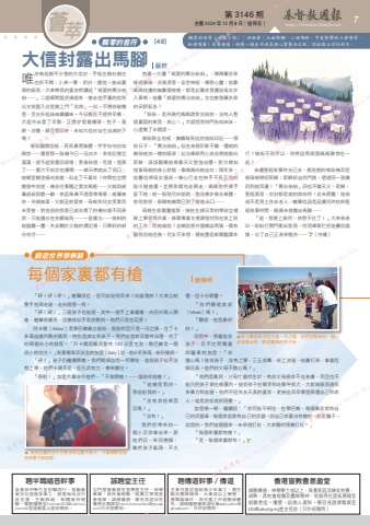 第 3146 期 主曆 2024 年 12 月 8 日(禮拜日) http://ChristianWeekly.net 薈 7萃飄零的音符 (48) 飄零的音符(連載小說):四姐弟(大姐唯願、二姐唯盼、中度智障的三弟唯岸、幼弟唯眷)自喪母後,經歷一趟生命成長與心靈醫治之旅;認出路上同行的主。唯岸撿起躺平沙發的大信封,手指左繞右繞怎也拆不開;小弟一奪,拆封、還他。抽出裏頭的紙張,大弟嘹亮的童音朗讀起「親愛的喬治伯伯──」二姐瞬間猛虎撲過來,搶走他手裏的信和公文袋竄入浴室鎖上門「哎喲」一叫,不慎咬破嘴唇,舌尖升起絲絲鐵鏽味。今日飯店不提供早餐,大姐外出買了早點,正閒步提着饅頭、包子、蛋餅、涼麵、鮮豆漿回來,未知大信封自生自滅的下場?唯盼翻閱信紙,頁頁鼻青臉腫,字字句句彷如隔世……書房那一隙縫今已一泓白水,某些記憶空蕩蕩,提不起勁重回現場;青春碎過、死過、埋葬了──墓穴不知怎地爆開,一線天帶她出了洞口;她糊里糊塗循光前進,似走了千萬年?時間在空間變換中流逝,痛苦往事隨之雲淡風輕──父親與威廉叔叔假戲一齣,家庭風暴不過客串場景;威廉無奈、芳姨無辜,父親至終愛家,母親和兒女受累而未受害,對爸爸的恨意已成洗壞了的襯衫復不回原狀,只能遺忘在衣櫥暗角──一直遺忘……彼刻的她腦霧一團,失去關於父親的壞記憶,只剩好的部分存活……抱着一大疊「親愛的喬治伯伯」,陣陣薰衣草綠過鼻端,淡雅清香、安定神經、療慰心靈;挨靠媽媽枕邊的無數個夜晚,都是此薰衣香護送母女步入夢鄉。這疊「親愛的喬治伯伯」怎也散發薰衣草的田野氣息?「盼盼,是芳姨代媽媽請我交給妳,沒有人看過裏面的東西,放心!」大姐慌張拍門告知妹妹,心虛撒了半個謊。唯盼跌坐地板,撫觸每頁信的指紋印記──那些日子,「喬治伯伯」似在身側形影不離,懂她的痛陪她流一樣的眼淚;此治療師用心良苦將她推向耶穌,諄諄勸導她倚靠天父堅強站穩。對方瞭如指掌母親的身心狀態,像媽媽向她自白;兩年多,這疊信將母女連成一條心行走在伸手不見五指的陰冷隧道裏。並肩取暖地走啊走,媽媽忽然揮手留下她;她一股勁兒向前跑,跑沒幾步微光漸露、愈照愈明,眼睛剌痛間已到了隧道出口……母親生前勤奮進取,撿拾主婦日常的零碎空檔線上學習寫作業,修畢專業文憑課程找到在家上班的工作;問她做啥?含糊說替外國雜誌寫稿,偶有醫院派她任務。兒女不多想,猜她重返新聞翻譯本行?唯盼不明所以,時將諮商師跟媽媽聯想在一起?床邊聖經故事時光已去,叛逆期的唯盼掩耳拒絕母親嘮叨耶穌;耶穌卻自找門路,透過同一張嘴回到她耳邊!「喬治伯伯」回信不離天父、耶穌、聖經真理,封封都是她的救命符!從未察覺:這伯伯不是男士亦非老人,輔導信函是延續兒時枕畔聖經故事時間,媽媽未曾露出馬腳……「姐,我要上廁所,快憋不住了!」大弟急急叫。盼盼打開門衝出客房,找明輝幫忙把這疊信燒燬,忘了自己正身穿睡衣…… (待續)大信封露出馬腳每個家裏都有槍麗群趙煥明窮遊世界學無窮「砰!砰!砰!」槍聲很近,但不知從何而來?向誰發射?大家立刻雙手抱頭走避,走向房屋一角。「砰!砰!」三個孩子在追逐,其中一個手上拿着槍,向另外兩人開槍,槍聲很響亮,但槍枝似乎是仿製的。他們只是在玩耍!阿卡爾(Akkar)是黎巴嫩最北省份,與敘利亞只是一河之隔,住了十多萬逃避內戰的難民,特別是婦女和孩子。我們從首都貝魯特出發,花了約兩個半小時路程。「阿卡爾距離貝魯特 130 公里左右,黎巴嫩是一個很小的地方!」負責駕車及安全的加里(Gary)說,他6呎多高,身形健碩。「砰!」孩子仍繼續開槍。我們剛探訪完一所學校,這些孩子似乎沒有上學,他們十歲不足,但孔武有力,拳來腳往。「停啦!」加里大聲命令他們,「不准開槍!……誰給你這槍?」「這槍是我的,我爸給我的。」「沒有其他東西玩嗎?」「沒有!」我們把帶來的一個小足球拿出來,跟他們玩,來回幾腳,雖然孩子亂踢,不太懂,但十分興奮。「你們聽過美斯(Messi)嗎?」「聽過,他是最好的!」回程中,想着這些孩子,忍不住問駕着四驅車的加里:「你擔心嗎?這些孩子,沒有上學,三五成羣,街上流連,結黨打架,拿着危險玩具。他們的父母不擔心嗎?」「他們是難民,父母忙着找生計,有些父母根本不在身邊,而且也不能只把孩子鎖在帳篷內。這些孩子在戰爭和走難中長大,大都親眼見過很多暴力和血腥。他們不但失去天真的童年,更被迫早早學習保護自己和家人。這是很悲哀的現實。」加里頓一頓,繼續說:「你可能不相信,在黎巴嫩,每個黨派都有自己的武器庫,每個家庭都有自己的武器。說自己家裏沒有槍的,都是騙子,說謊的。我們這個國家,未停過打仗,大家隨時預備打仗。」「每個家裏都有槍?」「是,每個家裏都有!」▲阿卡爾與敘利亞只是一河之隔,我們把帶來的一個小足球拿出來,跟逃難來的孩子玩。▲ 敘利亞難民孩子在戰爭和走難中長大,大都親眼見過很多暴力和血腥。誠聘堂主任屯門基督教惠荃堂聘堂主任,神學畢業,具牧會經驗,能獨立帶領堂會發展。請繕履歷、蒙召見證及牧養理念電郵至[email protected]只作招聘用。聘傳道幹事/傳道主責兒童及協助青少年事工。需主動及團隊精神,大專或以上學歷,懂電腦操作,具兒童工作經驗者優先。請繕履歷耀東浸信會[email protected],只作招聘用。聘半職福音幹事負責與中學生至初職同行,推動教會及社區福音事工,