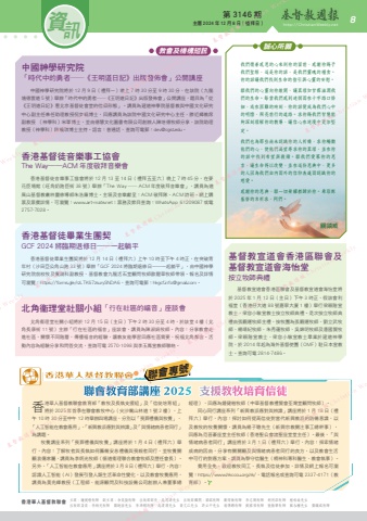 香港華人基督教聯會第 3146 期 主曆 2024 年 12 月 8 日(禮拜日) http://ChristianWeekly.net 資 8訊主席:鍾健楷牧師 副主席:余英嶽牧師 出版部部長:吳思源先生 出版部顧問:梁銘牧師 鄺偉衡牧師 李志剛牧師 胡明添牧師 植栢燊先生 出版部委員:李炳光牧師 關銳煊先生 李鴻標牧師 吳渭濱先生 黃文江先生 許立中先生 翁傳鏗牧師 劉國偉牧師 張振華牧師 蘇永權先生 關鎮威牧師教會及機構短訊我們懷着感恩的心來到祢的面前,感謝祢賜予我們聖經,這是祢的話,是我們靈魂的糧食。祢的話讓我們找到生命的指引與心靈的安慰。願我們的心靈向祢敞開,讓真理如甘霖滋潤我們的生命。每當我們感到迷惘而在十字路口徘徊,或在困難的時刻,祢的話便成為我們心中的明燈,照亮前行的道路。求祢賜我們智慧能夠深刻理解祢的教導,讓信心在逆境中更加堅定。我們也為那些尚未認識祢的人祈禱,求祢觸動他們的心,使他們渴望尋求祢的真理,並在祢的話中找到希望與救贖。願我們愛慕祢的恩言,讓生命得以改變,並在這份恩典中,更多的人因為我們由內而外的信仰表達而認識祢的慈愛。感謝祢的恩典,願一切榮耀都歸於祢。奉耶穌基督的名祈求,阿們。關鎮威誠心所願中國神學研究院「時代中的勇者──《王明道日記》出版發佈會」公開講座中國神學研究院將於 12 月 9 日(禮拜一)晚上 7 時 30 分至 9 時 30 分,在該院(九龍塘德雲道 5 號)舉辦「時代中的勇者──《王明道日記》出版發佈會」公開講座,題目為「從《王明道日記》看北京基督徒會堂的信仰形態」。講員為建道神學院基督教與中國文化研究中心副主任兼任助理教授倪步曉博士,回應講員為該院中國文化研究中心主任、滕近輝教席副教授 〔神學科〕宋軍博士,並由德慧文化圖書有限公司創辦人陳培德牧師分享、該院助理教授(神學科)陳曉琪博士主持。語言:普通話,查詢可電郵:[email protected]。香港基督徒音樂事工協會The Way——ACM 年度敬拜音樂會香港基督徒音樂事工協會將於 12 月 13 至 14 日(禮拜五至六)晚上 7 時 45 分,在麥花臣場館(旺角奶路臣街 38 號)舉辦「The Way ── ACM 年度敬拜音樂會」,講員為道風山基督教叢林靈修導師朱浩廉博士。主領及音樂獻呈:ACM 敬拜隊、ACM 詩班。網上購票及票價詳情,可瀏覽:www.art-mate.net;票務及節目查詢:WhatsApp 61209087 或電2757-7028。香港基督徒畢業生團契GCF 2024 將臨期退修日——一起躺平香港基督徒畢業生團契將於 12 月 14 日(禮拜六)上午 10 時至下午 4 時正,在突破青年村(沙田亞公角山路 33 號)舉辦「GCF 2024 將臨期退修日——一起躺平」,由中國神學研究院前校牧及實踐科副教授、基督教會九龍活石堂顧問牧師歐醒華牧師帶領。報名及詳情可瀏覽:https://forms.gle/rzLTK67zsurySNDA6,查詢可電郵:[email protected]。北角衞理堂社關小組「行在社區的福音」座談會北角衞理堂社關小組將於 12 月 15 日(主日)下午 2 時 30 分至 4 時,於該堂 4 樓(北角長康街 11 號)主辦「行在社區的福音」座談會,講員為陳淑娟牧師。內容:分享教會走進社區,關懷不同階層,傳播福音的經驗,讓教友能學習回應社區需要,祝福北角鄰舍。活動內容為經驗分享和問答交流,查詢可電 2570-1098 與李玉鳳宣教師聯絡。聯會專號聯會教育部講座 2025 支援教牧培育信徒香港華人基督教聯會教育部「教牧及長執支援組」及「信徒培育組」將於 2025 年首季在聯會教牧中心(尖沙嘴山林道 1 號 2 樓),上午 10 時 30 分至中午 12 時舉辦四場講座,分別以「喪葬禮儀與牧養」、「人工智能在教會應用」、「新興教派應對與辨識」及「與情緒病患者同行」為講題。牧養講座系列「喪葬禮儀與牧養」講座將於 1 月 4 日(禮拜六)舉行,內容:了解牧者與長執如何籌備安息禮儀與喪親者同行,並牧養關顧哀傷家屬,講員為李炳光牧師(循道衞理聯合教會牧師及歷任會長)。另外,「人工智能在教會應用」講座將於 3 月 8 日(禮拜六)舉行,內容:認識人工智能(AI)發展引發人類生活革命性變化,以及教會牧養應用,講員為黃兆輝教授(工程師、能源顧問及科技設備公司創辦人兼董事總經理),回應為鍾健楷牧師(中華基督教禮賢會荃灣堂顧問牧師)。同心同行講座系列「新興教派應對與辨識」講座將於 1 月 18 日(禮拜六)舉行,內容:探討如何提高信徒對當代新興教派的防備意識,以及教牧的牧養關懷,講員為楊子聰先生(新興宗教關注事工總幹事),回應為范晋豪座堂主任牧師(香港聖公會諸聖座堂堂主任)。最後,「與情緒病患者同行」講座將於 3 月 1 日(禮拜六)舉行,內容:探索情緒成病的因由,分享有關關顧及與情緒病患者同行的良方,以及教會生活中可行的對應方案,講員為黎守信醫生(精神科專科醫生、教會執事)。費用全免,歡迎教牧同工、長執及信徒參加,詳情及網上報名可瀏覽:https://www.hkcccu.org.hk/,電話報名或查詢可電 2337-4171(教育部)。基督教宣道會香港區聯會及基督教宣道會海怡堂按立牧師典禮基督教宣道會香港區聯會及基督教宣道會海怡堂將於 2025 年 1 月 12 日(主日)下午 3 時正,假該會利福堂(香港仔大道 88 號嘉寧大廈 1 樓)舉行梁穎階宣教士、梁容小敏宣教士按立牧師典禮。是次按立牧師典禮由張觀運牧師主禮,按牧團為張觀運牧師、劉立武牧師、楊靖紀牧師、朱秀蓮牧師、吳錦明牧師及潘國賢牧師。梁穎階宣教士、梁容小敏宣教士畢業於建道神學院,於 2014