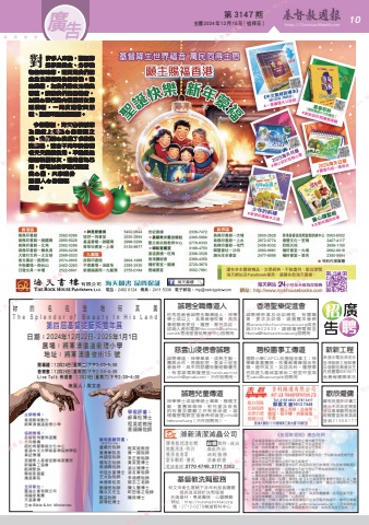 第 3147 期 主曆 2024年 12月 15日(禮拜日) http://ChristianWeekly.net 廣 10告《基督教週報》廣告則例1. 凡有違基督教信仰或信徒生活原則之廣告概不刊登。2. 私人公告或啟事,須有其所屬教會正式公函證明。3. 訂婚、結婚等廣告,須有教會公函或堂主任證明。4. 教會或機構之公告或啟事,須附有正式公函。5. 本報編輯及編輯業務小組有權審核所有廣告內容,予以修改或拒絕刊登,而不必申述任何理由。6. 廣告內容由刊登廣告之客戶負全部責任。7. 歧視條例問題:根據香港特別行政區政府現行的條例《性別歧視條例》及《殘疾歧視條例》,招聘廣告不能刊登以下帶有歧視成分條文: a. 僱員的性別要求;b. 僱員的婚姻狀態;c. 僱員的身體或精神上的殘障;d. 僱員的年齡要求。8. 根據《個人資料(私隱)條例》的《人力資源管理實務守則》訂明,僱主如在招聘廣告中直接要求求職者遞交個人資料,僱主必須述明自己的身分及有關資料的使用目的。9. 凡涉及「離職」的廣告及啟事,一律不予刊登。10. 凡涉及保險、財務類之「聘請」廣告,須由有關機構/公司直接刊登,並須附該機構/公司函件,以資證明。11. 來稿規格:分類小廣告由本報根據客戶之文字稿代為排字,格式以本報為準。普通廣告稿件必須電郵至 [email protected]。(所有稿件必須於刊出日期前十日遞交。本報逢禮拜日出版,如有更改另行公告。)新新工程承接水電油漆泥水各項裝修工程取價公道歡迎教會及主內肢體電90819077免費報價陳弟兄歡欣僱傭嚴格挑選菲印傭工適合不同家庭需要提供專業顧問服務經驗豐富服務真誠查詢21558177香港聖樂促進會誠聘總幹事及培訓總監,有關職責、要求及詳情,請瀏覽本會網頁www.hkchurchmusic.org或查詢35902835,請繕履歷電郵至[email protected]招聘用誠聘全職傳道人旺角區教會誠聘全職傳道人,神學學士或以上,負責教會牧養,具牧養經驗者更佳。履歷、蒙召見証、諮詢人資料電郵[email protected]香港基督徒聚會中心招聘用慈雲山浸信會誠聘誠聘傳道,神學畢業,成熟主動,團隊合作,恩賜配搭,委身小型堂會服侍,具不同群體牧養經驗優先。有意請電郵履歷至[email protected],只作招聘用。誠聘兒童傳道神學學士或道學碩士畢業,積極主動,重團隊精神,對兒童及家長的牧養及關顧工作有使命感。請繕履歷電郵宣道會希伯崙堂[email protected](只作招聘用)。聘校園事工傳道國際小學CAPCL校園福音事工;神學畢業重團隊,牧養教導傳福音恩賜,通中英文,英語流利。履歷蒙召見證九龍城富寧街二號宣中堂周生[email protected]招聘用第四屆基督徒藝術雙年展你 的 名 在 全 地 T h e S p l e n d o r o f B e a u t y 主辦機構:香港藝術動力, 將軍澳循道衛理小學協辦機構:基督教角聲佈道團, 方舟機構, 紐約角聲藝術香港中文大學崇基學院神學院, 英國華人基督徒藝術家團凱頌聖詠, 藝術家搖籃支持單位:靈溢企業有限公司, 鴻福堂集團, 天道書樓, 基周 108x150mm 日期:2024年12⽉22⽇- 2025年1展場:將軍澳循道衛理小學地址:將軍澳唐俊街15 號開幕禮:1 2月2 4日(星期二)下午3 : 0 0 - 5 : 0 0音樂會:1 2月2 6日(星期四)下午2 : 0 0 - 4 : 0 0L i v e T a l k 佈道會:1 2月2 8日(星期六)下午2 : 3 0 - 4 : 0第四屆基督徒藝術雙年展日期:2024年12⽉22⽇- 2025年1展場:將軍澳循道衛理小學地址:將軍澳唐俊街15 號第四屆基督徒藝術雙年展你 的 名 在 全 地 何 其 美T h e S p l e n d o r o f B e a u t y I n H i s L a n d 開幕禮:1 2月2 4日(星期二)下午3 : 0 0 - 5 : 0 0音樂會:1 2月2 6日(星期四)下午2 : 0 0 - 4 : 0 0L i v e T a l k 佈道會:1 2月2 8日(星期六)下午2 : 3 0 - 4 : 0 0策展人:周文志藝術展顧問團:(排名不分先後)盧龍光牧師葉菁華院長林誠信牧師楊有志牧師蔡頌輝牧師司徒永富博士王大為牧師林德育校長劉建良牧師陳永文先生戴益牧師郝青松博士主辦機構:香港藝術動力將軍澳循道衛理小學協辦機構:基督教角聲佈道團方舟機構紐約角聲藝術文化中心香港中文大學崇基學院神學院真証傳播英國華人基督徒藝術家團契新福事工協會凱頌聖詠藝術家搖籃播道書院支持單位:靈溢企業有限公司鴻福堂集團天道書樓日本 Bible & Art Ministries學術評審:郝青松博士程英斌教授蔡頌輝牧師程英斌教授黄一誠牧師李正榮牧師黃笑雯博士梁以瑚博士梁友東牧師李鴻標牧師郭志立老師陳久雙博士町田俊之牧師陳用博士日期:2024年12⽉22⽇- 2025年1⽉1⽇展場:將軍澳循道衛理小學地址:將軍澳唐俊街15 號開幕禮:1 2月2 4日(星期二)下午3 : 0 0 - 5 : 0 0音樂會:1 2月2 6日(星期四)下午2 : 0 0 - 4 : 0 0L i v e T a l k 佈道會:12月2 8日(星期六)下午2 : 3 0 - 4 : 0 0第四屆基督徒藝術雙年展日期:2024年12⽉22⽇- 2025年1⽉1⽇展場:將軍澳循道衛理小學地址:將軍澳唐俊街15 號118.5x85.25mm Weekly 基督教週報 Christian Weekly 基督教週報 Christian Weekly 基督教週報 Christian Weeklyn Weekly 基督教週報 Christian Weekly 基督教週報 Christian Weekly 基督教週報 Christian Weekly 基督教週報 Christian W 基督教週報 Christian Weekly 基督教週報 Christian Weekly 基督教週報 Christian Weekly 基督教週報 Christian Weekly 基基督教週報 Christian Weekly 基督教週報 Christian Weekly 基督教週報 Christian We