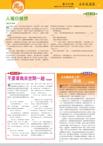 第 3147 期主曆 2024年 12月 15日(禮拜日) http://ChristianWeekly.net 輿 2情著名女作家瓊瑤女士在八十六歲高齡選擇自主離開世界,留下的遺書反映出她雖然經過深思熟慮才作出這決定,畢竟內心是充滿矛盾,這值得我們每一個人反思生死。我在馬來西亞砂拉越的朋友劉世堯牧師,他很仔細把這份遺書拆分如下:第一至二段,死的視角:「我已經翩然的去」,「自主、自在、自由的飛翔」,「優美而輕盈擺脫了逐漸讓我痛苦的軀殼」。第三段,死的決定:「我不想聽天由命,不想慢慢枯萎凋零,我想為這最後的大事作主」。第四段,死的無奈:「當人老了,都要經過一段很痛苦的衰弱、退化、生病、出入醫院、治療、不治的時間,這段時間,可長可短,對於必將老死的人,是多大的折磨!」第五至六段,死的無憾:「 我 是 火 花, 我 已 盡 力 燃 燒過……。生命的美好,就在於能愛、能恨、能笑、能哭、能歌、能說、能跑、能動、能紅塵作伴、活得瀟瀟灑灑,能嫉惡如仇,活得轟轟烈烈……這些,我都在有生之年,擁有過了!我活過了,不曾辜負此生!」第七至八段,死的不捨、疑問、感恩:「我最放不下的,就是家人和你們」;「不知道人類有沒有靈魂」;「慶幸此生,曾經和你們相遇相知」。第九至十一段,死的勸勉:「我死亡的方式,是在我生命的終站實行的!年輕的你們,千萬不要輕易放棄生命,一時的挫折打擊,可能是美好生命中的磨練」;「要勇敢,要活出強大的自我,不要辜負來世間一趟」。全文十一小段,流露了瓊瑤女士的豐富情感和思維,也暴露了她、以及許多人對老病死的恐懼與無助。尤其是她最後的幾段說話,苦口婆心,道出生命的美好最值得珍惜,而離別家人和至親又是最傷感,這我們可要牢牢記着啊。羣體與獨處,一直都是每個族羣在真實生活裏常常面對的生活方式。雖然有些人可能傾向喜歡獨處,不過生命的不同時期,總需要面對與不同人一起的生活階段。例如我們遇到危機困境時,總會盼望有不同天使出現,協助自己解脫苦難的時候。所以,人生歷程裏,總需要領袖的出現,成為不同人生經驗階段的指引,協助人離開困境 / 苦難。領袖,從古到今都是在羣體裏的領頭羊。到底在甚麼時候行?向哪個方向行?要預備行多遠、近?要預備甚麼物資?這一切,是實在需要精通不少現實知識;要選擇善的方向,知道必然會遇到罪惡中不斷的挑戰壓倒而至;若選擇惡的方向,短暫可能力排眾議得到以惡制惡,但長遠只會逼自己成為更惡之暴君。當重新回想領袖的意義,可能不是要選擇或善或惡的方向,因為不同生命歷程總會遇到或善或惡的人生際遇。領袖不是需要帶羣眾定方向,反而是陪伴羣眾面對各有不同的困惑時,提醒他人生身處的定位,需要回到神在中心的位置。這樣看來,善與惡是作領袖需要認識的,但卻不是需要竭力追尋的內容。這兩個極端是兩條界線,羣眾需要是領袖對他們身處的時空,作出比對之下的提醒;若再向左邊行可能會跌入邪惡的氛圍裏,若果完全靠右方走,可能失去了解不同人的同理心。這樣看來,領袖需要是站得高一點點,看得比大家遠一點點,同時也是內在謙卑更多一點點,讓羣眾願意聆聽他的忠實觀察而來的報告,最後更願意捉緊超越世界的主認真多一點點。這是一種立體的世界觀眼界,而沒有憑自己的喜好站在自己眼光的狹窄視野裏。伊甸園應該是廣闊無垠,神讓人在其中可到四周欣賞、讚歎的美麗世界;實在不需要聚焦在那一棵樹。在知識善惡之間:領袖世界歷史上首次、由全球各地參與制訂的、論述有關「人權」課題的文件,都在現世代由聯合國主導策成。由此陸續產生合共三份文件:《世界人權宣言》(1948年),《經濟、社會及文化權利國際公約》(1966年),和《公民權利和政治權利國際公約》(1966 年);被譽為「國際人權憲章」。由概念以致原則性質的《宣言》,到稍有具體指引標準的《公約》,前後相隔了 18 年;反映了人權課題的複雜纏結。《宣言》只是泛泛空論,卻崇高偉大;各國無妨全力同意通過。兩份《公約》卻是具體認真實施的「清單」,這使得並非所有國家願意締約。於是《公約》變成「自選」項目,任由各國自決加入與否。這項彈性「讓步」,更在反映着人權課題的深沈爭議。有心人推許「國際人權憲章」至今已逾半個世紀,五十年來世上固然有更多人活得更有尊嚴,可是全球依舊充斥着「強權才是硬道理」的現象。在社會管理方面,在位者以權謀私,恃勢凌人,做法層出不窮。在國際關係方面,軍事力量、財經力量、傳播力量,無一不是屈人以自利的「殺器」;一旦發生競爭以致鬥爭,人權只屬於自己的陣營,他方無份。人權觀念固然促進普世社會某些進步,卻又成為一些強權摧殘別國人權的藉口武器。世上論人權只摸索得脆弱的共識。我們篤信聖經:「 神說:『我們要照着我們的形像,按着我們的樣式造人⋯⋯』(創一 26)這是人權的基礎和起點。談論人權不能少去創造主!「『……因為 神知道,你們吃的日子眼睛就開了,你們就像神一樣知道善惡。』於是女人見那棵樹好作食物,又悅人的眼目,那樹令人喜愛,能使人有智慧,她就摘下果子吃了,又給了與她一起的丈夫,他也吃了。」(創三 5-6)這是人類想得到的「人權」,人真的懂得甚麼才是創造主賦給他的嗎!回到信仰生命,在高談闊論以外,信徒不如先在日常活好人權;就是本於聖經自愛自重,本於聖經愛鄰如己。教會之聲人