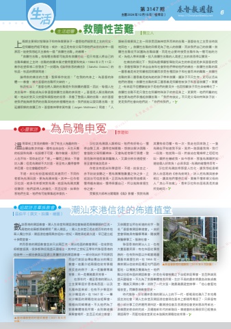 第 3147 期 主曆 2024年 12月 15日(禮拜日) http://ChristianWeekly.net 生 6活上兩期主要探討智障孩子和特殊需要孩子。儘管他們絕對是上主的兒女,但照顧他們絕不輕省;或許,這正是有些父母不想他們出世的其中一個原因。這使我想起天主教有一個「救贖性苦難」的教導。「救贖性苦難」指每種苦難都可能具有救贖功能,但只有當人將自己的苦難奉獻給上主時,苦難的救贖本質才變得重要和突出。1984年2月11日,教宗若望保祿二世發表了一封題為《論得救恩的痛苦》(Salvifici Doloris)的牧函,牧函的開頭寫道:論得救的痛苦的力量,聖保祿宗徒說:「在我的肉身上,為基督的身體—教會,補充基督的苦難所欠缺的。」牧函指出:「基督也將人類的苦難提升到救贖的層面。因此,每個人在其苦難中,都能成為分享基督救贖性苦難的參與者。」基督是人類苦難的典範。祂出於對天父的愛和順服祂的旨意,承擔了整個人類的苦難。由於基督使我們能夠將我們的苦難與祂的終極犧牲結合,我們就能以愛回應苦難,並延續耶穌的救贖工作。基督教神學家莫特曼(Jurgen Moltmann)寫道:「人類被召喚要與上主一同承受因無神世界而來的苦難。基督徒在上主受苦時與祂同在。」救贖性苦難的目標是為了他人的救贖,而非我們自己的救贖。救贖性苦難從不試圖為苦難辯護,而是在必要時接受苦難作為一種可能的方式,為他人帶來救贖。投入救贖性苦難的人渴望上主的救恩得以實現。在痛苦的類比下,我認為選擇讓智障胎兒出生的家庭就是參與基督的受苦,承擔智障孩子來自自身和社會對他們帶給他們的痛苦。救贖性苦難的第一層意義是肯定照顧者因照顧而承受各種因孩子和社會而來的艱難。救贖性苦難的第二層意義是她為她的孩子帶來救贖,讓孩子不只生存,更可以活出他們的潛能。救贖性苦難的第三層意義是照顧者被孩子和基督救贖了。事實上,有家庭不但體驗這孩子是他們的寶貝外,也因照顧孩子而生命被轉化了。救贖性苦難不是只發生在照顧特殊孩子的家庭身上,更要問,他們所屬的社會也要為他們承擔起救贖苦難。「我們有彼此」不只是父母向特殊孩子說,更是我們社會向他們說,「你們有我們」。數說香港的潮語教會,潮人生命堂和潮語浸信會無疑是兩條顯眼的巨流。兩者的名稱都清晰標明「潮人潮語」;潮人生命堂已是走過百年的本地華人獨立宗派,潮語浸信會再興亦迎向一世紀。兩者源起最久遠,早已建立起十多間堂會。然而香港的潮語教會並非只此兩巨流。潮汕地區的教會興旺,信徒對信仰相當認真,很多都熱切見證天國福音。其中於上世紀五零年代移居香港的信徒中,一部分參與以至建立原屬宗派的潮語教會,一部分則出於不同原因而自行創設自傳自養自治的獨立教會。這裏介述兩個信徒背景極度反差的例子:其一是醫療專業背景;另一是養豬農民背景。在那年代,遷至香港的潮汕人士主要聚居於香港島西區;以及九龍市區東部;也有不少聚居於尖沙嘴區的。在 1947 年,一羣尖沙嘴區的潮籍信徒自組聚會,積極向同鄉傳道。不久他們為了對應羣體增長所需,去到樂道擴展聚會場所,並且正式成立教會;又依隨堂址所在街道的名字,取名「基督教潮語樂道會」。由於堂會領袖具有醫療專業,隨後開展醫療事工,服務社會。移居香港的潮汕人士,也有大量基層民眾;有在市區從事勞務的,也有到市區以外範圍藉着農畜本業營生的。在 1955 年,幾家潮汕信徒家庭遷至屯門區的藍地,以養豬及養雞為生。他們難以往返市區的潮語教會,於是在母會鼓勵之下自組家庭聚會,並且熱誠見證天國福音。不久為了對應羣體增長所需,生計不易的農家將農舍改裝成教堂,隨後又興辦小學,消除了一代文盲。豬農雞農建堂辦學,「信心會藍地福音堂」閃爍香港教會歷史。時代推移,早年遷來香港的潮汕人士的下一代,都輕易地融入了本地粵語主流社會。潮人生命堂及潮語浸信會現在基本上都通用粵語了,只保留有極小部分事工仍然運用潮州話。觀潮浸信會及恩潮浸信會更刻意改用新名,表徵歷史使命的完成,及邁進新年代的新階段。樂道會的名稱很早已經撤去潮語兩字,而藍地福音堂更從未強調其潮籍信徒背景。救贖性苦難為烏鴉申冤溫哥華街上常見的動物,除了有主人拖着的狗,自顧自散步的貓,還有自由自在,天生天養的松鼠和烏鴉。松鼠樣子可愛,動作敏捷,見到行人也不怕,等你走近才「嗖」一聲爬上樹去,不會討人厭;但是烏鴉卻不大討喜,甚至有人覺得會帶來厄運,往往會驅趕牠們。不過,本地有份區報卻反其道而行,不同作者都為烏鴉叫屈,要為烏鴉申冤。其中一位作者莎拉說,她多年來都笑對烏鴉,她認為烏鴉其實很聰明:牠們認得人的臉孔,而且記恨,如果你惹牠們生氣,牠們有可能聚集起來復仇。莎拉說烏鴉跟人類相似,牠們有好奇心,懂得自製工具,識得控制衝動,想辦法解決困難,會協助父母照顧弟妹,又會為逝者舉行喪禮,發現危險時造假巢欺騙敵人,又識分辨交通燈號,甚至會背後說是非。作者沒有提出科學證明,不過,姑妄言之,亦不妨姑妄聽之。看烏鴉繁殖數量之快之多,上述說法可信度甚高。正因為烏鴉的智商這樣高,懂得趨吉避凶,懂得保護自己,所以能夠掌握生存之道。受緊張大師希治閣電影《鳥》影響,我對烏鴉其實有些恐懼。有一次,我走在回家路上,一隻烏鴉似乎知道我不安,竟然一路跟着我飛,我行一