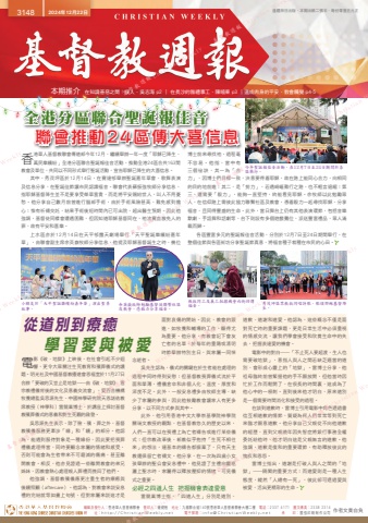 編輯及發行人:香港華人基督教聯會 督印人:鍾健楷 地址:九龍聯合道140號香港華人基督教聯會大樓二樓 電話:2337 4171 圖文傳真:2338 2314網 址:http://ChristianWeekly.net 電子郵箱:[email protected] 承 印:國強印刷制作公司 作者文責自負3148 2024年12月22日 逢禮拜日出版.本期出紙二張半.每份零售五元正香港華人基督教聯會傳道部今年12月,繼續舉辦一年一度「耶穌已降生、萬民樂繽紛」全港分區聯合聖誕報佳音活動,推動全港24區合共163間教會及單位,共同以不同形式舉行聖誕活動,宣告耶穌已降生的大喜信息。其中,秀茂坪區於12月14日,在寶達邨舉辦聖誕嘉年華會、歌舞表演及信息分享,在聖誕佳節讓市民認識福音。聯會代表蘇振強牧師分享信息,指耶穌基督降生並不是要享受榮華富貴,而是將平安賜給世人,叫人不用憂愁。他分享自己數月前曾進行腦部手術,由於手術風險甚高,難免感到擔心;惟有祈禱交託,結果手術後短時間內已可出院,超出醫生預期。因此他強調,基督徒同樣會遭遇困難,但因知道耶穌基督同在,祂流寶血赦免人的罪,故有平安和喜樂。上水區亦於12月14日在天平邨露天劇場舉行「天平聖誕樂繽紛嘉年華」,由聯會副主席余英嶽牧師分享信息,他提及耶穌基督誕生之時,幾位博士前來尋找祂,過程毫不容易。他指,當中有三個祕訣,其一為「合力」,因博士們目標一致,決意要得着耶穌,故在路上能同心合力,向相同的目的地前進;其二,是「努力」,若遇崎嶇難行之路,也不輕言退縮;第三,還需要「毅力」,能夠一直堅持,終能看見耶穌。余牧師以此勉勵眾人,在信仰路上需彼此協力聯繫社區及教會,憑着毅力一起尋找耶穌、分享福音,且同得豐盛的生命。此外,當日舞台上仍有其他表演環節,包括音樂默劇、手語舞和話劇等,台下則設有多個遊戲攤位,派送豐富禮品,眾人滿載而歸。各區豐富多元的聖誕報佳音活動,分別於12月7日至24日期間舉行,在整個佳節與各區街坊分享聖誕節真意,將福音種子栽種在市民的心田。本期推介 在知識善惡之間:僕人.吳志海 p2 ∣ 在長沙的雅禮事工.陳曉東 p3 ∣道成肉身的平安.教會觸覺 p4-5全港分區聯合聖誕報佳音聯會推動24區傳大喜信息從道別到療癒學習愛與被愛電影《破.地獄》上映後,在社會引起不少迴響,更令大眾關注生死教育和殯葬儀式的議題。明光社及中國基督教播道會恩福堂於11月27日合辦「要破的又豈止是地獄——由《破.地獄》 看宗教禮儀背後的文化及意義交流會」,愛百合機構牧養總監吳思源先生、中國神學研究院天恩諾佑教席教授(神學科)雷競業博士,於講座上探討基督教殯葬儀式的意義和對生死觀的啟發。吳思源先生表示,除了殮、殯、葬之外,基督教殯儀服務更牽涉「緣」和「續」的部分。他認為,能遇到服侍對象是一種緣份,因此要把喪葬禮儀處理得當,同時要顧念家屬的情緒和感受,否則可能會為生者帶來不可磨滅的傷痛,甚至離開教會。相反,他亦見證過一些離開教會的弟兄姊妹,因教會熱心處理親人葬禮而挽回了他們。他強調,基督教殯儀應更注重生者的療癒與後續照顧(aftercare)。他認為,對教會來說安息禮的完結就等如畫上句號,但對家屬來說這才是面對哀傷的開始。因此,教會的跟進,如牧養和輔導的工作,顯得尤為重要。他分享,有教會記下會友亡者的名單,於每年的重陽或清明時節舉辦特別主日,與家屬一同悼念逝者。吳先生認為,儀式的關鍵在於生者能在處理的過程中同時得到安慰;但基督教喪葬儀式流於平面和單薄,禮儀倉卒和非個人化,溫度、厚度和深度不足。此外,一般安息禮多由牧師主導,缺少了家屬的參與,因此他鼓勵教會讓家人有更多分享,以不同方式參與其中。此外,他引用香港中文大學崇基學院神學院關瑞文教授的觀點,在基督教悠久的歷史以來,人們一直可以在喪禮上為亡者禱告或進行某些儀式;但宗教改革後,新教似乎抱持「生死不相往來」的想法,連基本的禱告都摒棄了,只有天主教還保留亡者禱文。他分享,在一次為四歲小女孩舉辦的聖公會安息禮中,他見證了主禮向靈柩灑上聖水時,家屬得以釋放壓抑的情緒,可見儀式之重要。必經之四道人生 把握機會表達愛意雷競業博士指,「四道人生」分別是道別、道歉、道謝和道愛。他認為,這些概念不僅是面對死亡時的重要課題,更是日常生活中必須重視的情感交流,讓我們學會接受和欣賞生命中的失去,把握表達愛的機會。電影中的對白——「不止死人要超渡,生人也需要破地獄」,意指人與人之間若缺乏適當的道別,會形成心靈上的「地獄」。雷博士分享,他祖母臨終前曾緊握他的手不願放開,但他當時因忙於工作而鬆開了,在很長的時間裏,這成為了他心中的一根刺。直到後來他才明白,原來道別是一個需要時間消化和接受的過程。在談到道歉時,雷博士引用電影中角色透過書信互相道歉的情節,質疑為何人們常常等到死亡來臨才願意道歉。他分享自己父親從不向他道歉的經歷,直到父親晚年因失智症將銀行事務全權委託給他時,他才明白這是父親無言的道歉。他強調,道歉是復和的重要環節,有助釋放彼此的愧疚和恩怨。雷博士指出,道謝是打破人與人之間的「地獄」——隔閡的重要方式;而道愛則是一種人生態度,縱然「人總有一死」,彼此卻可透過愛與被愛,活出更精彩的生命。秀茂坪區眾教牧同唱詩歌,歌頌耶穌基督降生。今年聖誕報佳音活動