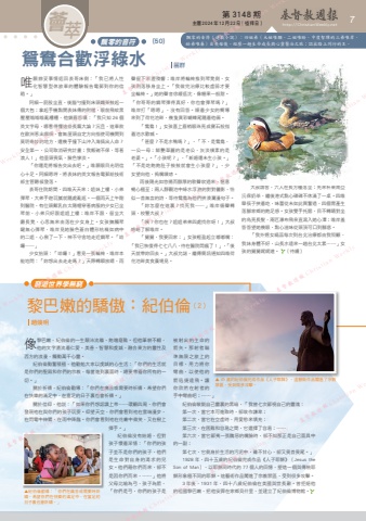 第 3148 期 主曆 2024年 12月 22日(禮拜日) http://ChristianWeekly.net 薈 7萃飄零的音符 (50) 飄零的音符(連載小說):四姐弟(大姐唯願、二姐唯盼、中度智障的三弟唯岸、幼弟唯眷)自喪母後,經歷一趟生命成長與心靈醫治之旅;認出路上同行的主。唯願辦妥事情返回表哥床側:「我已將人性化智慧型休旅車的體驗報告電郵到你的信箱。」阿細一屁股坐直,後腦勺撞到床頭鐵架鼓起一個大包;拿起手機點開表妹傳的附檔,眼前飛蚊黑壓壓嗡嗡嗡亂糟糟,他鎖眉怨嘆:「我只知 26 個英文字母,哪看得懂這些長篇大論?況且,這車款在歐洲惹出麻煩,會無厘頭自定方向指使司機開到莫明奇妙的地方,還幾乎撞下山沖入海搞出人命?安全第一,公司取消研究計畫;我飯碗不保,等著滾人!」他垂頭喪氣,臉色慘淡。「你還是將報告交出去吧。」唯願眼目光明信心十足。阿細嗯哼,將表妹的英文報告電郵給技術部主管聽候發落。表哥住院期間,四唯天天來;姐妹上樓,小弟彈琴,大弟手遊玩膩就隨處亂逛。一個雨天上午剛到醫院,有位頭戴乳白太陽帽穿著病服的少女已坐琴前,小弟只好跟姐姐上樓;唯岸不跟,留坐大廳長凳,心思無來由落在少女身上。女孩撫觸琴鍵無心彈琴,唯岸見她臉色蒼白體形枯槁如病中的二姐,心揪了一下,神不守舍地走近鋼琴。「哈囉──」少女抬頭:「哈囉!」看見一張輪椅,唯岸本能地問:「妳想出去走走嗎?」天際轉瞬放晴,雨聲留下淅瀝殘響;唯岸將輪椅推到琴凳側,女孩俐落移身坐上。「我做完治療比較虛弱才要坐輪椅。」她的聲音徐緩低沈,像糖果一般甜。「你哥哥的鋼琴彈得真好,你也會彈琴嗎?」唯岸打「嗯嗯」,沒有回答。順着少女的嚮導來到了荷花池畔,幾隻異彩蝴蝶尾隨着他倆。「鴛鴦!」女孩喜上眉梢眼珠亮成寶石般指着池水歡喊。「甚麼?不是水鴨嗎?」,「不,是鴛鴦,一公一母;鮮艷華麗的是老公,灰淡樸素的是老婆。」。「小孩呢?」,「新婚還未生小孩。」「不是吃飽飽肚子鼓鼓就會生小孩麼?」,少女望向他,摀嘴噗哧。雨後陽光如悠揚而醇厚的歌聲吹過來,愜意暢心極至;兩人靜觀池中綠水浮游的對對儷影,恰似一首無言的詩,等待鴛鴦為他們拼湊瀾漫句子。「妳怎麼在這裏?找死我──」唯岸循聲轉頭,校警大叔?「咦?你也在?姐姐弟弟四處找你呀!」大叔略略了解唯岸。「舅舅,我要回家;」女孩輕盈起立嘟嘟嘴:「我已恢復得七七八八,待在醫院悶瘋了!」,「後天就帶妳回去。」大叔允諾,繼傳簡訊通知四唯荷花池畔美食廣場見。大叔請客,六人在長方檯落坐;先來杯東南亞沅保奶茶,繼後港式點心碟碟不休滿了一桌。四唯舉筷子挾着吃,味蕾從未如此興奮過,四個胃產生落腳家鄉的飽足感。女孩雙手托腮,目不轉睛對坐的烏亮長髮,兩匹瀑布飛泉直瀉入她心潭;唯岸羞答答望她幾眼,點心滋味從頭頂可口到腳底。「我外甥女曉蕊每次到台北治療都由我照顧,我妹身體不好,山長水遠來一趟台北太累……」女孩的舅舅娓娓道。 (待續)鴛鴦合歡浮綠水黎巴嫩的驕傲:紀伯倫(2)麗群趙煥明窮遊世界學無窮像黎巴嫩,紀伯倫的一生顛沛流離,飽嚐磨難。但他筆耕不輟,他的文字湧流着仁愛、美善、智慧和虔誠,融合東方的靈性及西方的浪漫,觸動萬千心靈。紀伯倫勤奮積極,他勸勉大家以虔誠的心生活:「你們的生活就是你們的聖殿和你們的宗教,每當進到裏面時,總要帶着你所有的一切。」關於祈禱,紀伯倫勸導:「你們在痛苦或需要時祈禱,希望你們在快樂的滿足中、在富足的日子裏也會祈禱。」關於信仰,他說:「如果你們想認識上帝……環顧四周,你們會發現祂在與你們的孩子玩耍。仰望天空,你們會看到祂在雲端漫步,在閃電中伸臂,在雨中降臨。你們會看到祂在花叢中微笑,又在樹上揮手。」紀伯倫沒有結婚,但對孩子懷着深情:「你們的孩子並不是你們的孩子,他們是生命對自身的渴求的兒女。他們藉你們而來,卻不是因你們而來,……」他將父母比喻為弓,孩子為箭,「你們是弓,你們的孩子是被射出的生命的箭矢。那射者瞄準無限之旅上的目標,用力將你彎曲,以使他的箭迅捷遠飛。讓你欣然在射者的手中彎曲吧;……」紀伯倫敏銳自己靈裏的黑暗,「我曾七次鄙視自己的靈魂:第一次,當它本可進取時,卻故作謙卑;第二次,當它在空虛時,用愛慾來填充;第三次,在困難和容易之間,它選擇了容易;……第六次,當它鄙夷一張醜惡的嘴臉時,卻不知那正是自己面具中的一副;第七次,它側身於生活的污泥中,雖不甘心,卻又畏首畏尾。」1928 年,四十五歲的紀伯倫完成作品《人子耶穌》(Jesus the Son of Man),以耶穌同時代的 77 個人的回憶,塑造一個與傳統耶穌形象極不同的耶穌。這藝術作品闖進了宗教禁區,受到很多攻擊。3 年後,1931 年,四十八歲紀伯倫在美國與世長辭。曾拒絕他的祖國黎巴嫩,把他安葬在家鄉貝什里,並建立了紀伯倫博物館。▲ 45 歲的紀伯倫完成作品《人子耶穌》。這藝術作品闖進了宗教禁區,受到很多攻擊。▲紀伯倫勸導:「你們在痛苦或需要時祈禱,希望你們在快樂的滿足中、在富足的日子裏也會祈禱。」 Weekly 基督教週報 Christian Weekly 基督教週報 Christian Weekly 基督教週報 Christian Weeklyn Weekly 基督教週報 Christian Weekly 基督教週報 Christian Weekly 基督教週報 Christian Weekly 基督教週報 Christian W 基督教週報 Christian Weekly 基督教週報 Christian Weekly 基督教週報 Christian Weekly 基督教週