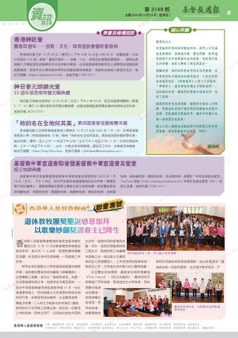 香港華人基督教聯會第 3148 期 主曆 2024年 12月 22日(禮拜日) http://ChristianWeekly.net 資 8訊主席:鍾健楷牧師 副主席:余英嶽牧師 出版部部長:吳思源先生 出版部顧問:梁銘牧師 鄺偉衡牧師 李志剛牧師 胡明添牧師 植栢燊先生 出版部委員:李炳光牧師 關銳煊先生 李鴻標牧師 吳渭濱先生 黃文江先生 許立中先生 翁傳鏗牧師 劉國偉牧師 張振華牧師 蘇永權先生 關鎮威牧師教會及機構短訊親愛的天父,在聖誕節即將來臨的靜謐時刻,我們心中充滿感恩與期待。當晚風吹拂,燈光閃爍,我們遙想起兩千多年前那個古老的夜晚,祢的愛子降生於馬槽,為世人帶來了希望與真光。環顧四周,我們或許會感受到生活的重擔,或許會想到很多親友尚未接受救恩,又或許會對未來感到迷茫,《約翰福音》三章十六節提到:「神愛世人,甚至將祂的獨生子賜給他們。」這份無私的愛,讓我們在黑暗中迎來光明,找到了倚靠。願我們學會包容與理解,讓愛的火焰在心中燃燒,更願這份祝福不僅在我們的教會或家庭中延續,更能擴展至整個世界,讓和平的種子在每一個角落生根發芽。願人人的心靈都在這個佳節中找到真正的平安與喜樂。奉耶穌基督的名祈求,阿們。關鎮威誠心所願香港神託會靈基百週年──宣教.文化.保育座談會暨新書發佈香港神託會已於 12 月 28 日(禮拜六)下午 2 時 30 分至 4 時 30 分,假靈基營(沙田沙田頭村 102 號)舉辦「靈基百週年──宣教.文化.保育座談會暨新書發佈」,講員為香港樹仁大學經濟及金融學系系主任李樹甘教授、宏恩基督教學院教育及心理學院助理教授林皓賢教授、香港中文大學崇基神學院助理教授德詩婷教授、港識多史創辦人黎善珩先生。報名可瀏覽:https://shorturl.at/vHvRo,查詢可電 2790-1511。神召會元朗錦光堂33 週年感恩崇拜暨交職典禮神召會元朗錦光堂將於 12 月 29 日(主日)下午 2 時 30 分,假亞洲國際博覽館(展館5、7、9)舉行 33 週年感恩崇拜暨交職典禮,由劉金勝總監督授職吳儀珠牧師為主任牧師。查詢可電 2479-3755。「祢的名在全地何其美」第四屆基督徒藝術雙年展香港藝術動力及將軍澳循道衞理小學將於 12 月 22 日至 2025 年 1 月 1 日,於將軍澳循道衞理小學(將軍澳唐俊街 15 號)舉辦「祢的名在全地何其美」第四屆基督徒藝術雙年展。展出時間:禮拜一至六上午 11 時至下午 6 時;主日下午 2 時至 6 時(1 月 1 日特別開放時間:上午 11 時至下午 4 時)。此外,大會亦設有開幕禮、講座及工作坊、音樂會及佈道會,報名可瀏覽:https://bit.ly/40uvGnq,查詢可電郵:[email protected]。聯會專號退休教牧團契聖誕感恩崇拜以歌樂妙韻見證救主已降生香港華人基督教聯會傳道部會員堂退休教牧團契已於 12 月 12 日在聯會禮堂舉辦聖誕感恩崇拜,當日共 71 人出席,透過歌聲樂韻獻呈頌讚,於見證分享中互相激勵,一同感謝上帝恩領。崇拜由馮林潔儀女士帶領會眾頌唱聖詩揭開序幕;退休教牧團契詩班則獻唱《揚聲讚美》,以歌聲獻上頌讚。當日以「聖誕齊感恩」為題,並由鄧達榮牧師分享,他感恩從年輕至退休,一直於中華基督教會香港區會服侍達 31 年。在此漫漫事奉路上,同時感謝太太李煥華牧師成為他的同行者,由學習到成為教師,以至獻身宣教、傳道及牧職,二人的生活軌跡均非常接近;隨後,他們的兒子亦同踏上牧職之路。他坦言一切盡是上帝的恩典,因有主同行,以致彼此能在共同的生命中,經歷共同的喜樂與辛酸。另外,他提及將臨期的第三個主日,點燃的第三枝蠟燭為喜樂之光,他以腓立比書四章四至七節提醒眾人,上帝是我們的喜樂泉源,惟返回上帝,方得着生命中最大的力量和鼓勵。及至團友表演環節,龐建新牧師即場獻唱《The Palms》、《君王的誕辰》;團契詩班手鈴隊進行手鈴演奏、黃道強先生口琴演奏,再由男聲合唱演出四重唱,現場掌聲此起彼落。崇拜結束後,由鍾健楷牧師和余英嶽牧師負責抽獎環節,送出多個獎項;隨後參加者一同享用愛筵,在主愛中聚首相交。基督教中華宣道會聯會暨基督教中華宣道會友愛堂按立牧師典禮基督教中華宣道會聯會暨基督教中華宣道會友愛堂將於 2025 年 1 月19 日(主日) 下午 3 時正,假屯門友愛邨宣道會陳瑞芝紀念中學 1 樓禮堂舉行胡俊鑾博士、潘曉雲傳道及黃偉立傳道之按立牧師典禮。按牧團成員為梁家麟牧師、李嘉明牧師、黃國維牧師、馮耀榮牧師、陳明泉牧師、胡家豪牧師、高銘謙牧師、譚頌恩牧師、李永聰牧師。典禮於「中華宣道會友愛堂」YouTube 頻道(http://www.youtube.com/c/ 中華宣道會友愛堂 1981)設網上直播,查詢可電 3708-1411。退休教牧聚首一堂,同心獻上感恩頌讚。團友們各施所長,以歌樂記念耶穌基督的誕生。 Weekly 基督教週報 Christian Weekly 基督教週報 Christian Weekly 基督教週報 Christian Weeklyn Weekly 基督教週報 Christian Weekly 基督教週報 Christian Weekly 基督教週報 Christian Weekly 基督教週報 Christian W 基督教週報 Christian Weekly 基督教週報 Christian Weekly 基督教週報 Christian Weekly 基督教週報 Christian Weekly 基基督教週報 Christian Weekly 基督教週報 Christian Weekly 基督教週報 Christian We