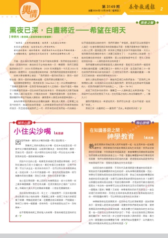第 3149 期主曆 2024年 12月 29日(禮拜日) http://ChristianWeekly.net 輿 2情因居所裝修,搬到尖沙嘴漆咸圍一間小酒店暫住。我雖然上班的地點在尖沙嘴,但從未在這區住過。印象中尖沙嘴是個商業區,以經濟活動為主,多的是商場、戲院、百貨公司、酒店等,很少想到它也有住宅區。所以住在尖沙嘴,對我來說是一個很新鮮的經驗。回說今次住的小區,毗鄰是漆咸道近香港歷史博物館,步行到紅磡站也只是十分鐘左右。鄰近有個天主教聖堂,日間門常開,可以入去坐坐。夜涼如水的日子,也可以到尖東海濱長廊走走。說起尖東,九十年代曾盛極一時,當時亮起聖誕燈飾,吸引無數市民前往觀賞,現在已式微,燈飾也是寥寥可數。這小區日間很靜,晚上因附近有幾間酒店,就十分熱鬧。街上最多韓國餐廳,我們也有光顧,但更欣賞信步之遙的「北京水餃」和藏身大廈天井位的聯威茶餐廳,二者皆是價廉物美。酒店側有間快遞公司,早上七、八點就開門,只見年輕的職員在點算大包小包的貨物,再搬運上貨車。疫情三年後大家都習慣了網購,帶動起速遞行業,但實體店就日漸衰微,門堪羅雀。惟街口小巷有一幅牆畫,很有特色,也常有遊客在此打卡,別有風味。若不看電視或網上那些惱人的新聞,香港的確是宜居的好住處。教會是需要由領袖及僕人與所有會眾一起,在主再來前一起被聖靈帶領,將耶穌復活的福音傳揚及成為生命見證。世界自從被罪的邪惡影響,令到黑暗常常遮蔽真理,教會羣體也同樣被黑暗遮掩我們渴慕光明真理的美善之心。不過,聖靈在羣體當中的引導卻是何等真實,我們也需要透過信仰反省的沈澱,透過聖經成為認證我們沒有被黑暗所污染,堅毅地活着為主作生命見證。信仰反省的沈澱累積,不同年代及處境便產生豐盛的信仰資源,幫助該世代教會羣體保持純全的信仰,成為神學的寶貴經驗。因此,神學也可理解為幫助信徒面對善與惡之間,對自己或身處的羣體認知身處的信仰光譜位置。怎樣可以避免黑暗滲透到信徒的生命?怎樣可以保護信徒朝向真光前進?到底怎樣的神學,才是該世代最合適的明燈真光?有沒有一套神學可以在主再來前完全百分百通用於全世界每一個種族 / 國家 / 羣體?又或者,神學教育的目的不是要建立一套全球通行的律例準則,而是在主再來前為要使身處各種黑暗階段的生命,得到聖靈的導引,可以得到與主復和的生命更新!神學教育相信是長闊高深,但同時也可以好清晰簡潔,就如耶穌表示:愛神愛人便是律法的總綱。現實世界我們都是知易行難,要將長闊高深的神學成為高舉的知識,或是身體力行與能陪伴的生命活出愛,這一切都是在主再來前同步並行;不過,若忘記善與惡之間的知識是屬於神,有時只是一步之差便令信徒跌入罪的邪惡、黑暗、暴力之內。願聖靈在信徒羣體當引導,使我們結出聖靈果子,以內裏的九種生命特質成為相信主必再來的見證。在知識善惡之間:神學教育「路再長,必有峰迴路轉處;夜再黑,已是接近天明時。有星星長照的夜,也有彩虹引入希望的明天。最兇暴的雷雨,過去得最快,最嚴寒的冬天正是春天早臨的前奏,有絢爛的陽光,盛開的花和花的芬芳,把新的喜樂帶到人間。」~佚名不錯,過去幾年我們經歷了許多不愉快的事情,我們相信這些都已過去。困難的時刻,痛苦的日子必有結束的一天,轉瞬間,我們又要面臨更新的日子,2024 年即將結束,2025 年快要臨到。今天是 2024 年最後的一個禮拜天,在這送舊迎新的時候,我們應用甚麼態度來面對呢?哈彿大學普賽博士曾說:「我們要找一個目的而努力,要找一首好歌去唱,要找一面好的旗幟去追隨,但我們要往哪裏找呢?」諾貝爾物理學得主,馬克斯彭恩(Max Born)在一次公開演講中說:「我雖然喜歡科學,但我思考的結論是令人沮喪的,理由不僅是一場核子大戰爆發而毀滅一切生命的可能性愈來愈大,即使這場大災難可能避免,我對人類只能見到一片黯淡的未來,我雖然喜歡科學,但是我有一種感覺即科學並不能被人類吸收,據我看來人類是沒有甚麼希望的。」身為科學家竟然講出如此悲觀的論調,實在使人驚異,但事實上在現今的世代,無論科技如何發達,人的物質享受如何吸引和教育制度如何普及,而且遠遠超越我們上一代,然而奇怪的是我們這一代的痛苦,似乎遠遠超過以前的世代,我們所謂的「幸福感」遠遠不及以前那麼令人滿足!社會各種怪異反常的現象層出不窮,各種矛盾衝突亦不斷發生,人與人之間、國與國之間、家與家之間產生很多不和諧的現象,天災人禍和戰爭的危機愈來愈大(其實已經發生了),大自然的人為破壞,生能的危機也愈來愈多,貧富懸殊,窮人在絕望無望中生活,青年人對前途徬徨失措……人類到底尚有沒有希望?我們確實地相信耶穌基督是人類的希望,聖經早已給我們一幅理想共融社會的藍圖,以賽亞書五十一章和六十五章,並且啟示錄二十一章也給我們將來新天新地的啟示,已清楚指示我們一幅美麗的圖畫。一條又活又新的路、新的目標和新的方向。當年人類在黑暗的日子,撒迦利亞頌已向我們宣告:「因我們上帝憐憫的心腸,叫清晨的日光從高天臨到我們,要照亮坐在黑暗中死蔭裏的人,把我們的腳引到平安的路上。」(路一 78-79)經過了四百多年的等待,彌賽亞—人類希望之光果真來臨,「在黑暗中行走的百姓看見了大光;住在死蔭之地的人有光照耀他們。」(賽九 2)讓我們重燃信念,