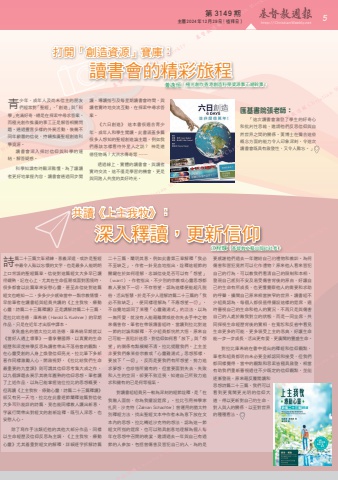 http://ChristianWeekly.net5 第 3149 期 主曆 2024年 12月 29日(禮拜日)青少年、成年人及尚未信主的朋友們經常對「聖經」、「創造」與「科學」充滿好奇,總是在探索中尋求答案,而極光創作推廣的事工正是解答相關問題。通過豐富多樣的外展活動,裝備不同年齡層的信徒,持續推廣聖經創造科學資源。讀書會深入探討信仰與科學的連結,解答疑惑。科學知識有時艱深難懂,為了讓讀者更好地掌握內容,讀書會通過同步閱讀、導讀指引及每星期讀書會時間,與讀者實時地交流互動,在探索中尋求答案。《六日創造》 這本書很適合青少年、成年人和學生閱讀。此書涵蓋多篇很多人想知的聖經創造論主題,例如我們應該怎樣看待外星人之說? 神是道德怪物嗎?大洪水傳奇等 ……透過線上、實體的讀書會,與讀者實時交流。這不僅是學習的機會,更是與同路人共度的美好時光。 詩篇二十三篇文筆精練、意義深遠,或許是聖經中最令人難以忘懷的文字,也是最多人能朗朗上口背誦的聖經篇章。信徒對這篇經文大多早已讀得嫺熟,記在心上,尤其在生命低潮或面對困境時,很多都會以此篇章來安慰心靈,甚至非信徒對這篇經文也略知一二,多多少少感染當中一點宗教情懷。早前筆者在讀書組與組員共讀的《上主我牧.療動心靈:詩篇二十三篇釋讀》正是講解詩篇二十三篇,是拉比哈洛德.庫希納(Harold S. Kushner)的早期作品,只是在近年才出版中譯本。享負盛名的猶太拉比哈洛德.庫希納早期就以《當好人遇上壞事》一書享譽國際,以真實的生命經歷和深度神學反思為讀者帶出不落俗套的觀點,在心靈受創的人身上煥發信仰亮光。拉比筆下多部著作同樣激勵人心、開啟視野,《拉比給我們生命最重要的九堂課》則可謂其信仰思考集大成之作,以九個課題去展示其晚年圓熟的信仰思想。筆者讀了上述作品,以為已能掌握這位拉比的思想概要,但再讀《上主我牧.療動心靈:詩篇二十三篇釋讀》卻又有另一天地,拉比在此書逐節闡釋這篇對信徒大多耳熟能詳的詩篇,竟也能同樣教人讀出新意,字裏行間帶出對經文的創新詮釋,既引人深思,也安慰人心。除了寫作手法類近他的其他大部分作品,同樣以生命經歷及信仰反思為主調,《上主我牧.療動心靈》尤其着重對經文的解釋,詳細逐字拆解詩篇二十三篇,闡明其意。例如此書第三章解釋「我必不至缺乏」,作者一針見血地指出,詮釋這經節的關鍵在於如何理解,忠誠信徒是否可以有「想望」(want)。作者指出,不少別的宗教或心靈思想都教人要放下一切,不存慾望,認為這樣便能超凡脫俗,活出智慧。於是不少人理解詩篇二十三篇的「我必不致缺乏」,便同樣理解為「不應想望一切」,不自覺地認同了某種「心靈雞湯式」的說法,以為一無所愛,就沒有人能藉離開或使你失去手中之物來傷害你。筆者在帶領讀書組時,當讀到拉比對這一節的討論和解釋,不少組員都恍然大悟,原來自己可能一直陷於迷思,對信仰如何看「放下」與「想望」的關係有點模糊不清。拉比提醒我們,上主並非要我們像某些宗教或「心靈雞湯式」思想那樣,要放下「一切」,反而是要我們有所想望,努力追求夢想,也珍惜所擁有的,但當要面對失去、失敗和人生的空洞,卻要不致沮喪,知道自己所致力追求和擁有的已是何等福氣。對讀書組組員另一較為深刻的經節詮釋,是「在我敵人面前,你為我擺設筵席」。拉比引用神學家扎民.沙克特(Zalman Schachter)曾運用的猶太特別釋經方法,找出聖經文本中作者未為意下放在文本內的思想。拉比轉述沙克特的想法,認為這一節經文所指的筵席,也可以稍具創意地理解為個人每年在思想中召開的晚宴,邀請過去一年與自己有過節的人參加,包括曾傷害及冒犯自己的人,為的是要感謝他們過去一年贈給自己的禮物和教訓。為何傷害和冒犯竟然可以化作禮物?原來他人看來冒犯自己的行為,可以教我們看清自己的限制和本相,發現自己感到不安及易受傷害背後的原由,好讓自己的生命有所成長,也更懂覺察他人的需要和求助的呼聲,擴闊自己原來相當狹窄的世界。讀書組不少組員認為,每個人都很值得攞設這樣的筵席,適時審視自己的生命和他人的實況,不再只是與傷害自己的人處於敵我對立的狀態,而是一同坐席,共同探視生命經歷背後的實相,在寬恕和反省中看見生命更多的可能,更多領受上主的恩典,好讓生命能一步一步成長,活出更有愛、更廣闊的豐盛生命。對拉比庫希納在書中提出的釋經和信仰觀點,筆者和組員都明白未必要全部認同和接受,但我們都同樣覺得,當中的觀點和思索皆極具啟發,相當有助我們重新審視過往不少既定的信仰觀點,並能逐漸發現,原來藉反覆閱讀和思想詩篇二十三篇,我們可以看到更寬闊更光明的信仰大道,得以更新對自己的生命、對人與人的關係,以至對世界的種種看法。匯基書院張老師:「這次讀書會激發了學生的好奇心和批判性思維,邀請他們反思信仰與自然世界之間的關係。黃博士在彌合這些概念方面的能力令人印象深刻,令這次讀書會既具有啟發性,又令人難忘。」打開「創造資源」寶庫:讀書會的精彩旅程黃逸恒(極光創作香港創造科學資源事工總幹事)共讀《上主我牧》:深入釋讀,更新信仰江程輝(基督教文藝出版社社長) Weekly 基督教週報 Christian Weekly 基督教週報 Christian Weekly 基督教週報 Christian Weeklyn Weekly 基督教週報 Christian 