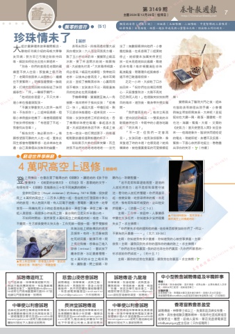 第 3149 期 主曆 2024年 12月 29日(禮拜日) http://ChristianWeekly.net 薈 7萃飄零的音符 (51) 飄零的音符(連載小說):四姐弟(大姐唯願、二姐唯盼、中度智障的三弟唯岸、幼弟唯眷)自喪母後,經歷一趟生命成長與心靈醫治之旅;認出路上同行的主。大姐計畫歸還休旅車離開飯店,聯絡好芳姨介紹的母親大學摯友萍姨;對方早已引頸企盼款待四唯,細說如何從台北搭火車過來。「別急,你們的套房是老闆的藏嬌屋不供人住宿;那隻嬌上個月跑了,老闆目前跟家人出國散心,繼續住不要緊咧!」明輝陰着雙眼一臉詭異,打掃完房間回眸向盼盼送了抹明媚春色,「拜」一聲順手關門。「他胡說些甚麼?」不只大弟,連小弟也搔着頭殼頂。「不讀文學書對大人世界一無所知,不告訴你!」二姐神氣揚揚,瞪眼小弟俐齒針他幾下;唯眷兩個腮幫子被針得怒鼓鼓:「有甚麼了不起,我會找出答案!」「報告交完,無必要白待。」唯願想望跟可靠的大人在一起,置身此陌生都會有種飄零感,若非弟妹在身邊,自己真像個出沒無常的幽靈。表哥出院日,四唯再遇校警大叔與白帽女孩;六人落座同張長方檯,點了五小杯珍珠奶茶,舅舅禁止曉蕊冰飲,要了杯溫開水給她。唯願掏錢,大叔搶先付清。「大家難得相識,何必客氣?曉蕊完成療程,我帶她回老家,以後未必會再見?」唯岸耳聞此言,直吸了幾顆黑珍珠,心裏悶悶很不暢快;女孩滴水不沾,兩眼漫無目的地游走在黑洞邊緣。手機嗶嗶響,舅舅踱至無人一角接聽。唯岸將杯子推向女孩:「吸幾口,快!」曉蕊大喜,呼嚕狂吸,剩下沉底珍珠推還他。姐弟見狀,一一照做;女孩快速將三杯奶茶吸光,吞了幾顆珍珠梗住喉嚨,拿起溫水直灌。大叔語速疾急話不休,長桌上後生有一搭沒一搭打開話匣子,四唯邊輕鬆歡談邊吸僅剩粉圓的杯子。盼盼展示大弟的招牌笑聲,而且誇張不自然地咯咯咯咯咯咯──沒完沒了;無數眼睛掃向他們,小眷尷尬臉羞,在桌底踢了二姐要她停止,她卻變本加厲笑得更狂放。從未見過她如此瘋癲,難道奶茶有毒?唯岸頓覺滿肚珍珠亂滾亂撞,胃隱隱升起脹痛感,逼不得已瞇着眼假寐。足足一小時,大叔乾了口水始回來。「祝你們在台灣玩得開心,天氣慢慢秋涼,太陽不再兇巴巴熱死人啦!」他通臉笑紋拍拍閉目的唯岸,道別後,動身帶外甥女離開。「我們會再見的。」唯岸立馬張眼,望向說話的曉蕊,一雙柔美的羊駝眼赫然在目,冬眠中的小鹿忽地蹦起:「明天嗎?」「 不 一 定, 但 我 們 一 定 會 再見。」女孩回道。這男孩很眼熟,像某隻過了時的卡通?在哪見過?她摀嘴噗哧,被他傻裏傻氣的可愛模樣逗樂。舅甥倆出了醫院大門之後,姐妹花協助表哥辦理出院手續,小眷慣例端坐琴前即興演奏,大弟呢?直挺挺站在大廳一隅,雞蛋、圖書館、荷花池、海鷗、鴛鴦、大衞 ‧ 艾蒙的《史凱力:當天使墜落人間》紛至杳來……他魂遊象外,腦袋快閃過短促的電光,稍縱即逝,身體不及反應,緊揪一下眉心依然原地挺立,憨憨露出淨白的笑牙。 (待續)珍珠情未了4 萬呎高空上退修麗群趙煥明窮遊世界學無窮登上飛機前,在書店買了龍應台的《傾聽》。讀過她的《孩子你慢慢來》、《親愛的安德烈》、《目送》等,喜歡她的文字,有情有理。《傾聽》是龍應台三十年不同演講的精粹。皇家約旦航空(Royal Jordanian)的 Boeing 787-8 飛機,很快便爬上 4 萬呎的高空上,二百多人擠在一起,各自努力打發面前十多小時的旅程:有人抱頭大睡、有人玩電子遊戲、看電影、讀文件、吃零食等……飛機先用 3 小時從香港飛去曼谷,乘客下機,乘客上機,機組人員替換,兩個多小時後再上路,曼谷飛約旦是另外 8 個小時。不知何時開始,竟然享受 4 萬呎高空上的獨處時刻。或者,不知不覺間,生活節奏變得太快太急,工作死線一個接一個,雙手雙腳根本無法追上網絡傳訊的速度及頻率。有時,生活像被困在死胡同裏,動彈不得。爬上長途飛機,想像自己進入靜修(retreat),嘗試放下纏身世務,忘記憂慮種種,在4萬呎的半空上喝杯熱茶、讀點書、閉上眼睛、聆聽內心、聆聽聖靈。「若不是耶和華建造房屋,建造的人就枉然勞力;若不是耶和華看守城池,看守的人就枉然警醒。你們清晨早起,夜晚安歇,吃勞碌得來的飯,本是枉然,惟有耶和華所親愛的,必叫他安然睡覺。」(詩篇一二七 1-2)主啊,工作中、家庭中、人事關係中實在太多枉然,你知道多少安然睡覺失去了。求主憐憫!「你們要先求他的國和他的義,這些東西都要加給你們了。所以,不要為明天憂慮……。」(太六 33-34)主啊,你知道我有多少憂慮,你知道我的心被世事擠着。主啊,救我!主啊,讓我回到先求你的國和你的義的路上。求主憐憫!「你們若常在我裏面,我的話也常在你們裏面,凡你們所願意的,祈求就給你們成就。」(約十五 7)主啊,願你的話常在我裏面,願我常在你裏面。求主憐憫!▲不知何時開始,竟然享受 4萬呎高空上的獨處時刻。▲爬上長途飛機,想像進入靜修,嘗試放下纏身世務,聆聽內心、聆聽聖靈。誠聘傳道同工屯門區教會。神學畢業經驗不拘,熱誠主動具團隊精神。有負擔教導及傳福音事工。履歷電郵[email protected]或寄屯門青海圍置樂花園85-87號地舖屯門基督教會。招聘用中華便以利會誠聘油麻地堂誠聘全職傳道神學畢業,負責關顧教養信眾及拓展福音事工。請繕履歷及蒙召見證[email protected]或寄九龍油麻地砵蘭街90號地下人事部收招聘用長洲堂誠聘傳道全職
