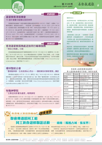 香港華人基督教聯會第 3149 期 主曆 2024年 12月 29日(禮拜日) http://ChristianWeekly.net 資 8訊主席:鍾健楷牧師 副主席:余英嶽牧師 出版部部長:吳思源先生 出版部顧問:梁銘牧師 鄺偉衡牧師 李志剛牧師 胡明添牧師 植栢燊先生 出版部委員:李炳光牧師 關銳煊先生 李鴻標牧師 吳渭濱先生 黃文江先生 許立中先生 翁傳鏗牧師 劉國偉牧師 張振華牧師 蘇永權先生 關鎮威牧師教會短訊親愛的天父,在這年終的時刻,我們懷着感恩的心來回首過去的一年。每一個晨曦的降臨,都是祢的恩典;每一個夜晚的寧靜,都是祢的守護。無論是歡笑的瞬間,還是挑戰的考驗,祢的陪伴總是如影隨形,讓我們在風雨中學會堅韌,在迷霧中尋得智慧。《彼得前書》五章七節:「你們要將一切的憂慮卸給神,因為祂顧念你們。」祢的安慰溫暖了我們的心靈。當生活的洪流將我們淹沒,祢的話成為我們的力量,讓我們勇敢面對每一個明天。展望未來,我們渴望在祢的恩典中,為祢的國度而奮鬥。願我們的心靈如春日的花朵,綻放出愛與希望,將祢的光輝傳遞給周圍的人。願我們的祈禱如清風,飄在祢的耳邊。期待明年的每一步都在祢的光中前行。奉耶穌基督的名祈求,阿們。關鎮威誠心所願香港華人基督教聯會墓園部 華人基督教墳場認可修墳/執骨承造商承 造 商 東主姓名 地 址 電 話忠記石廠 余永忠先生 九龍深水埗福華街 43 號 27280840合盛石廠 譚承東先生 九龍紅磡溫思勞街 33 號地下 23878440德安石廠有限公司 陳紫梃女士 香港柴灣連城道 240C 90192000江聯基石廠 林潔芳女士 香港域多利道大口環村 61 號 2817579690270334張碩記石廠 張經國先生 香港柴灣小西灣曉翠苑雅翠閣3207 室2817374493058157百福營造廠 藍金泉先生 九龍慈雲山蒲英里 8 號慈華大廈五樓 D 座 23277324陳諏建築公司 陳希和先生 香港域多利道大口環 977 號 2817740592698741朱炎記石廠有限公司 陳鎮藩先生 香港德輔道西 343 號均益商場16B 地下 23822445朱新記石廠有限公司 朱耀權先生 九龍紅磡馬頭圍道 37-39 號紅磡廣場二樓 B86 舖2395967890961877賴金記石廠有限公司 陳冠生先生 香港域多利道大口環 6485 地段 2817316194221238李煥記雲石公司 ( 梁華 ) 曾兆祥先生 九龍土瓜灣譚公道 82 號香港工商銀行大廈地下 25197618基督教香港信義會70 週年會慶分區聯合感恩崇拜基督教香港信義會 70 週年會慶分區聯合感恩崇拜將於 2025 年 1 月進行,主題為「七十傳承信義恩、憑信跨步向前行」。各區詳情:荃葵青嶼區於 1 月 5 日(主日)上午 10 時 30分,在該會天恩堂(葵涌葵盛圍 364 號)舉行;新界北區及沙馬區於 1 月 12 日(主日)上午 10 時 30 分,假心誠中學(新界粉嶺馬會道 270 號)舉行;九龍東區於 1 月 19 日(主日)上午 10 時 30 分,在該會真理堂(油麻地窩打老道 50 號)舉行;九龍西區及港島區亦於 1月 19 日(主日)下午 3 時正,在該會真理堂舉行;元屯天區於 1 月 26 日(主日)上午 10時 30 分,假宏信書院(新界元朗欖口村路 25 號)舉行。每場崇拜亦設有兒童崇拜,查詢可電 2388-5847 該會總辦事處。香港基督教服務處逆旅同行輔導服務「與自己相遇」小組香港基督教服務處逆旅同行輔導服務將於 2025 年 1 月 2 日至 23 日(逢禮拜四,共 4 節)晚上 7 時 30 分至 9 時 30 分,在尖沙嘴加連威老道 33 號舉辦「與自己相遇」小組。小組會透過不同的材料、圖咭及活動,不批判地探索和表達當下的內在情感和想法,由外到內調節心靈,與自己相遇。導師為輔導員顧美嫻姑娘,詳情及報名可瀏覽:https://www.hkcs.org/tc/services/nacs,查詢可電 2731-6251。環球聖經公會「靈修動與靜:生命泉源由心而出——讀經禱告的靜修實踐」講座環球聖經公會將於 2025 年 1 月 3 日(禮拜五)晚上 7 時 30 分至 9 時 30 分,假聖約教會堅樂堂(九龍灣牛頭角道 55 號利基大廈 B 座 1 樓)舉辦「靈修動與靜:生命泉源由心而出──讀經禱告的靜修實踐」講座,講員為香港浸信會神學院基督教教育助理教授藍志揚博士。免費講座,自由奉獻,報名及詳情可瀏覽:https://bit.ly/wwbsApplyonline,查詢可電郵[email protected] 或電 2356-7234。牧職神學院「互累症的影響及處理」晚間課程牧職神學院將於 2025 年 1 月 9 日至 2 月 13 日(逢禮拜四,共 5 堂)晚上 7 時 30 分至 9 時 30 分,在該院(沙田小瀝源源順圍 28 號都會廣場七樓)舉辦「互累症的影響及處理」晚間課程。內容:盡早發現互累症的徵狀、處理及改善情況,能有效提升成癮人士尋求協助的動機及成效。講員為鄧耀祖先生,詳情及報名可瀏覽:http://www.hkcmi.edu/te,查詢可電 2652-9133。聯會專號香港華人基督教聯會傳道部同工組將於2025年2月17至21日(禮拜一至五),前往湖南(鳳凰古城、張家界)舉行「同工新春退修聯誼活動」。歡迎聯會當年董事、各部組顧問委員、會員堂退休教牧團契團友;會員堂堂主任、牧師、傳道/宣教師、幹事及上述同工之配偶參加,報名由即日起至 2025 年 1 月 10 日(禮拜五)截止,名額 40 名。詳細內容、報名辦法及行程資料等,已郵寄至會員堂主任、當年董事、各部組顧問委員、會員堂退休教牧團契團友,查詢可電 2337-4171 與梁先生聯絡。聯會傳道部同工組同工新春退修聯誼活動──湖南(鳳凰古城、張家界)機構短訊 Weekly 基督教週報 Christian Weekly 基督教週報 Christian Weekly 基督教週報 Christian Weeklyn Weekly 基督教週報 Christian Weekly 基督教週報 Christian Weekly 基督教週報 Christian Weekly 基督教週報 Christia