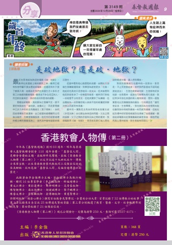 第 3149 期 主曆 2024年 12月 29日(禮拜日) http://ChristianWeekly.net 分 9享主編:李金強 頁數:368 頁出版: 定價:港幣 250 元香港教會人物傳(第二冊)試閱 今年為《基督教週報》創刊 60 週年,明年為香港華人基督教聯會創會 110 週年會慶。「基督在人間」是聯會會慶的主題,出版部率先響應,出版《香港教會人物傳(第二冊)》,以文字記述十九世紀至今,傳教士來華宣教,以至香港教會歷代教牧同工及傑出信徒的佳美腳蹤,從而見證「基督在人間」及福音遍傳香江的歷史。 此鉅著由李金強博士主編,彭淑敏博士為執行編輯,聯同 16 位專家學者(李志剛牧師、邢福增博士、黄文江博士、黄彩蓮博士、吳梓明博士、范晋豪牧師、陳智衡博士、湯泳詩博士、胡健斌博士、黎子鵬博士、陳睿文博士、梁家麟牧師、翁傳鏗牧師、黄慧賢博士、許開明牧師、胡清心博士)撰寫百位教會先賢傳記。全書共分四大章:首章記錄了 32 位傳教士的故事;第二章記錄來自各宗派 25 位傳道先賢的貢獻;第三章分別挑選了教育、醫療、文字、社會服務界別的先賢;第四章收錄了 21 位傑出信徒。 《香港教會人物傳(第二冊)》現已公開發行,定價為港幣 250 元,查詢可電 2337-4171。靈風漫步是破地獄?還是破.地獄?最近在香港成為熱話的電影《破·地獄》,難得在美國候士頓的戲院上映,雖然已經有牧者呼籲不要去看這部電影;但還是和外子買了戲票入場,這應該是我們在美國生活十多年才第三次進戲院觀賞電影。觀眾差不多全是亞洲人,而且都說廣東話,真的有些回到香港的感覺。 看罷這部電影,真的要為它發聲平反。請不要把焦點放在「破地獄」這儀式上,而是要看戲中已步入中年的主角魏道生(黃子華飾),如何因疫情導致百業蕭條,自己經營的婚禮顧問公司無法維持,而轉營殯儀服務。他是想把經營婚禮的概念轉到殯儀服務上,當然其中會有碰壁的情況發生。但當中看到他心路歷程的改變,由開始只想做生意賺錢還房貸,到學習為逝者更衣、化裝;他起初也真的只是想省回一些支出,但其後看到他是對逝者多了一份尊重和敬意。縱然同行對他一些經營手法有意見,但他其實除了為賺錢,也自覺能為一些對離世親人依依不捨的親屬提供解決辦法而感到有意義。戲中另一賣點是主角如何幫助老前輩文叔(許冠文飾)去化解自身家庭的問題。父女之間的誤解、父子之間的矛盾和兄妹之間的衝突。我想電影用《破·地獄》,意思就是要打破人間地獄的情感牢籠,讓人得到釋放。我很欣賞魏道生在戲中的一段對白,意思是:不止死者要超渡(當然我們基督徒不認同超渡這說法),生者也需要破地獄,生者都有好多地獄。在我看來,超渡也可解釋為幫忙過渡。我記得多年前在美國的華人電視頻道,看到一個售賣墓地以及殯儀服務的廣告,它的標語是「讓死者安息,生者釋懷」。我也曾因為在疫情間未能在醫院陪伴母親到最後一刻而感到遺憾,但能在送別禮中好好跟母親道別也填補了這個遺憾。願借這部電影向從事殯儀業的業者致敬,願他們能用真心看待逝者,對生者能有同理心。郭嘉慧讀者投稿 Weekly 基督教週報 Christian Weekly 基督教週報 Christian Weekly 基督教週報 Christian Weeklyn Weekly 基督教週報 Christian Weekly 基督教週報 Christian Weekly 基督教週報 Christian Weekly 基督教週報 Christian W 基督教週報 Christian Weekly 基督教週報 Christian Weekly 基督教週報 Christian Weekly 基督教週報 Christian Weekly 基基督教週報 Christian Weekly 基督教週報 Christian Weekly 基督教週報 Christian We