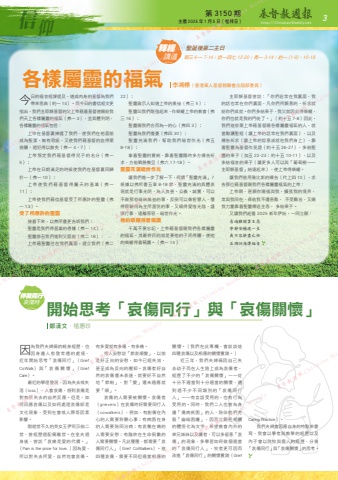 信仰第 3150 期 主曆 2025 年 1 月 5 日(禮拜日) http://ChristianWeekly.net3今日的福音經課提及,道成肉身的基督為我們帶來恩典(約一 14)。而今日的書信經文更指出,我們主耶穌基督的父上帝藉着基督曾賜給我們天上各樣屬靈的福氣(弗一 3),並具體列明,各樣屬靈的福氣包括:上帝在基督裏揀選了我們,使我們在祂面前成為聖潔、無有瑕疵,又使我們藉基督的血得蒙救贖、過犯得以赦免(弗一 4,7);上帝預定我們藉基督得兒子的名分(弗一5);上帝在日期滿足的時候使我們在基督裏同歸於一(弗一 10);上 帝 使 我 們 藉 基 督 得 屬 天 的 基 業( 弗 一11);上帝使我們藉信基督受了所應許的聖靈(弗一 13)。受了所應許的聖靈接着下來,以弗所書更告訴我們:聖靈是我們得基業的憑據(弗一 14);聖靈感召我們進到父面前(弗二 18);上帝藉聖靈住在我們裏面,建立我們(弗二22);聖靈啟示人知道上帝的奧祕(弗三 5);聖靈叫我們剛強起來,作榮耀上帝的教會(弗三 16);聖靈賜我們合而為一的心(弗四 3);聖靈為我們擔憂(弗四 30);聖靈充滿我們,幫助我們暗世作光(弗五8-18);拿着聖靈的寶劍,靠着聖靈隨時多方禱告祈求,方能戰勝撒旦(弗六 17-18)。聖靈充滿暗世作光讓我們進一步了解一下,何謂「聖靈充滿」?根據以弗所書五章 8-18 節,聖靈充滿的具體表現就是行事光明,為人良善、公義、誠實,可以不做那些暗昧無益的事,反倒可以像智慧人,懂得察驗何為主所喜悅的事,又曉得愛惜光陰,謹慎行事,遠離邪惡,暗世作光。祂的榮耀得着稱讚千萬不要忘記,上帝藉基督賜我們各樣屬靈的福氣,其最終目的就是要祂的子民得贖,使祂的榮耀得着稱讚。(弗一 14)主耶穌基督曾說:「你們若常在我裏面,我的話也常在你們裏面,凡你們所願意的,祈求就給你們成就。你們多結果子,我父就因此得榮耀,你們也就是我的門徒了。」(約十五 7-8)因此,我們這些蒙上帝藉基督賜各樣屬靈福氣的人,就當勤讀聖經(讓上帝的話常在我們裏面),以及禱告祈求(讓上帝的旨意成就在我們身上),靠着聖靈為基督作見證(約十五 26-27),多結聖靈的果子(加五 22-23;約十五 10-11),以及多結福音的果子(讓更多人可以與「葡萄樹—主耶穌基督」結連起來),使上帝得榮耀。讓我們借用雅比斯的禱告(代上四 10),求告那位藉基督賜我們各樣屬靈福氣的上帝:上帝啊,甚願你賜福與我,擴張我的境界,常與我同在,保佑我不遭患難, 不受艱苦,又賜我力量靠着聖靈傳送主恩, 多結果子。又讓我們趁着 2025 新年伊始,一同立願:易過難關靠主恩寧靜安穩渡一生義不容辭盡己任五湖四海傳福音各樣屬靈的福氣 開始思考「哀傷同行」與「哀傷關懷」有多愛就有多傷、有多痛。旁人安慰說「節哀順變」,以前是好正向的安慰,如今已經失效,甚至成為反向的壓抑。哀傷者好自然的哀傷還未表達,就要好不自然地「節制」,對「變」還未適應就要「順」。哀傷的人需要被關懷。哀傷者(grievers)在哀傷時好需要同行人(cowalkers),例如,有創傷在內心的人需要聆聽心事;有病困在身的人需要陪同治病;有哀慟在痛的人需要安慰;有臨終在生命倒數的人需要關懷。凡此種種,都需要「哀傷同行人」(Grief CoWalkers)。這四種哀傷,需要不同但適當相應的關懷。(我們在此專欄,會談談這四種哀傷以及相應的關懷實踐。)近三年,我們夫婦倆因自己失去幼子而在人生路上成為哀傷者,經歷了不少的「哀傷關懷」——從十分不適當到十分適當的關懷,遇到過不少不同類別的「哀傷同行人」——有言語受用的、也有行為受用的。同時,我們二人也曾為身邊「傷病疾困」的人,陪伴他們克服「幽暗困纏」,因而立願把相關的體悟化為文字,希望教會內外的弟兄姊妹以及讀者,可以多留意「哀傷」的現象,多學習如何做個適當的「哀傷同行人」,牧者更可因而改進「哀傷同行」的關懷實踐(Grief 李鴻標(香港華人基督教聯會出版部委員)鄭漢文.植惠珍釋經講道伴我同行哀傷時因為我們夫婦倆的親身經歷,也因身邊人愈發常遇的處境,近年開始思考「哀傷同行」(Grief CoWalk) 與「 哀 傷 關 懷 」(Grief Care)。最近的學理發現,因為失去或失落(loss),人會哀傷,感到哀傷是對有所失去的自然反應。但是,如何回應哀傷以及如何處理哀傷卻是文化現象,受到社會或人際等因素影響。剛逝世不久的英女王伊莉莎伯二世,曾經歷過配偶離世。在皇夫過身後,曾說「哀痛是愛的代價。」(Pain is the price for love. )因為愛,所以對失去所愛,自然地會哀傷。Caring Practice)。我們夫婦會因應自身的特點來書寫,我會以學者與教學的經歷以及內子會以院牧與個人的經歷,分享「哀傷同行」與「哀傷關懷」的思考。聖誕後第二主日耶三十一 7-14;詩一四七 12-20;弗一 3-14;約一 (1-9)、10-18 Weekly 基督教週報 Christian Weekly 基督教週報 Christian Weekly 基督教週報 Christian Weeklyn Weekly 基督教週報 Christian Weekly 基督教週報 Christian Weekly 基督教週報 Christian Weekly 基督教週報 Christian W 基督教週報 Christian Weekly 基督教週報 Christian Weekly 基督教週報 Christian Weekly 基督教週報 Christian Weekly 基基督教週報 Christian Weekly 基督教週報 Christian Weekly 基督教週報 Christian We