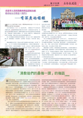 第 3150 期 主曆 2025 年 1 月 5 日(禮拜日) http://ChristianWeekly.net5香港華人基督教聯會傳道部婦女組 聯會婦女喜樂遊(澳門)──有深度的旅程| 吳鳳筠適逢 2024 年澳門回歸 25 週年,聯會傳道部婦女組於 12 月 2 至 4 日前往澳門舉行婦女喜樂遊。首天行程即前往「Team Lab 超自然空間」,面積達五千平方米的沈浸式藝術空間。踏進會場即置身於變幻的花卉世界,幻彩燈光的水晶宇宙,充滿自由浮動球體的互動空間;參觀者描繪的水底生物可投影遊走在四周的螢幕上。接着參觀「益隆炮竹廠舊址」及「官也街」購買手信。晚餐後返回酒店舉行分組聚會,團友互相分享信主的經歷和數算主恩。第二天早禱會由李德榮牧師引用箴言卅一章十至十三節,鼓勵姊妹們倚靠上帝、發揮影響力、參與事奉、互相學習、事主盡力、常常祈禱、敬畏上帝!隨後參觀聖安多尼堂,因為在此舉行的婚禮多以鮮花裝飾,故又稱「花王堂」。在 1874 年的風災中聖堂被雷電擊中起火,卻因此引導船隻回港,令漁民平安登岸,故每年都會慶祝「天災節」以為紀念。繼而前往聖若瑟修院聖堂,本屬於聖保祿學院(現大三巴牌坊前身)的分院,故有「小三巴」之稱。2005 年修院和聖堂被列入世界文化遺產名錄。午餐後到訪聖公會樂天倫賭博輔導暨健康家庭服務中心,由馬偉利牧師接待。這是一個以家庭為本,針對受賭博問題困擾人士,提供專業戒賭輔導及家庭輔導的中心。我們不單參觀了模擬賭場、情緒療癒和親子情緒表達空間,亦參與各項體驗活動。隨後前往聖公會馬禮 遜 堂, 追 念 馬禮遜牧師來華宣教的事蹟。黃昏祈禱會由周寶熙牧師以傳道書三章一至十一節分享,縱然我們在事奉崗位上有時會遇到困難,只要全心仰望、交託,相信上帝仍然掌管,一切會按上帝的旨意成就,堅持下去,生命必會因此得着祝福!第三天早禱會由張沛義牧師主講「以色列小女子」,經文選自列王紀下五章一至五節;九至十五節。講述乃縵從被擄的以色列小女孩口中,得悉以利沙能醫治他的痲瘋病,而前去求醫,最終得痊癒。小女孩值得我們學習:愛心、信心、勇敢、美好生活見證。我們要學習她的優點,作好見證,在各自崗位上盡忠,領人認識上帝是獨一真神!隨後參觀大三巴牌坊,聖保祿教堂正面前壁的遺址,亦是聯合國教科文組織世界遺產。接着參觀另一澳門世界遺產玫瑰堂,由聖多明我會(道明會)創建於 1587 年,是該會在中國的第一所教堂。教堂初時用木板搭建,華人稱之為「板樟廟」。又因教堂供奉玫瑰聖母,故又稱「玫瑰堂」。中午於澳門旅遊塔享用葡式自助餐,餐後到第 58 及 61 層欣賞 360 度的澳門景色。三日兩夜的旅程至此完結。這次澳門之旅令筆者最深感受就是馬禮遜牧師的宣教精神,他在艱難惡劣的環境中,仍然不放棄,繼續傳教,他不單編製第一部華英字典,更翻譯了全本聖經,使我們有福份認識主,有中文聖經可讀!上帝的作為非常奇妙!求主幫助我們,使我們站穩崗位,作美好的見證,將福音廣傳!阿們。「清教徒們的最後一課」的後話筆者現身居美國,於新英格蘭地區植堂宣教,在學習清教徒移民到美洲大陸拓荒宣教的精神之餘,亦喜歡鉤沉教會在北美洲大陸上的宣教歷史案例,希望以史為鑑,以端正我們面向未來,開荒佈道植堂的信心。1999 年我初抵美國波士頓進修,即發現麻州有一個有趣的鎮,名叫廣東(Canton)。麻州的廣東鎮建於 1797 年,是由以利亞.鄧巴(Rev. Elijah Dunbar)牧師所命名,鄧巴牧師生於 1740 年,逝於 1814 年。他畢業於哈佛學院,終生熱愛音樂教育,並且興學傳道,是麻州廣東鎮公立圖書館的奠基人。他在廣東鎮出任牧職達 56 年,於 1814 年 10 月 25 日去世,享年七十五歲。他的墓碑銘文如下:當哭泣的朋友們在他無聲的墳墓前彎腰,述說他的美德,惋惜他們的損失,信仰之眼,卻穿過沈悶的陰霾為他歡呼,在那裏,眼淚將不再流淌。Beati Domino Morientes。(拉丁語,意為「主內蒙福而死」)現代人也許不再深究鄧巴牧師為甚麼將當時新設立的城鎮命名為「廣東」了,傳聞中只說他誑稱廣東鎮所在地球的正對點就是遠東大清國所在的廣東,所以這個鎮就被命名為廣東。然而,筆者對此有不一樣的解讀。基督徒移民在 1620 年抵達新大陸,歷經百年拓荒,在 1776 年已經走向獨立的合眾國。鄧巴牧師所在的時代正是政治激情對立,經濟生活困頓的年代。雖然時局動盪不安,然而新英格蘭的牧師們並沒有停止宣講聖經真理和推動美國教會回應基督的大使命,向全球宣教。鄧巴牧師命名新的市鎮為「廣東」正寓意着他對於遠東宣教的嚮往,他同時也勉勵着他的會眾,在追求大覺醒的信仰復興之時,亦要銘記大使命,支持普世的宣教,將基督耶穌的福音,傳向遠方,這才是他將新市鎮命名為「廣東」的理由。美國教會四百年所經歷的四次大覺醒運動,對於教會的宣教運動影響是巨大的。美國海外傳道委員會(American Board of Commissioners for Foreign Missions,ABCFM)全稱是美國公理宗海外傳道部,簡稱美部會,就是在第二波大覺醒運動(1800s-1830s)後設置的首間美國基督教海外傳教機構。美部會自從 1812 年派出第一批 5 名傳教士後,在 28 年內,差遣不同差會成千上百名的年輕宣教士進入印度(孟買地區)、錫蘭(今斯里蘭卡)北部的賈夫納半島、桑威奇羣島(夏威夷),東亞(中國、新加坡和暹羅),中東(希臘、塞浦路斯、土耳其、敘利亞、巴勒斯坦和波斯)以及非洲(西非—Cape Palmas