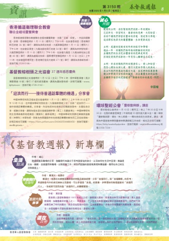 資訊香港華人基督教聯會 主席:鍾健楷牧師 副主席:余英嶽牧師 出版部部長:吳思源先生 出版部顧問:梁銘牧師 鄺偉衡牧師 李志剛牧師 胡明添牧師 植栢燊先生 出版部委員:李炳光牧師 關銳煊先生 李鴻標牧師 吳渭濱先生 黃文江先生 許立中先生 翁傳鏗牧師 劉國偉牧師 張振華牧師 蘇永權先生 關鎮威牧師第 3150 期 主曆 2025 年 1 月 5 日(禮拜日) http://ChristianWeekly.net8親愛的主啊,求你幫助我們在新一年的開始,忘記昨天,仰望明天,藉着祢的恩典,大有盼望;求祢不讓我們停留在靈命的岸邊,而是努力奔跑,追求那在地若天的屬靈體驗,生命更新成長。主啊,感謝祢從歲首到年終的保守和帶領,過去一年,祢讓我們每時每刻經驗祢的同在,並讓我們的生活充分體會祢的恩典是夠用,因而促使我們在新的一年有信心繼續追求成長。主啊,祈求祢賜我們時刻懷着信心、愛心和盼望,憑信心開往水深之處,履行大使命作得人的漁夫;求主叫我們羨慕渴想錫安大道,並在神的家裏事奉,建立和實踐守望相助的關係,活出屬靈生命的品格,並繼續作福音的見證使者,傳揚祢奇妙的救恩。阿們。李國權香港循道衞理聯合教會聯合金禧培靈奮興會香港循道衞理聯合教會聯合金禧培靈奮興會,主題「呈獻、仰望」,共設四個聯區,詳情:香港聯區將於 1 月 11 日(禮拜六)下午 6 時,在該會香港堂(香港灣仔軒尼詩道 36 號)舉行,講員為李炳光牧師;九龍東聯區將於 1 月 11 日(禮拜六)下午 6 時,在該會安素堂(九龍油麻地窩打老道 54 號)舉行,講員為林崇智牧師;九龍西聯區將於 1 月 11 日(禮拜六)下午 5 時,在該會九龍堂(九龍油麻地加士居道 40 號)舉行,講員為盧龍光牧師;國際禮拜堂聯區將於 1 月 12 日(主日)上午11 時,在該會國際禮拜堂(香港灣仔皇后大道東 271 號)舉行,講員為李鼎新牧師。查詢可電 2528-0186。基督教榕樹頭之光協會 37 週年感恩慶典基督教榕樹頭之光協會將於 1 月 12 日(主日)下午 3 時,假中華聖潔會(長沙灣懷惠道 18 號)舉行 37 週年感恩慶典,講員為蕭如發牧師。詳情可瀏覽:www.lightyst.com,查詢可電 2729-2142。「迎浪而行——接待普通話羣體的機遇」分享會中國神學研究院及福音證主協會將於 1 月 11 日(禮拜六)上午 9 時 30 分至下午 12 時 15 分,在中國神學研究院校舍(九龍塘德雲道 5 號)合辦「迎浪而行——接待普通話羣體的機遇」分享會,內容包括本地普通話初職調查發布、主題信息分享、經驗分享會。講員為福音證主協會副總幹事(事工)呂慶雄博士、中國神學研究院主恩澤森教席助理教授(實踐科)蘇慕瑜博士、中國神學研究院滕近輝教席副教授(神學科)宋軍牧師。對象為有興趣服侍本地普通話羣體的教牧同工及信徒領䄂。詳情及報名可瀏覽:https://form.jotform.com/243432504488458,查詢可電郵:[email protected]。教會及機構短訊誠心所願生活點滴伴我同行哀傷時墓園先賢故事道在井旁《基督教週報》新專欄作者: 鄭漢文、植惠珍 鄭漢文、植惠珍夫婦會因應自身的特點及親身經歷,分享「哀傷同行」與「哀傷關懷」的思考,希望教會內外的弟兄姊妹以及讀者,可以多留意「哀傷」的現象,多學習如何做個適當的「哀傷同行人」,牧者更可因而改進「哀傷同行」的關懷實踐。作者: 綠心透過校園及職場的分享,鼓勵現代知識分子思考基督徒的身分,以及如何在生活中呈現;無論是交友、婚姻、金錢運用和職場,以致宣教工作;將我們認識的基督教真理和價值觀,應用在自己的生活和家庭上。作者: 黃彩蓮香港華人基督教聯會於 1915 年成立之初,接管港九兩地(香港薄扶林及九龍聯合道)華人基督教墳場,為聯會最早的事工之一。百多年來,不少牧者及教會領袖安葬於這兩個墓園內,他們的生命故事反映了時代的艱辛,與及信徒堅實的信仰,足為後輩景仰。作者分享兩墓園的先賢故事,既是紀念,亦是勉勵今天留在香港的牧者信徒:基督在人間。作者:劉國偉這個專欄逢每月第二週刊出。「道在井旁」是一個從聖經出發,詮釋經文於生活場景與職場現實的平台,從而反思信仰,提升心靈,由上帝話語得着力量,並發現上帝就在我們當中——原來是耶穌在井旁,向我們說話。環球聖經公會「靈修動與靜」講座環球聖經公會將於 1 月 10 日(禮拜五)晚上 7 時 30 分至 9 時30 分,在聖約教會堅樂堂(牛頭角道 55 號利基大廈 B 座 1 樓)舉辦「靈修動與靜:禱告:神人相遇——導向使命與生命更新」講座,講員為中國宣道神學院靈修神學講師賴玉芳老師。報名及詳情可瀏覽:https://bit.ly/wwbsApplyonline,查詢可電郵:[email protected] 或電 2356-7234。 Weekly 基督教週報 Christian Weekly 基督教週報 Christian Weekly 基督教週報 Christian Weeklyn Weekly 基督教週報 Christian Weekly 基督教週報 Christian Weekly 基督教週報 Christian Weekly 基督教週報 Christian W 基督教週報 Christian Weekly 基督教週報 Christian Weekly 基督教週報 Christian Weekly 基督教週報 Christian Weekly 基基督教週報 Christian Weekly 基督教週報 Christian Weekly 基督教週報 Christian We