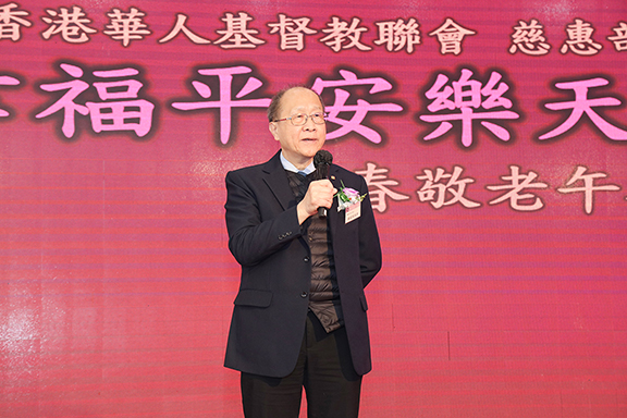 聯會主席兼義務總幹事鍾健楷牧師致歡迎詞提及,在此迎春接福的日子,是年亦為聯會誕生110周年,主題「基督在人間」,祝願與會者滿載上帝的福氣,感受從上而來的平安喜樂。聯會慈惠部部長關銳煊先生藉是次午餐會主題「幸福平安樂天倫」向大家送上祝福,並引述經文「你要認識神,就得平安,福氣也必臨到你。」(伯二十二21),指出惟認識上帝,經歷祂無比的愛,方得着永恆的福樂。