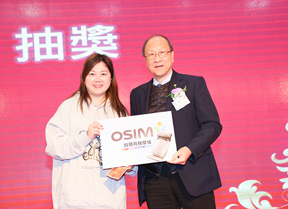 ▲鍾健楷牧師致送全場大獎「肩頸背按摩儀」予獲獎幸運兒。