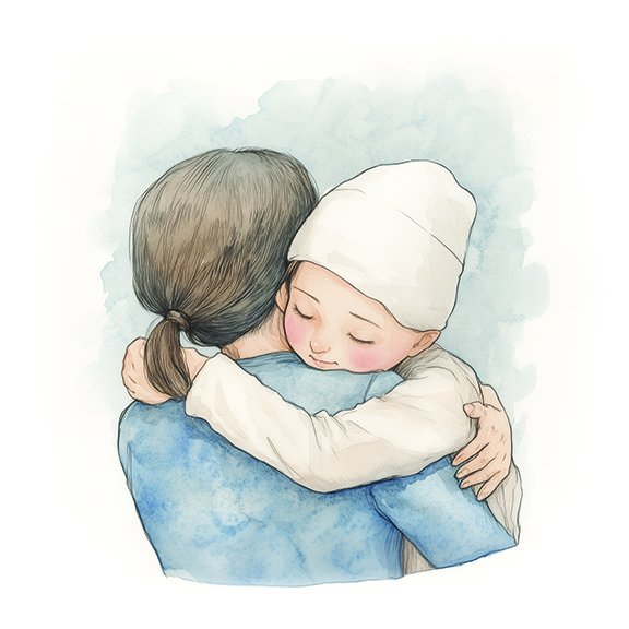 「妳會慢慢康復的。」萍姨環抱女兒,輕碰她頭上的白帽。