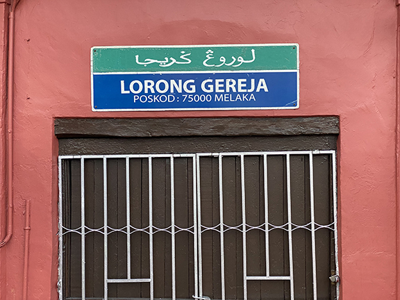 ▲聖芳濟堂側旁路牌,Lorong 是小街, Gereja 是教堂,相當於「教堂里」(2024年1月攝)