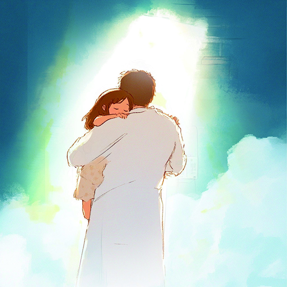 此際間,沿床六人看見同一景象──一位白衣人動作俐落揹起曉蕊,往光源前行;女孩瘦削的病軀趴在祂肩背沈沈熟睡,全然鬆弛,嘴角靜流一線笑水……直等最後一口氣呼出、不再進氣,她嬌嫩的娃娃臉貼住白衣人的寬肩穿過一段黑暗,繼續往黎明的光海,漸行、漸遠;沿途空氣清新、視野明麗,有取之不竭的氧氣……各人耳畔傳過節拍康健的呼吸聲,均勻、平和、舒坦,剛出母腹般完好無瑕……光的盡頭,爸爸和舅媽捧着兩籃新鮮水果;四唯的母親和沈海而回的父親認出那頭短髮,雙雙笑臉迎迓……