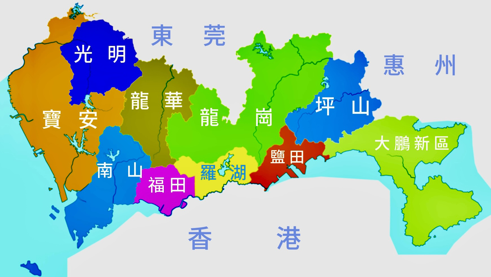 深圳市現時劃分9個行政區及1個尚未成立行政的新區。鄰貼香港,由東至西:繞着半個大鵬灣的大鵬新區,瀕臨沙頭角海的鹽田區,長期最近便香港的羅湖區,位處深圳河出口的福田區,環抱以往慣稱后海灣的南山區。鄰貼內地,由西至東:寶安區、光明區、龍華區、龍崗區、坪山區。