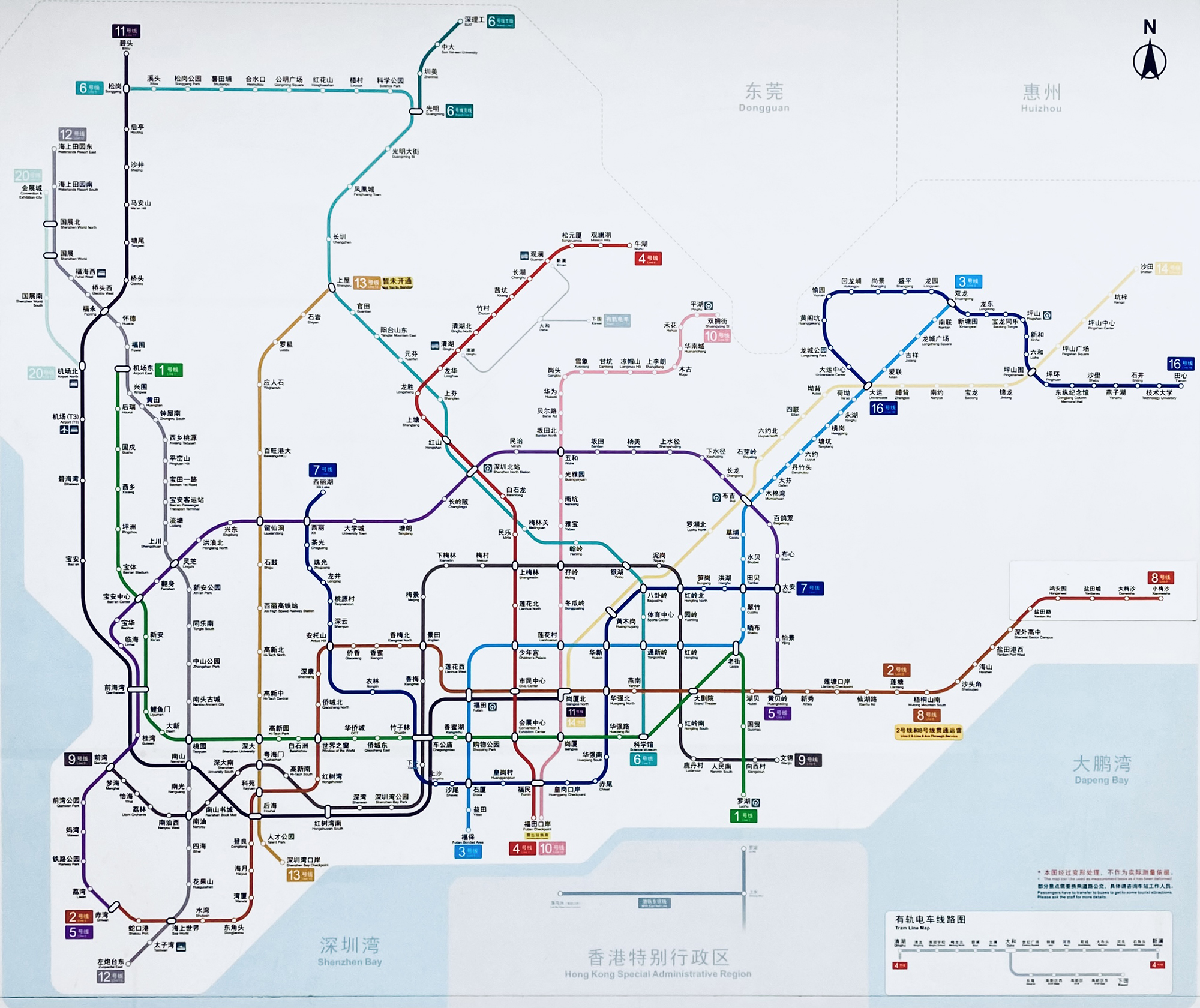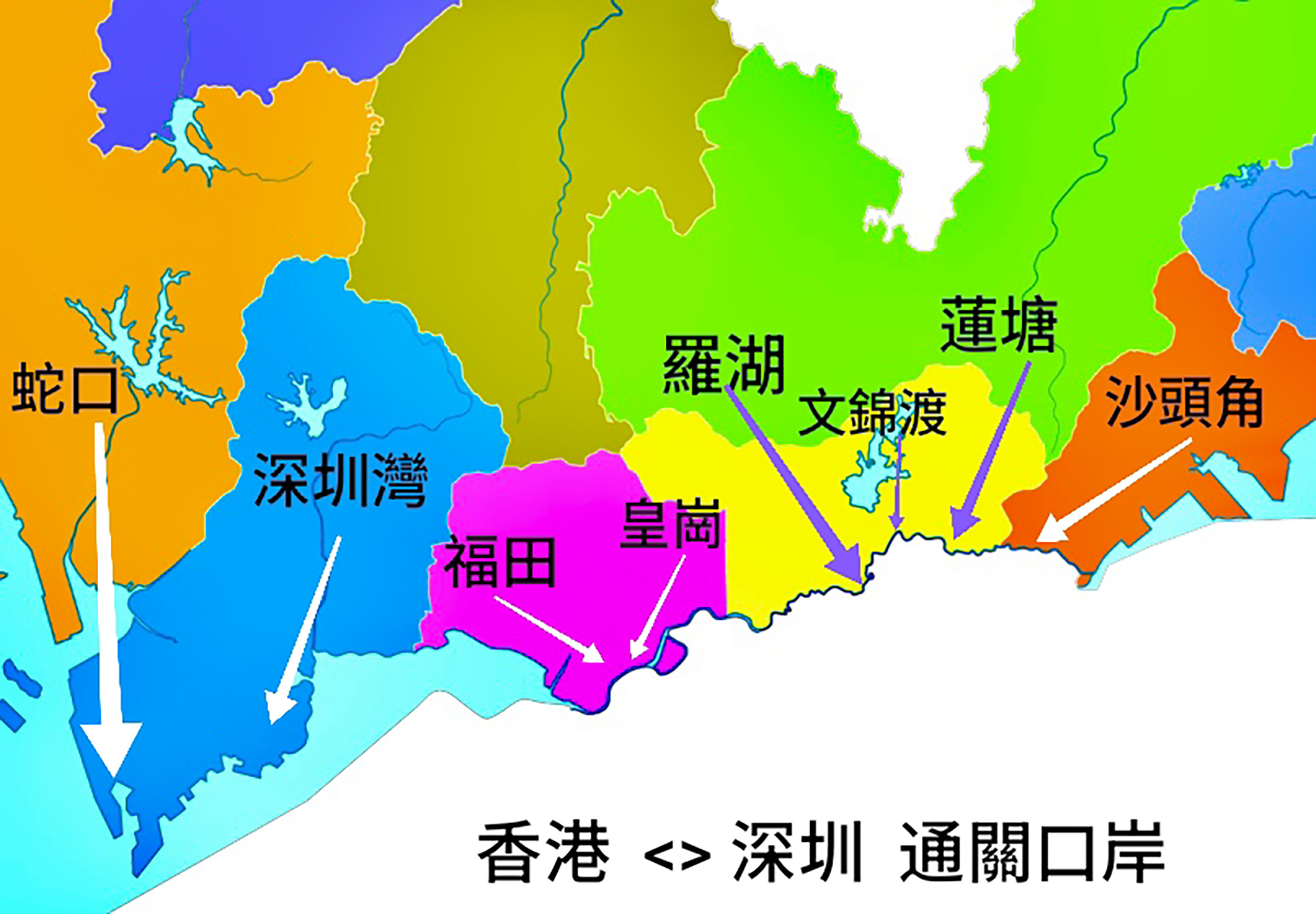 ▲深圳市分區略圖 (2025年5月繪製) ▲深圳地鐵網絡 (2024年12月攝) ▲香港、深圳通關口岸。