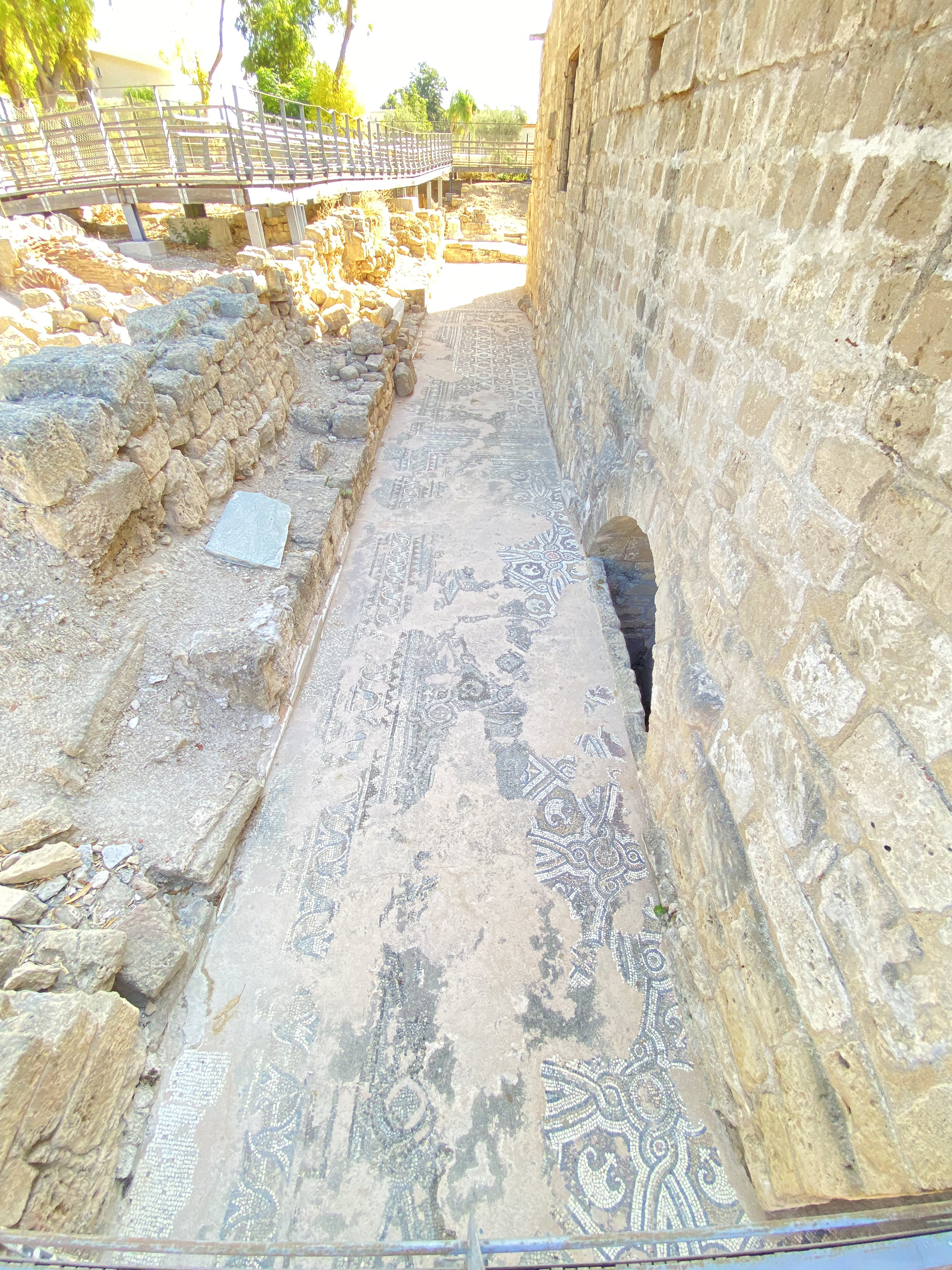 先說The Basilica of Chrysopolitissa,basilica意指「皇者的大廳」,是一種屬於古羅馬風格的建築,特色是長長直直的建築,外伴以圓柱排列的走廊,圓柱的花式設計屬於哥林多式,柱身由堅硬的花崗岩和大理石所造,至於chryso 意指「黃金」而politissa意指「城邦」。原先建築應為區主教生活起居地方,建於公元四世紀(羅馬皇君士坦丁於公元313年頒布《米蘭敕令》,宣布基督教合法地位。)直到七世紀遭多次毀壞,今天只剩下一堆頹垣亂石和破爛圓柱礅。按後來考古發現,原先的遺址共分4個矩形區,旅遊局為方便遊客可以在遺址上觀看而又不會破壞文物,尤其是相當珍貴的壁畫和馬賽克地磚,因此在遺址上安建長長的木條架空走廊,既方便遊客慢步細心欣賞,亦能保持原貌。考古學家相信原先地磚顏色鮮豔,呈現幾何學中的對稱配置,表達出蜜蜂、葡萄葉、十字架等圖案,展現屬於同時期黎巴嫩的風格。