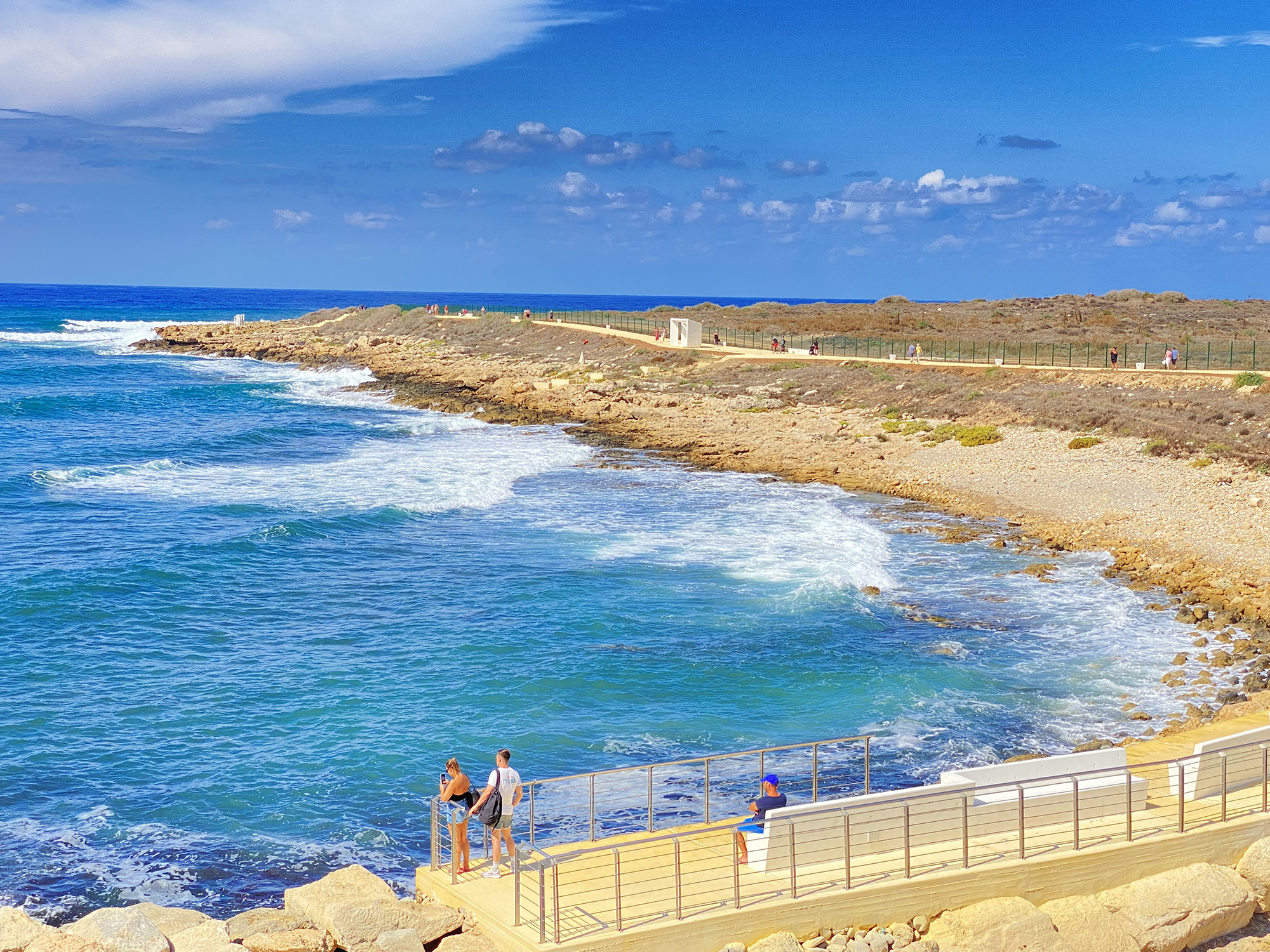 塞浦路斯是地中海內三大島之一(其他兩島是西西里和撒丁),四面環海,地中海在九月陽光下,海面依舊照得璀燦。帕福斯市的氣溫徘徊在三十度攝氏,天氣炎熱乾燥,艷陽高照在蔚藍天,空氣中一點水氣也沒有,遊客躲在墨鏡、草帽和太陽油的保護下,皮膚依舊曬得通紅。在這裏可能沙灘眾多和分散,水中泳客數目比較零星,然而水色即使在岸邊也湛藍通透,清徹無比,喜好游泳人士如我又豈能錯過機會。